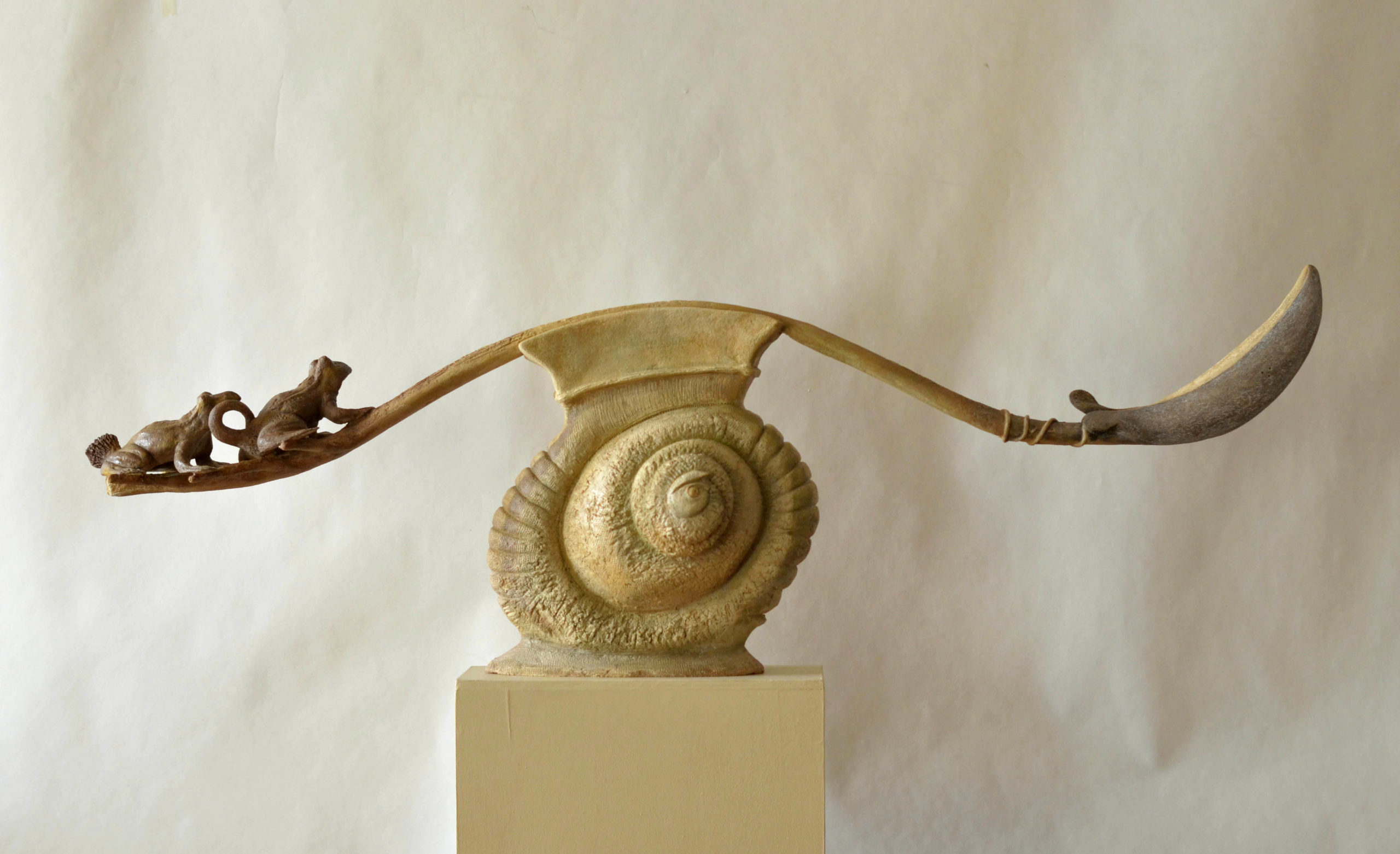 Vorremmo passare ancora un pò di tempo con Paola, ma ora è il momento di due artisti che condividono lo stesso atelier. Arriviamo così in un garage che ospita le opere di Gianni Guidi e Paolo Pallara. Il primo a raccontarsi è Gianni che ci mostra le sue sculture in terracotta dipinta. Le sue opere racchiudono l’idea del volo e della leggerezza, sono costellate da uccelli, fiori e farfalle. Ci mostra le sue campane: ogni campana ha sopra un animale che simboleggia una delle sette note musicali e un momento preciso della giornata. “Questa non è una cosa che ho inventato io, ma una ricerca condotta dal musicologo Marius Schneider”.