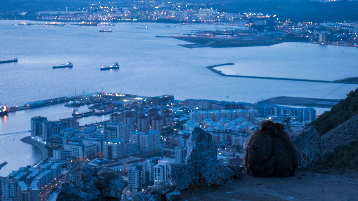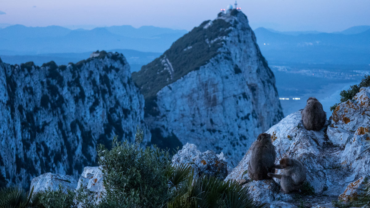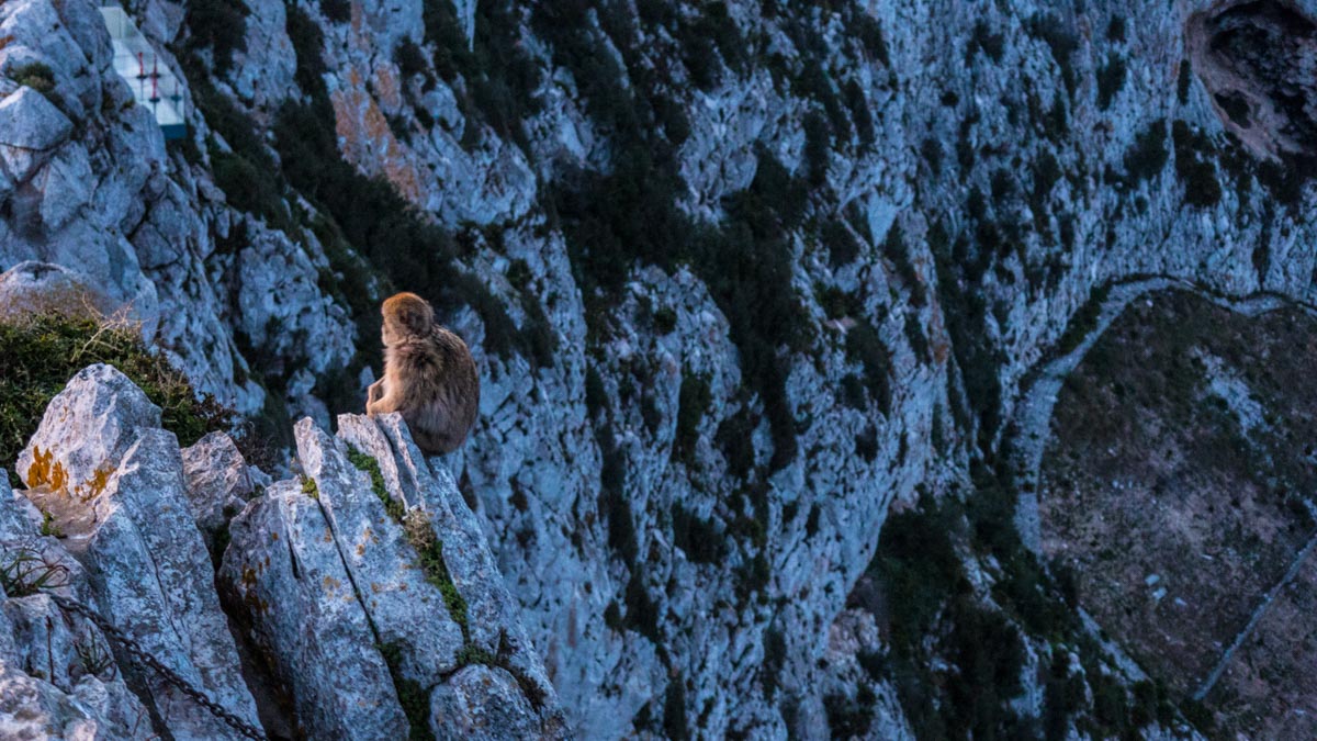 Saliamo rapidi sapendo che quando raggiungi un luogo con fatica la soddisfazione come minimo raddoppia, un’ora scarsa di semicorsa in salita tra strada e sentierini in mezzo alla fitta vegetazione e siamo in cima. Più salivamo più si abbassava la luce a nostra disposizione regalandoci un tramonto in movimento indimenticabile. Abbiamo la fortuna di arrivarci con luce più bella che l’arco delle ventiquattro abbia da offrire, quella mezzora scarsa tra quando il sole scompare dietro l’orizzonte e il buio notturno, riesco anche a scorgere un gruppetto delle famose scimmie di Gibilterra, le uniche in stato di semiliberta dell’intero continente Europeo. Se ne stanno li appese ad uno strapiombo alto più di quattrocento metri appollaiate a godersi il tramonto esattamente come facciamo noi.