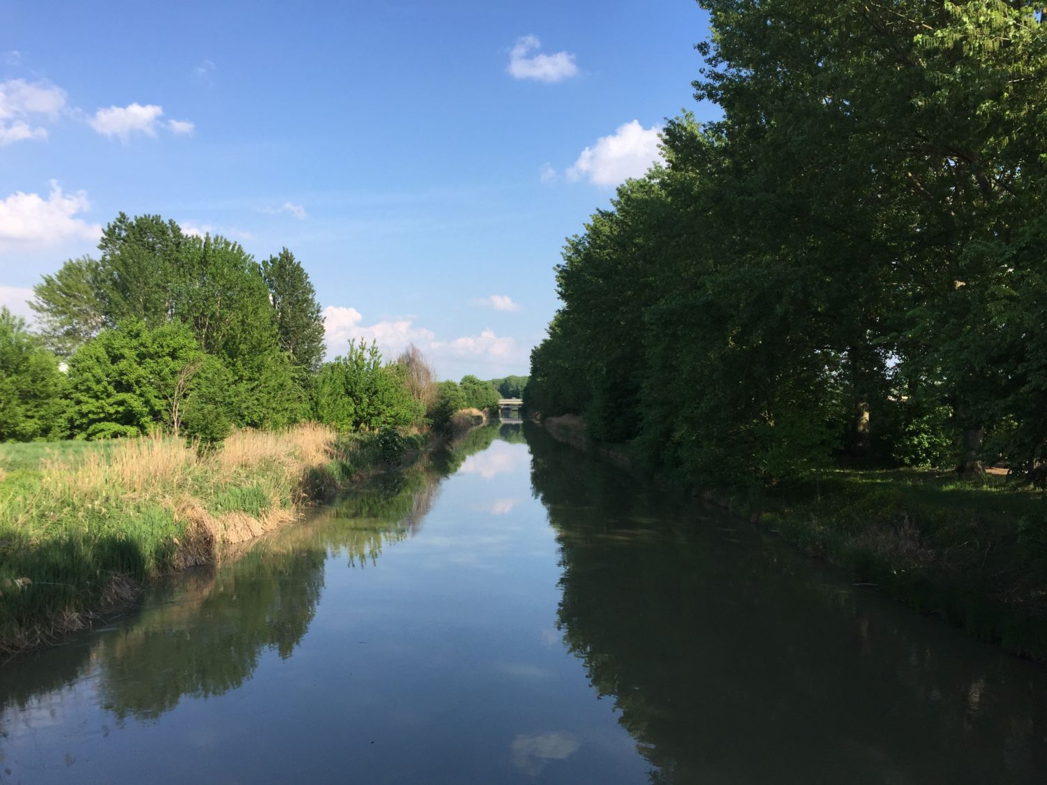 Siamo ormai avviati verso Bondeno: qualche casa agricola di fianco al percorso testimonia la presenza degli agricoltori della zona; i rumori dei mezzi agricoli rompono il silenzio del tragitto. Nelle giornate limpide si stagliano all’orizzonte le prealpi ed i primi avamposti spesso innevati delle stesse Alpi. Passiamo alcuni “casoni” con tanto di reti da pesca sospese sul canale e quasi senza accorgercene stiamo per giungere nella città Matildea. Il sentiero negli ultimi tratti abbandona la riva destra del Burana per portarci su quella sinistra attraverso l’ennesimo ponticello in pietra. Giungiamo ad un paio di piccoli tornanti immersi in una fitta vegetazione per trovarci poi a percorrere il vecchio ponte della ferrovia che ci permette di ammirare e superare il Cavo Napoleonico vero confine naturale aldilà del quale entriamo a Bondeno.