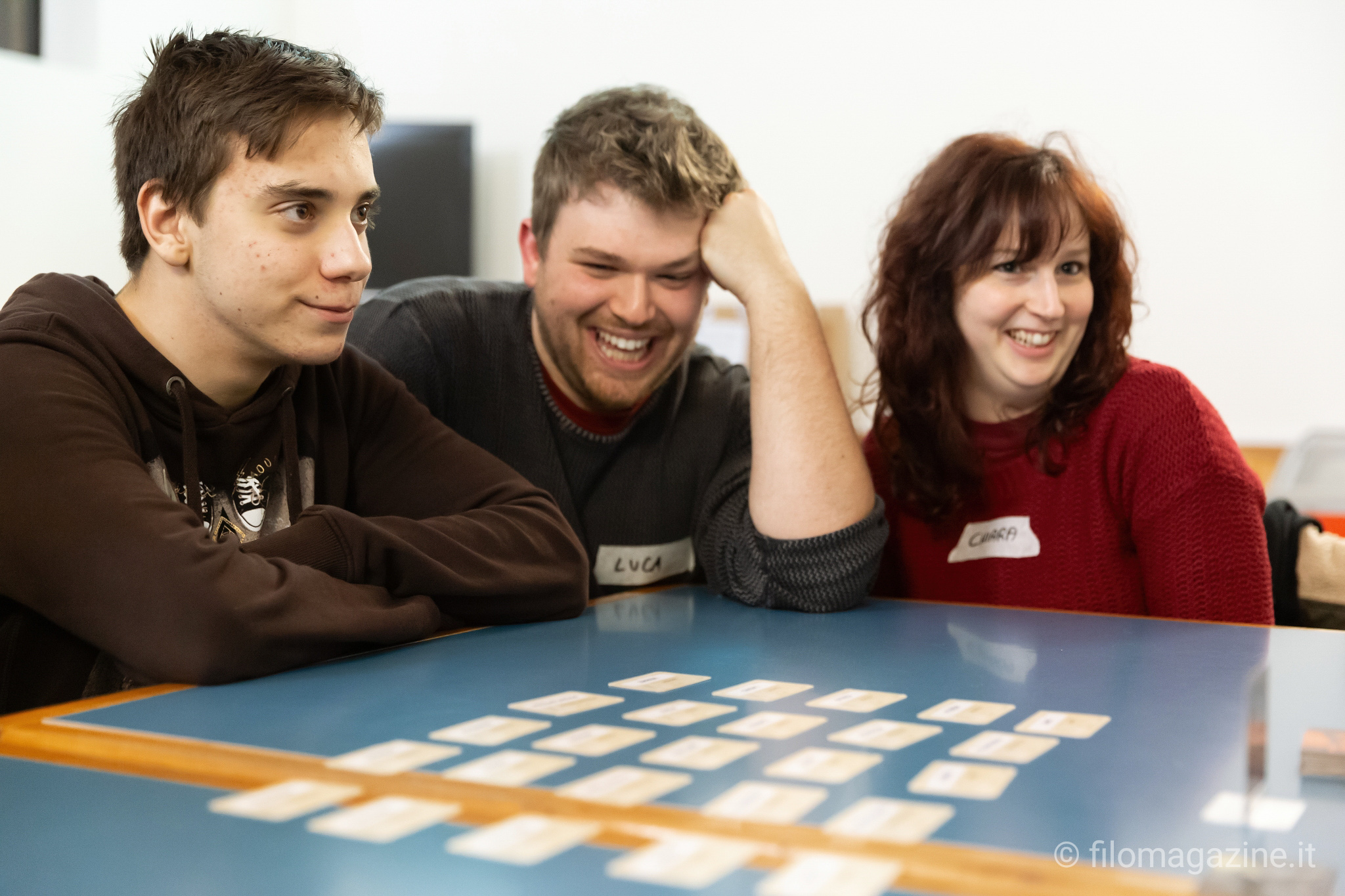 L’accogliente sala dell’associazione è già piena di giocatori all’opera. Luca si presenta e ci invita ad unirci al tavolo. – Quando arrivano ragazzi nuovi solitamente ci attacchiamo il nome in bella mostra, scrivendolo sullo scotch – ci spiega Luca porgendoci rotolo e pennarello; penso che sia una cosa meravigliosa, io, che faccio parte di quella percentuale distratta di persone che non riesce a ricordare più di due nomi alla volta. Tolti dall’imbarazzo di non sapere come richiamare l’attenzione di un compagno di squadra, ci dividiamo in due gruppi per l’inizio della prima partita: stiamo giocando a Nome in codice.