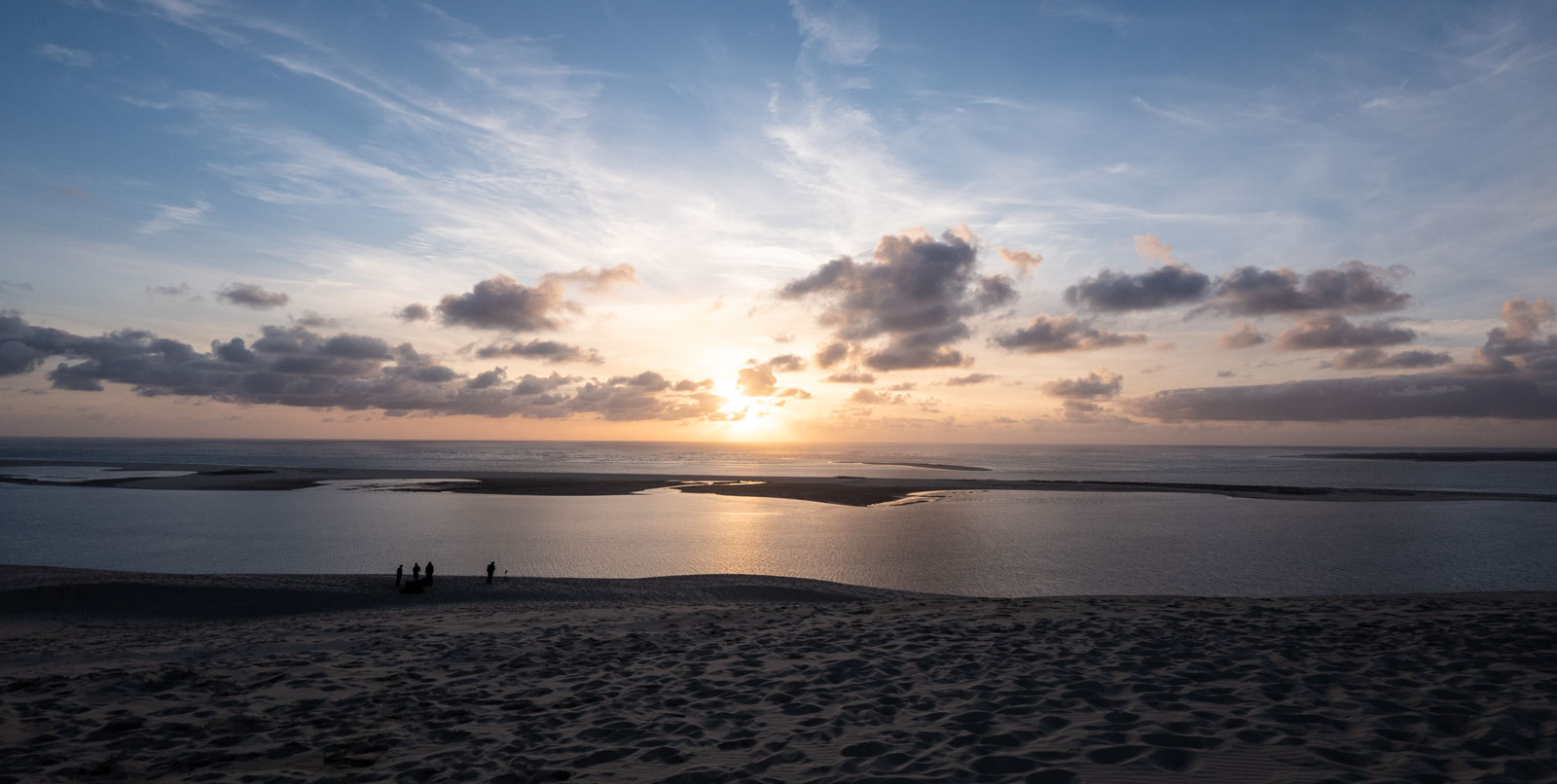 Come fosse più un confine climatico che geografico, la pioggia e il vento della Galizia ci danno finalmente tregua non appena usciamo dalla regione. Santander, San Sebastian e la celebre spiaggia surfista di Zarautz scorrono via con relativa serenità e in breve ci troviamo nuovamente a dover attraversare un altro confino di stato. Il tempo per il primo team di 7milamiglialontano è agli sgoccioli e scegliamo come ultima meta il più grande ammasso di sabbia di tutta Europa. Dormire sotto la Dune du Pilat è come essere al cospetto costante di una immensa onda all’apice della sua altezza. Sono decine e decine di metri di sabbia che si stagliano di fronte ai nostri alloggi, il prezzo da pagare per godersi il fiabesco tramonto o anche solo per vedere il mare è una scalata fino alla cima. Lo spettacolo vale poi tutta la fatica fatta.