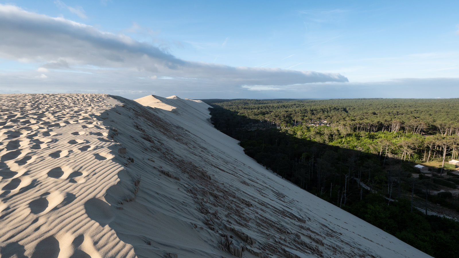 Da una parte l’oceano, dall’altra la fitta foresta della regione dell’Arcachon e al centro una striscia di sabbia lunga 3 chilometri, larga 600 metri e alta fino a 110 metri nei punti più alti, una particolarità naturalistica senza eguali in Europa.