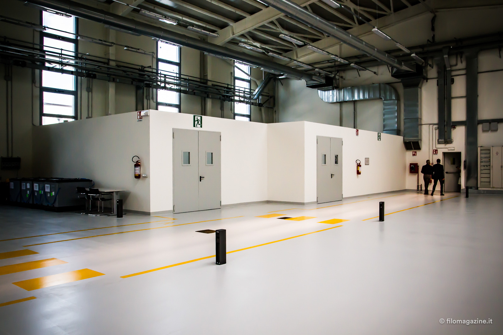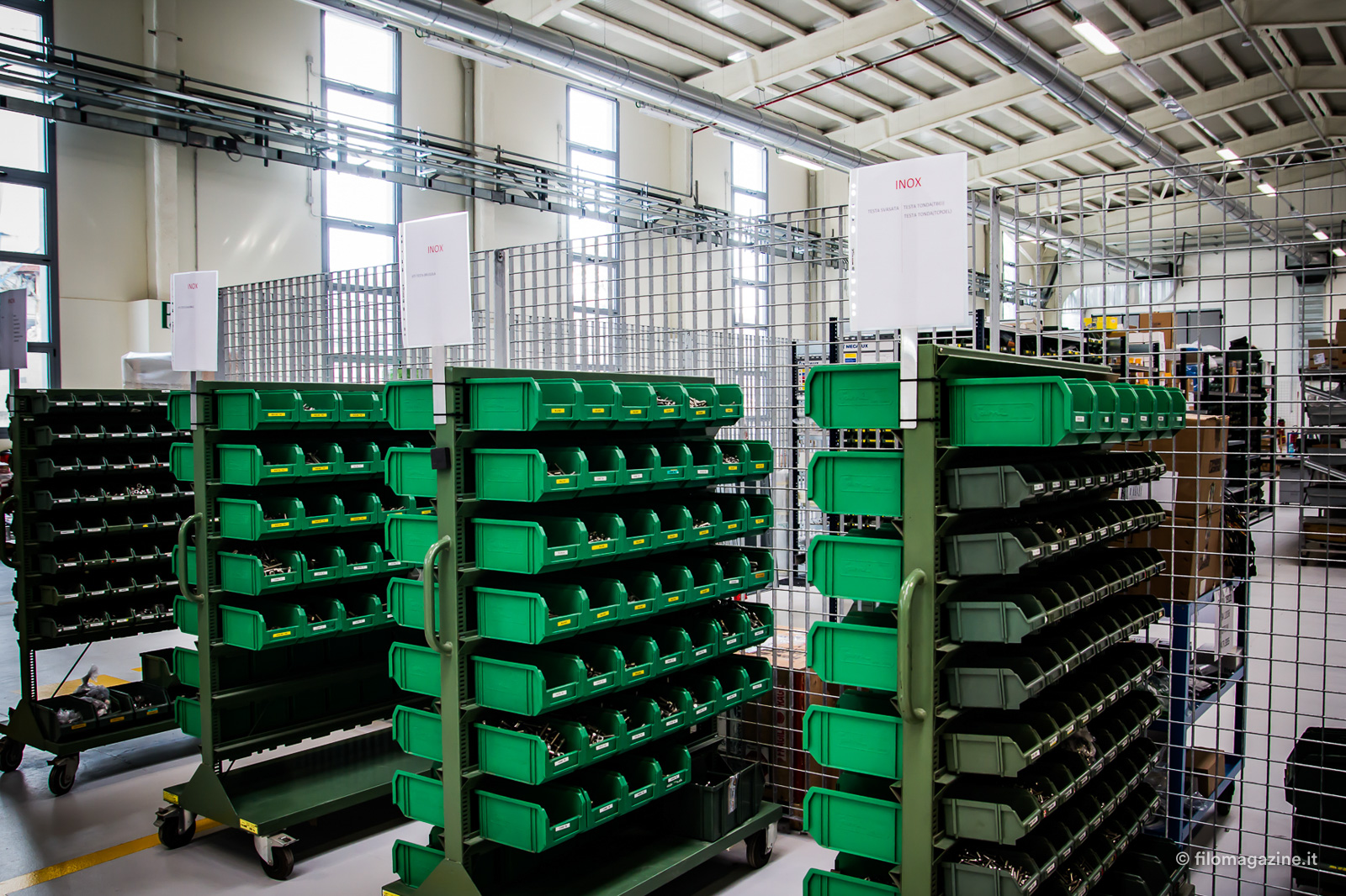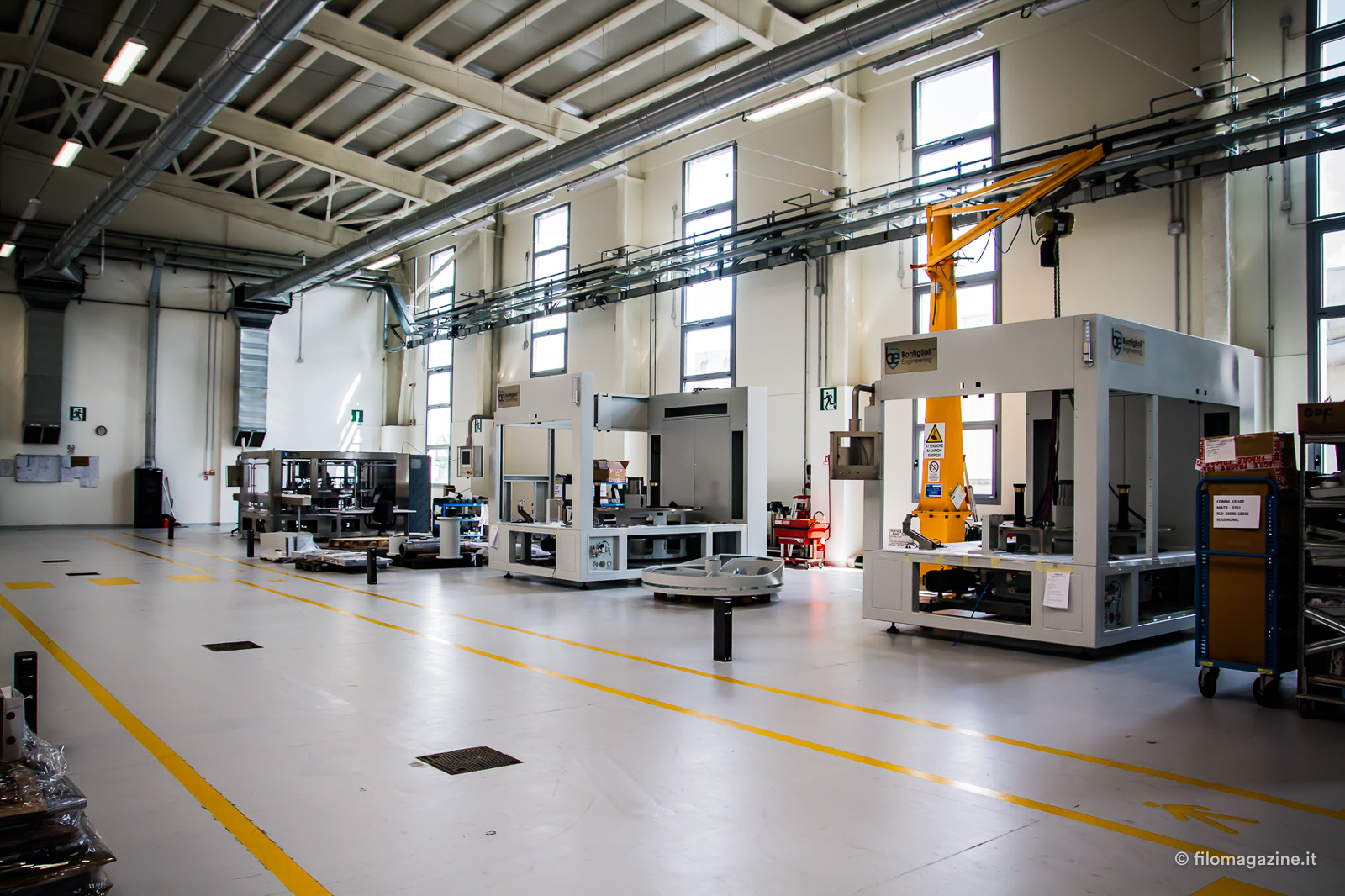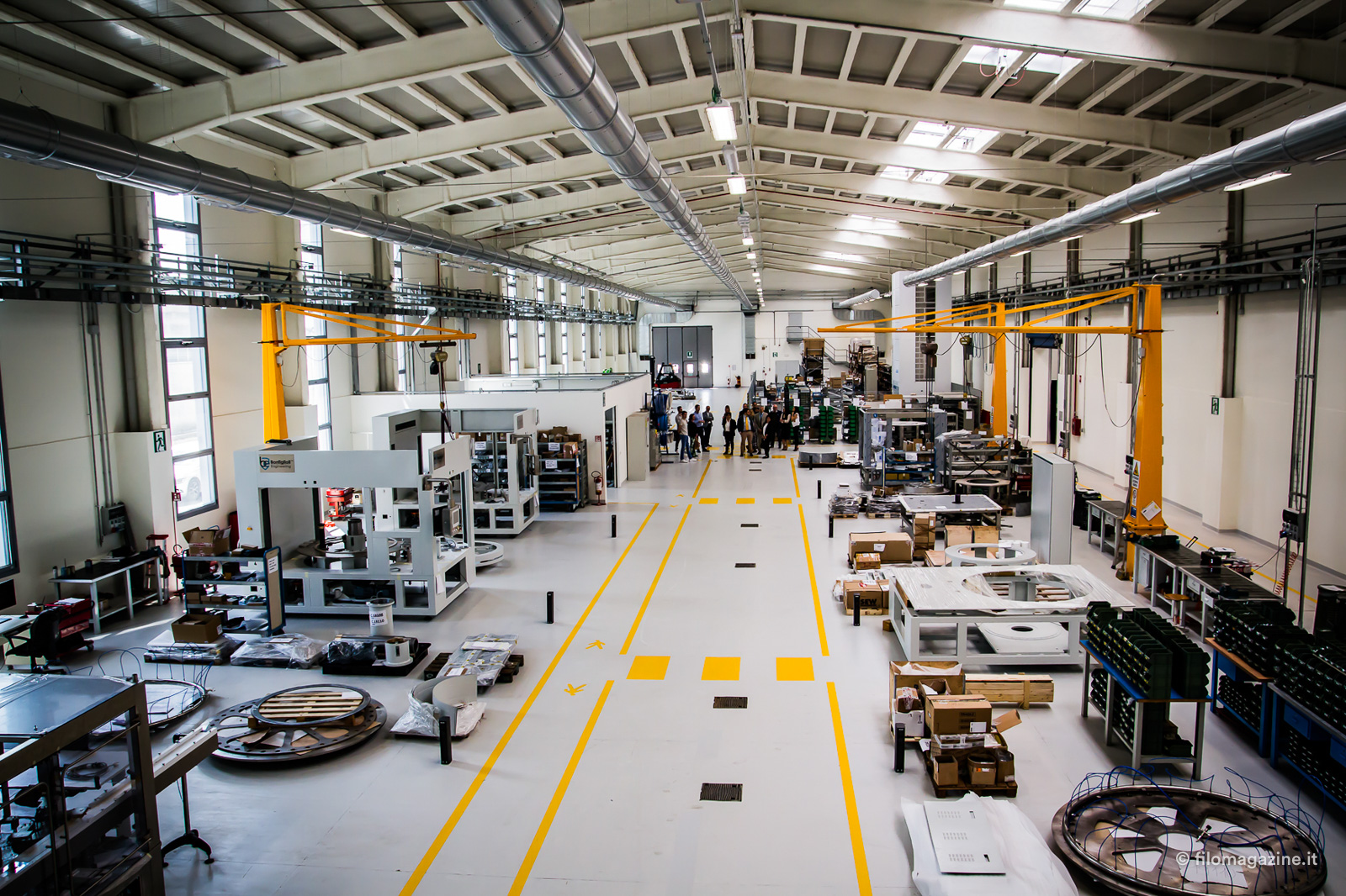 Seguiamo uno dei gruppi di ingegneri che ci conducono alla scoperta di questo nuovo impianto produttivo. Entriamo per prima cosa nell’area di produzione, interamente progettata seguendo i criteri di lean manufacturing, cioè puntando a ridurre gli spostamenti non necessari, sia di cose che di persone tra i vari reparti che compongono la catena produttiva. Una delle scelte conseguenti è stata ad esempio quella di posizionare il magazzino accanto all’area di produzione. Ci viene mostrata poi un’area di stoccaggio temporaneo, che permette di scaricare velocemente i mezzi e un magazzino automatico verticale che velocizza le operazioni di prelievo del materiale.