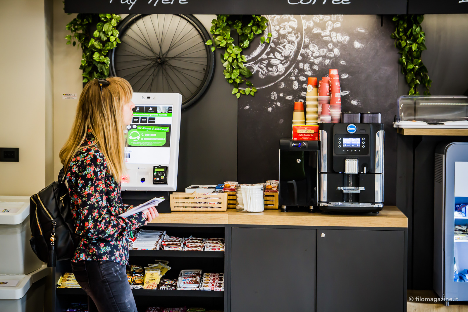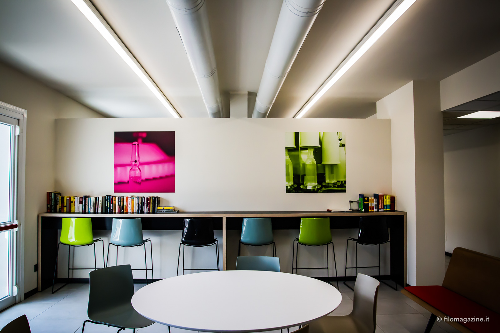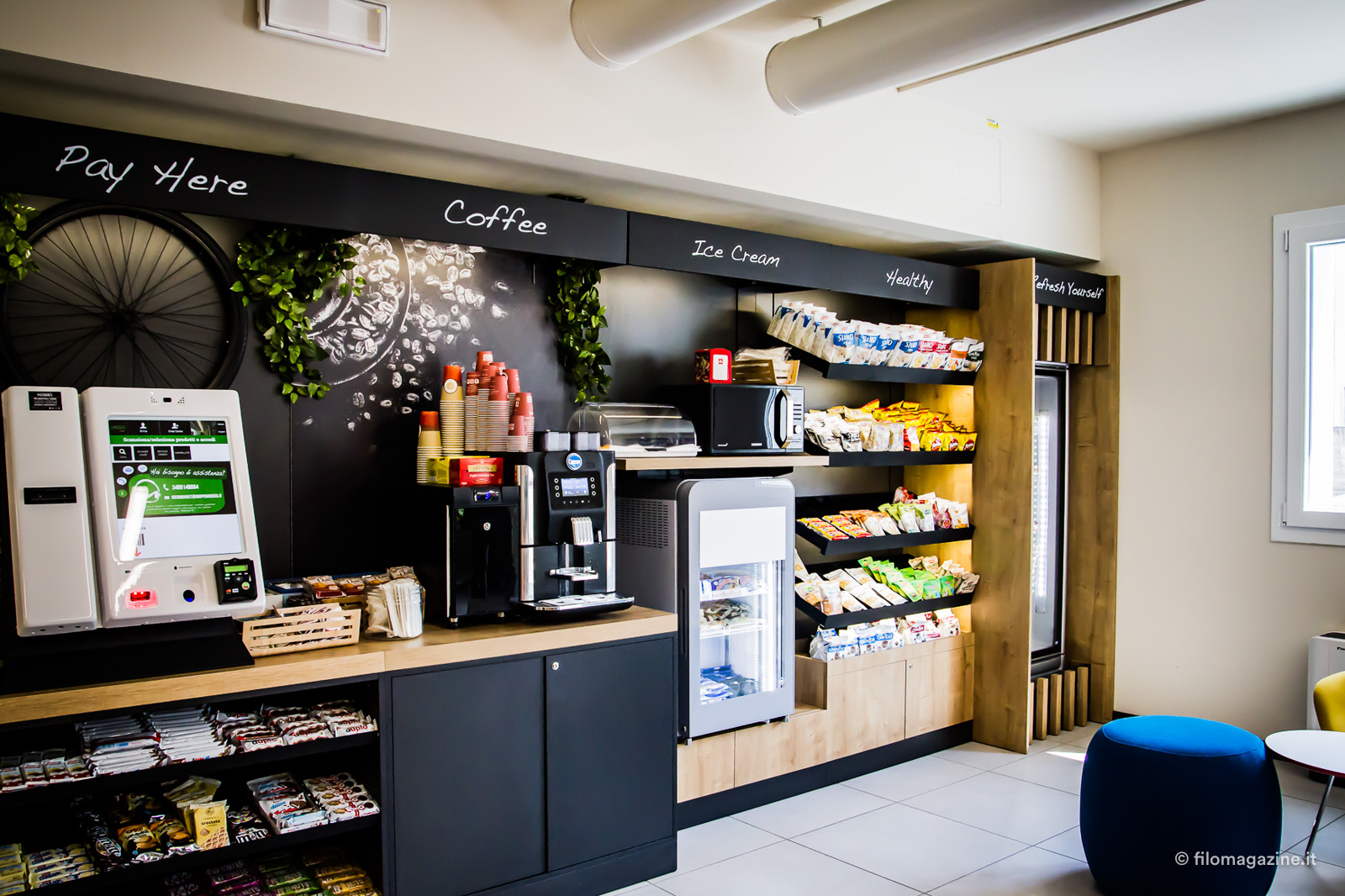 Particolarmente apprezzata è poi la nuova area lounge, e credetemi se vi dico che per un istante mi è sembrato di essere in un film. Qui è disponibile un piccolo market, un servizio sperimentale che Bonfiglioli è tra le prime ad adottare in Emilia Romagna, dove non si trovano solo snack e bevande, ma gelati, piatti pronti e a breve anche frutta e verdura fresche. Tutto si paga tramite POS oppure collegando l’impronta digitale al proprio account personale, sul quale sono caricati anche i buoni pasto dei dipendenti. Una piccola oasi felice, con arredamento luminoso e colorato, studiato per favorire il relax e rafforzare lo spirito di squadra anche al di fuori dei rapporti lavorativi. In fondo alla stanza uno scaffale colmo di libri, che chiunque può prendere in prestito con la collaudata formula del bookcrossing e una macchinetta dell’acqua che non consegna bottigliette ma permette di riempire la propria, per contribuire a ridurre lo spreco di plastica.