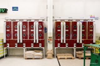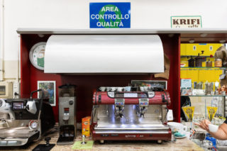 Il profumo forte dei chicchi è impressionante, tra le sale dolcemente rumorose di Krifi. “Io non lo sento nemmeno più” dice Guido con una punta di soddisfazione. Su una parete, una decina di orologi scandiscono la storia del marchio: i quadranti colorati raffigurano i diversi loghi dell’azienda, persino il primo, degli anni ‘60, quando Krifi era scritto con la C, dall’unione dei cognomi di Cristofori e Filippini. Guido ci accompagna lungo il percorso di tostatura del caffè, descrivendoci sapientemente ogni fase; dalla pulizia del caffè verde, alle buste che conoscono bene i gestori di tantissimi bar in città. I chicchi volano da un lato all’altro, all’interno di tubi trasparenti che li portano nei grandi silos; poi scendono a pioggia nelle vasche per essere controllati dal personale. I racconti di Guido parlano di chicchi che vengono da lontano, sacchi di iuta, bacche rosse da sbucciare, con una precisione insolita “…chi lavora nel caffè non smetterà mai di imparare, per tutta la vita. Bisogna essere formati, conoscere bene il proprio ambito”; e mi chiedo quanti anni abbia realmente il ragazzo che ho davanti.