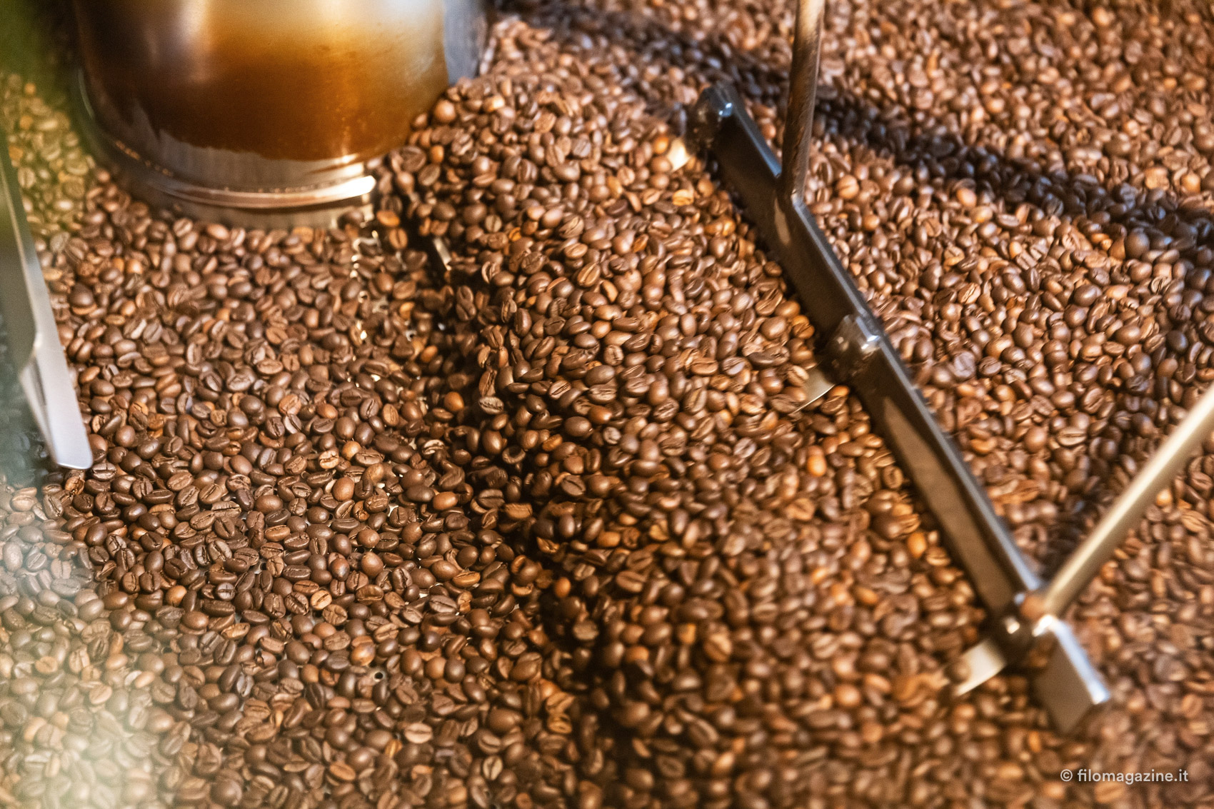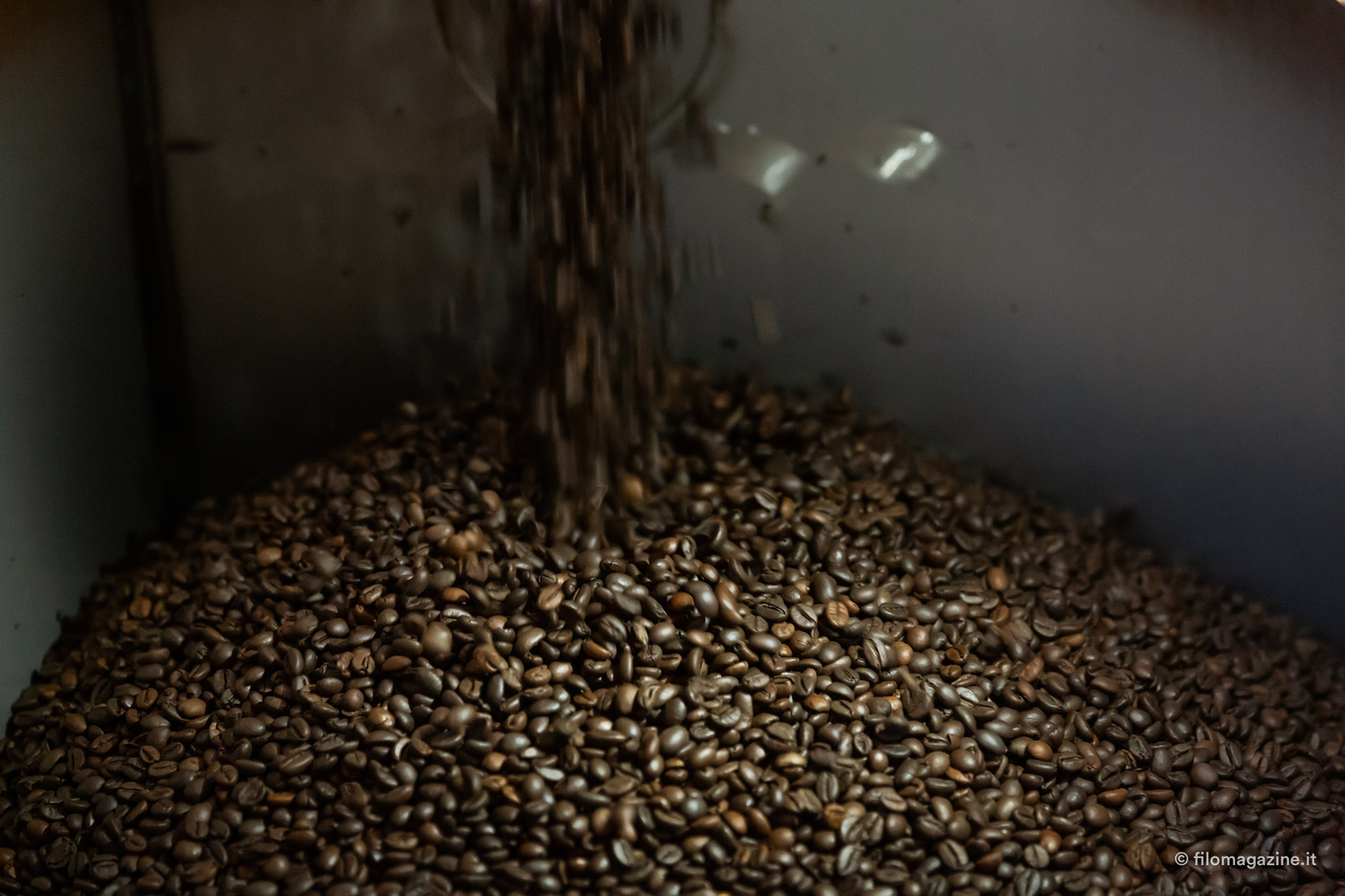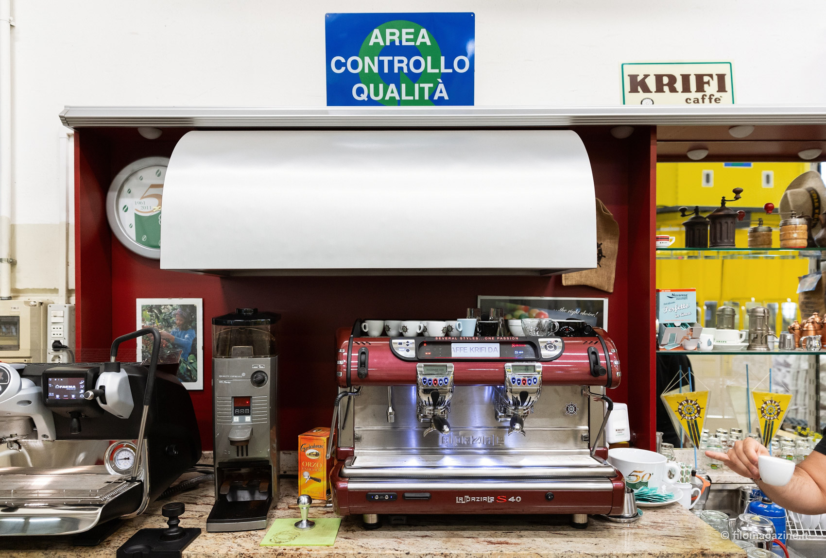 Il profumo forte dei chicchi è impressionante, tra le sale dolcemente rumorose di Krifi. “Io non lo sento nemmeno più” dice Guido con una punta di soddisfazione. Su una parete, una decina di orologi scandiscono la storia del marchio: i quadranti colorati raffigurano i diversi loghi dell’azienda, persino il primo, degli anni ‘60, quando Krifi era scritto con la C, dall’unione dei cognomi di Cristofori e Filippini. Guido ci accompagna lungo il percorso di tostatura del caffè, descrivendoci sapientemente ogni fase; dalla pulizia del caffè verde, alle buste che conoscono bene i gestori di tantissimi bar in città. I chicchi volano da un lato all’altro, all’interno di tubi trasparenti che li portano nei grandi silos; poi scendono a pioggia nelle vasche per essere controllati dal personale. I racconti di Guido parlano di chicchi che vengono da lontano, sacchi di iuta, bacche rosse da sbucciare, con una precisione insolita “…chi lavora nel caffè non smetterà mai di imparare, per tutta la vita. Bisogna essere formati, conoscere bene il proprio ambito”; e mi chiedo quanti anni abbia realmente il ragazzo che ho davanti.