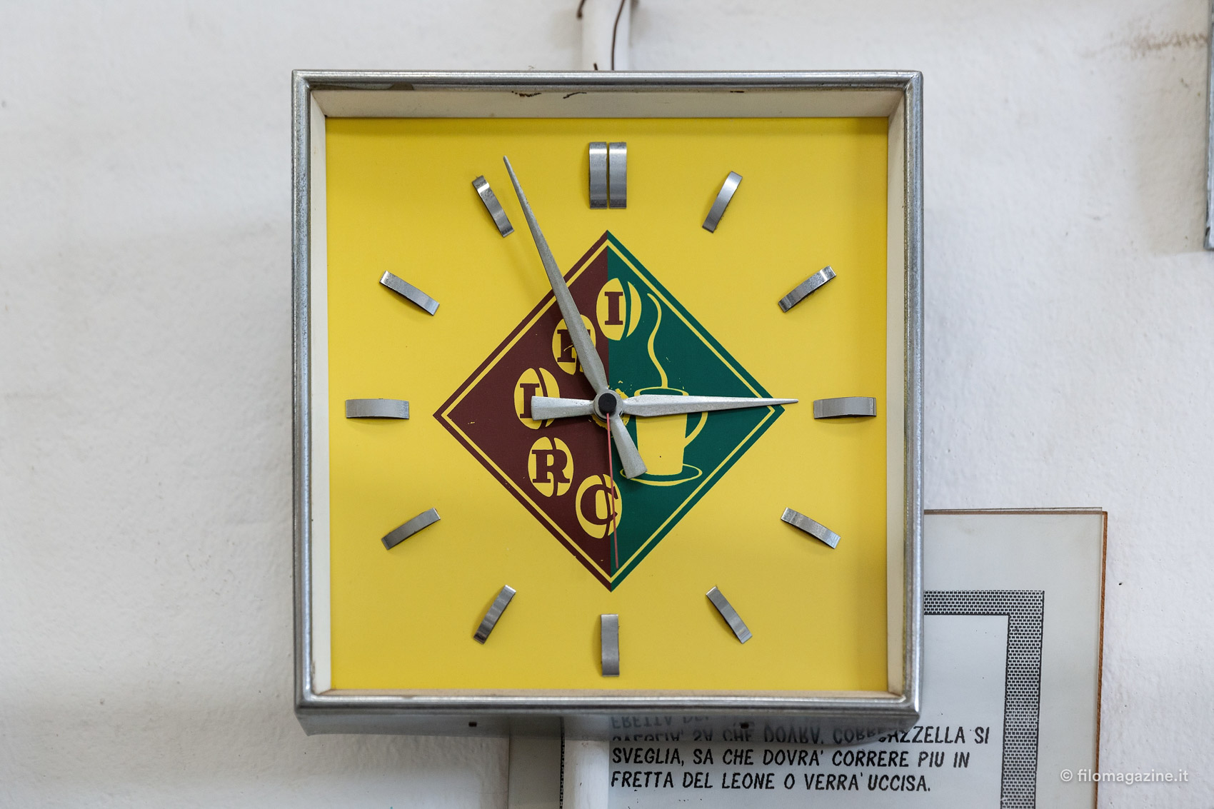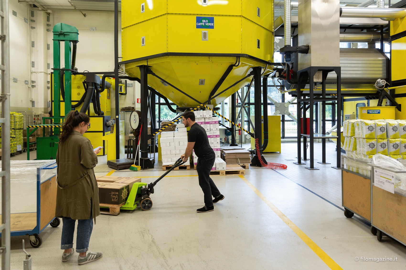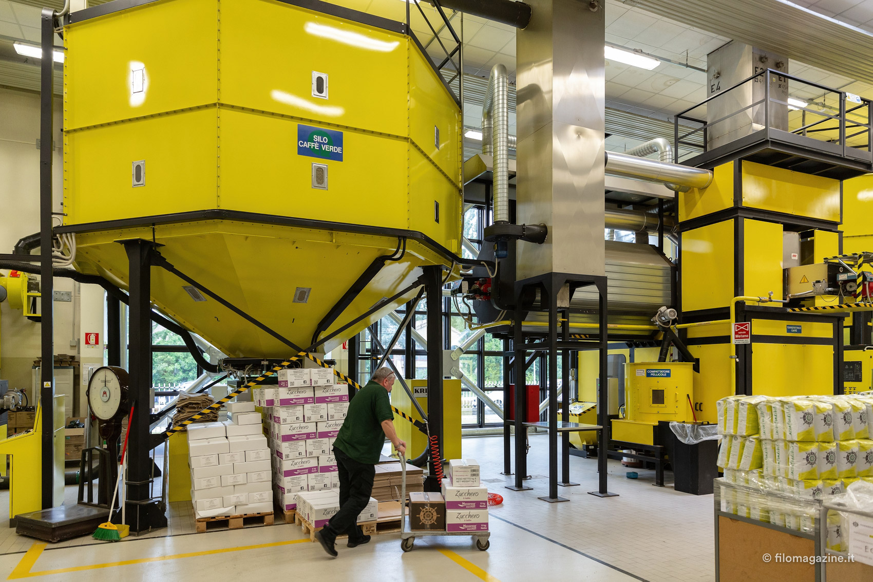 Il profumo forte dei chicchi è impressionante, tra le sale dolcemente rumorose di Krifi. “Io non lo sento nemmeno più” dice Guido con una punta di soddisfazione. Su una parete, una decina di orologi scandiscono la storia del marchio: i quadranti colorati raffigurano i diversi loghi dell’azienda, persino il primo, degli anni ‘60, quando Krifi era scritto con la C, dall’unione dei cognomi di Cristofori e Filippini. Guido ci accompagna lungo il percorso di tostatura del caffè, descrivendoci sapientemente ogni fase; dalla pulizia del caffè verde, alle buste che conoscono bene i gestori di tantissimi bar in città. I chicchi volano da un lato all’altro, all’interno di tubi trasparenti che li portano nei grandi silos; poi scendono a pioggia nelle vasche per essere controllati dal personale. I racconti di Guido parlano di chicchi che vengono da lontano, sacchi di iuta, bacche rosse da sbucciare, con una precisione insolita “…chi lavora nel caffè non smetterà mai di imparare, per tutta la vita. Bisogna essere formati, conoscere bene il proprio ambito”; e mi chiedo quanti anni abbia realmente il ragazzo che ho davanti.