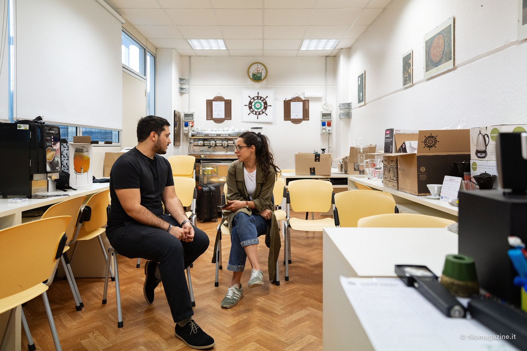 “Posso offrivi un caffè?”, ci accoglie Guido Baroni, amministratore delegato dell’azienda, un giovane prodigioso che ha deciso di dedicarsi alla sua attività con una passione rara. “Io non lo bevevo nemmeno il caffè prima di entrare in azienda! Sono arrivato qui nel 2012, dopo aver capito che l’università non faceva per me; volevo entrare il prima possibile nel mondo del lavoro, capirne il funzionamento, e ho pregato mio padre ed il titolare di assumermi, disposto ad affrontare qualsiasi mansione. Per formarmi ho fatto diversi corsi; sono diventato assaggiatore di caffè, poi trainer e finalmente, nel 2013, sono stato integrato nell’ufficio amministrativo della finanziaria. Nel 2016 mi sono spostato sullo sviluppo del marchio. Mi sono trovato a dover spiegare le mie intenzioni, le mie idee a livello di immagine, e alla fine, in quell’anno, Krifi ha deciso di investire su questo tipo di innovazione ed aggiornarsi. Innanzitutto ho ripreso e rimodernato il logo originale dell’azienda, il timone, rivisitando anche il colore dei pacchi. Sempre a quell’epoca abbiamo cominciato a riflettere anche sull’idea di una caffetteria contemporanea: quello che sta nascendo adesso, con Foggy Mug, ha origine proprio nel 2016 in realtà”.