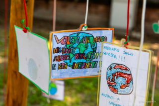 Susanna mi elenca tutte le splendide attività realizzate nel percorso di Adottiamo un’aiuola dai bimbi della Poledrelli e della Bombonati, sempre supportati da un team di insegnanti propositivi e da collaboratori anche inusuali. “C’è stato un graditissimo aiuto da parte di un gruppo di persone attualmente residenti nella casa circondariale di Ferrara. Il gruppo di detenuti del Carcere di Ferrara che danno vita ad alcuni prodotti artigianali, gli Artenuti, hanno infatti aiutato i piccoli rivoluzionari a ricreare gli spazi immaginati, costruendo delle casette per gli uccellini, delle panchine e anche un preziosissimo alberello per i pensieri, le riflessioni nate dal lavoro svolto.