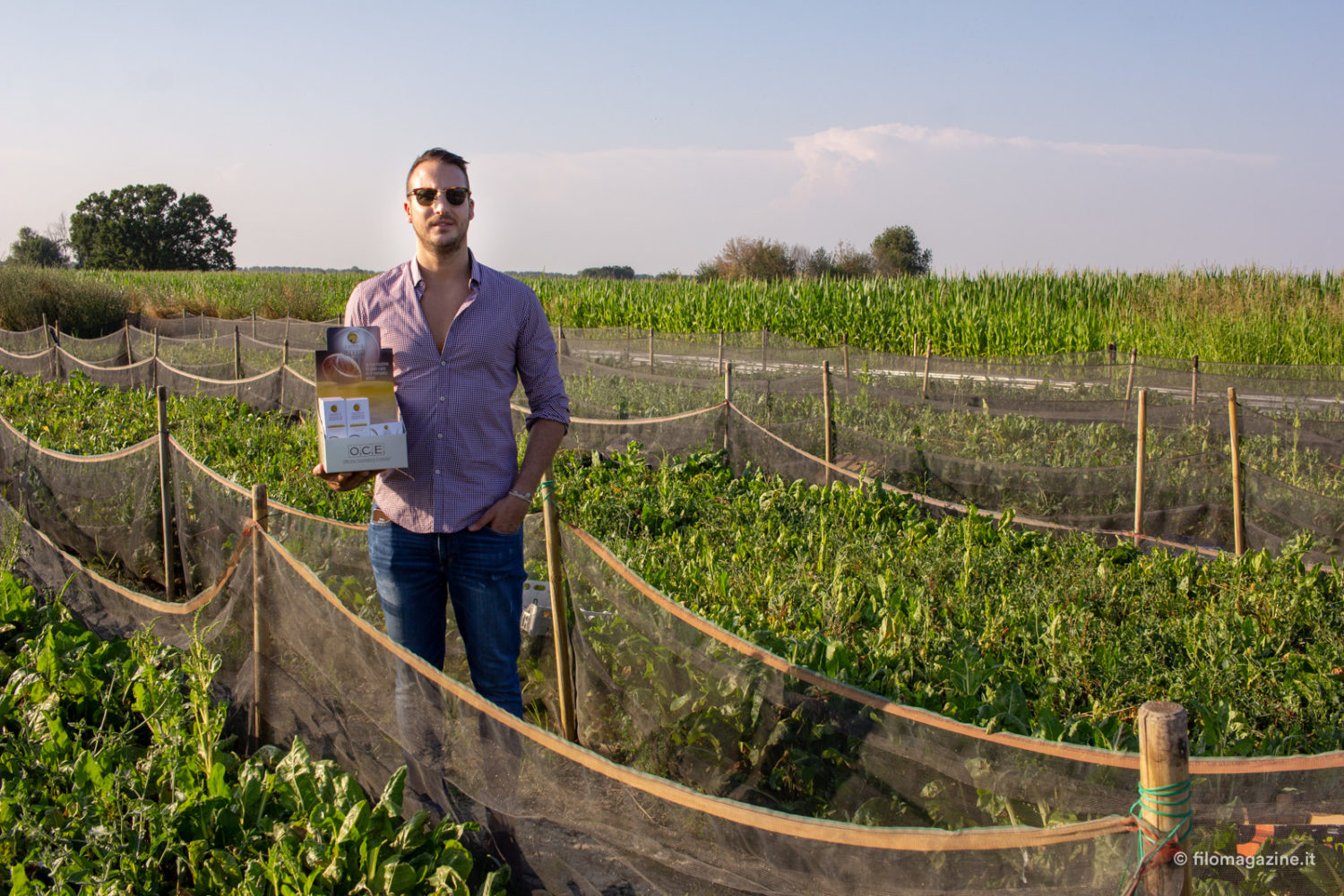 Luca ci spiega: “Come società agricola abbiamo il banchetto al mercato coperto di Coldiretti in via Montebello a Ferrara, dove oltre ai nostri prodotti come miele e verdure di stagione stiamo inserendo anche i prodotti di Officina Cosmetica Estense. La nostra società è nata circa due anni e mezzo fa, subito ci siamo dedicati all’apicoltura e in un secondo momento abbiamo costruito l’impianto elicicolo. L’idea era di lanciarci un giorno nel mondo cosmetico e l’opportunità che si è creata con questo tipo di filiera ci ha dato uno stimolo per migliorare. Abbiamo dodici recinti da circa centocinquanta metri quadrati. Essendo associati all’Istituto Internazionale di Elicicoltura di Cherasco utilizziamo il metodo della migrazione naturale: i recinti sono suddivisi in zone di riproduzione e zone di ingrasso. L’alimentazione è fondamentalmente bieta, ma vengono distribuite anche insalate amare e radicchi che si utilizzano come copertura perché di fatto le chiocciole non li mangiano. All’esterno viene poi seminata un’alimentazione integrativa: cavoli e girasoli, e, insieme ad Helixpharma, stiamo provando a seminare diverse tipologie di vegetali cosicché in laboratorio si possano fare analisi per capire qual è l’alimentazione più efficace per i nostri scopi.”