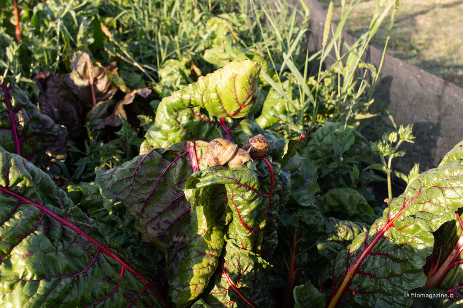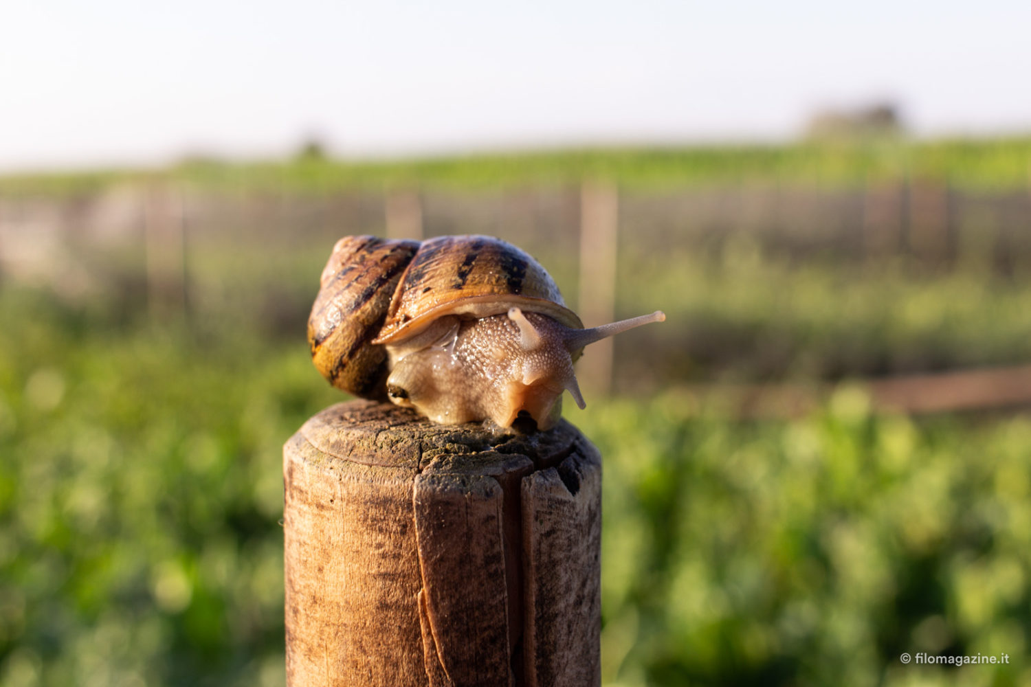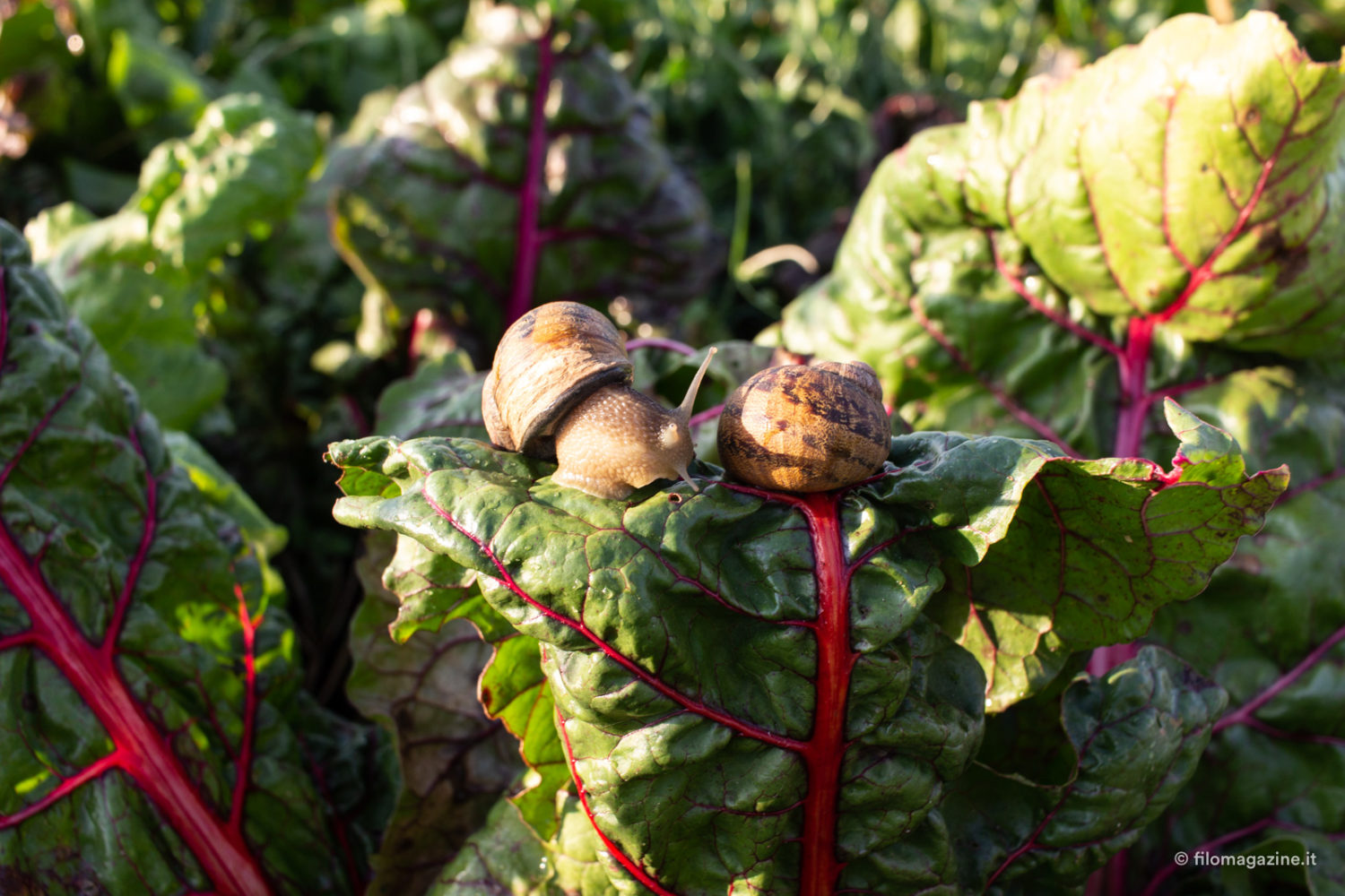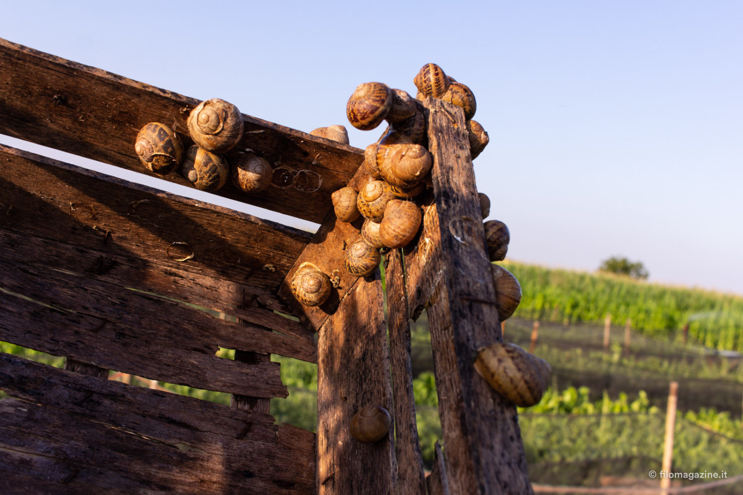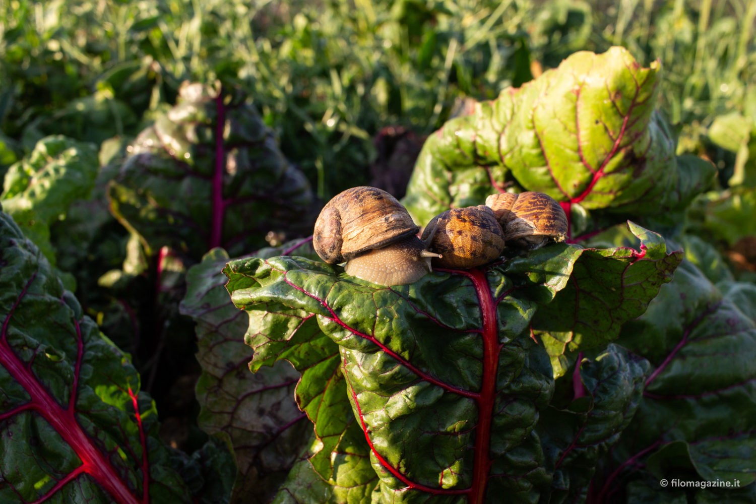 “Mi fa piacere portarvi qui a vedere da dove nasce tutto, cioè dalla terra, capace di darti tanto con poco. Se vi portavo nel laboratorio non avreste capito il senso di tutto questo progetto”, dice Francesco. Ha decisamente ragione, non avremmo ad esempio potuto osservare le piccole corna che uscendo timidamente dal loro guscio cercano di allontanarsi fieramente dai disturbatori venuti a trovarle oggi.