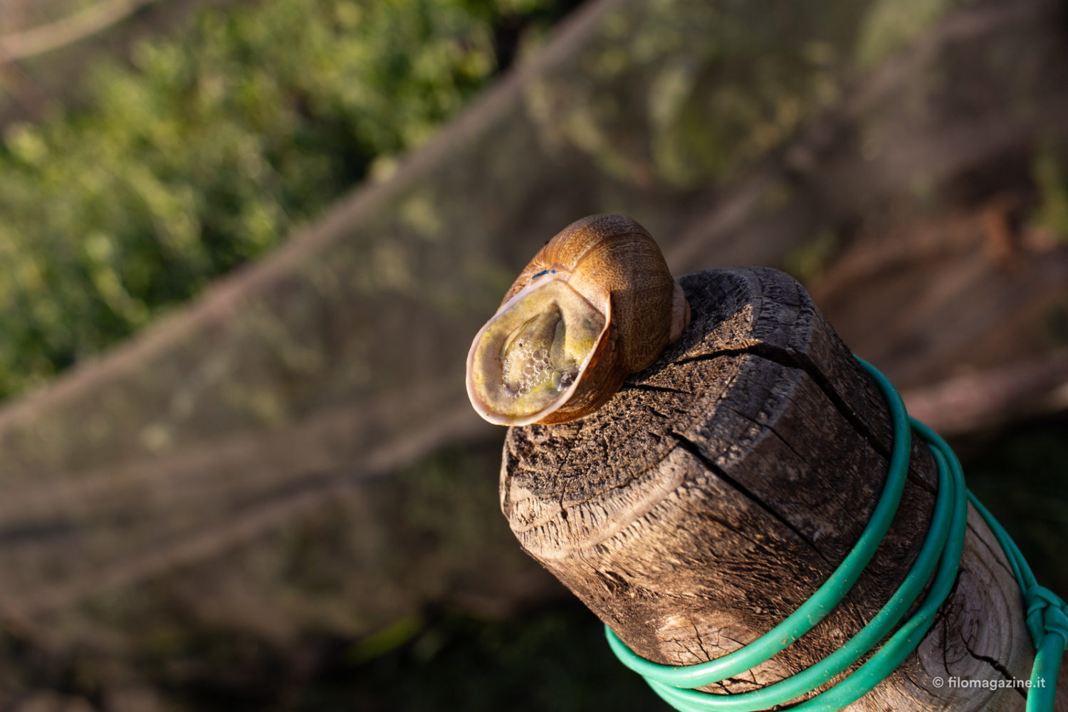 Alcune chiocciole iniziano ad uscire allo scoperto, altre trovano rinfresco dentro una cassetta di legno in mezzo alle foglie. Luca ci spiega quanto sia difficile allevarle, anche per via di predatori come topi e gazze sempre all’erta, ai quali ora cercano di far fronte grazie ad alcuni gatti lasciati liberi nella zona.