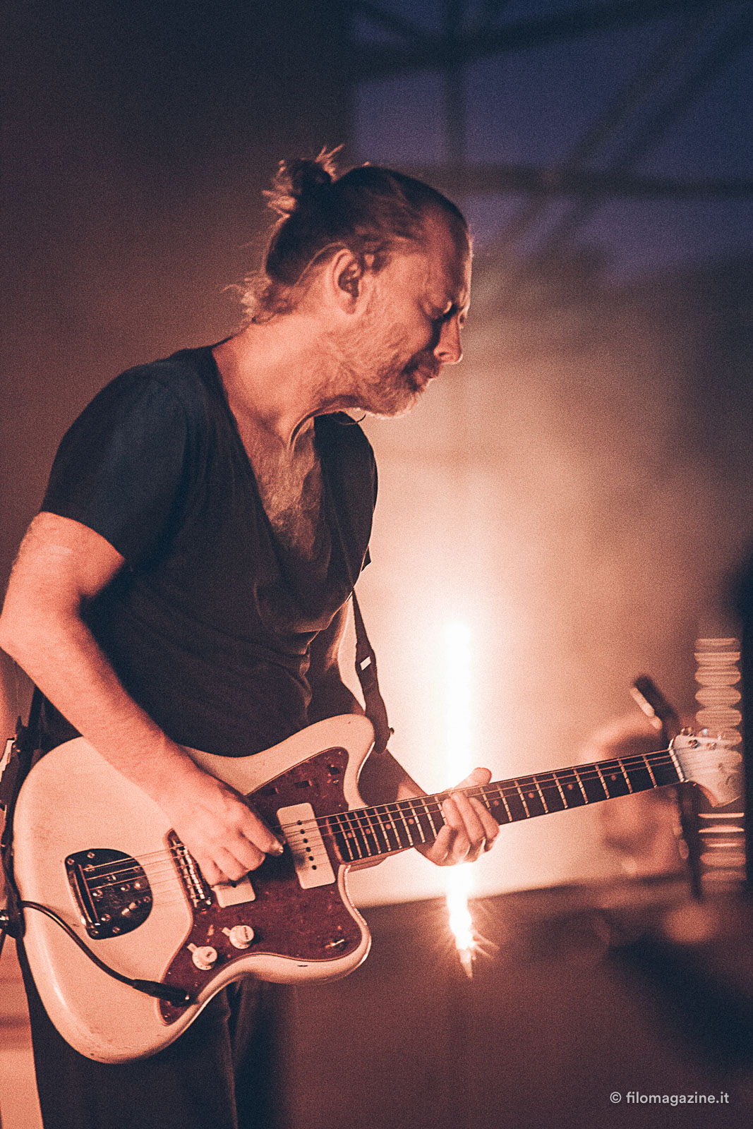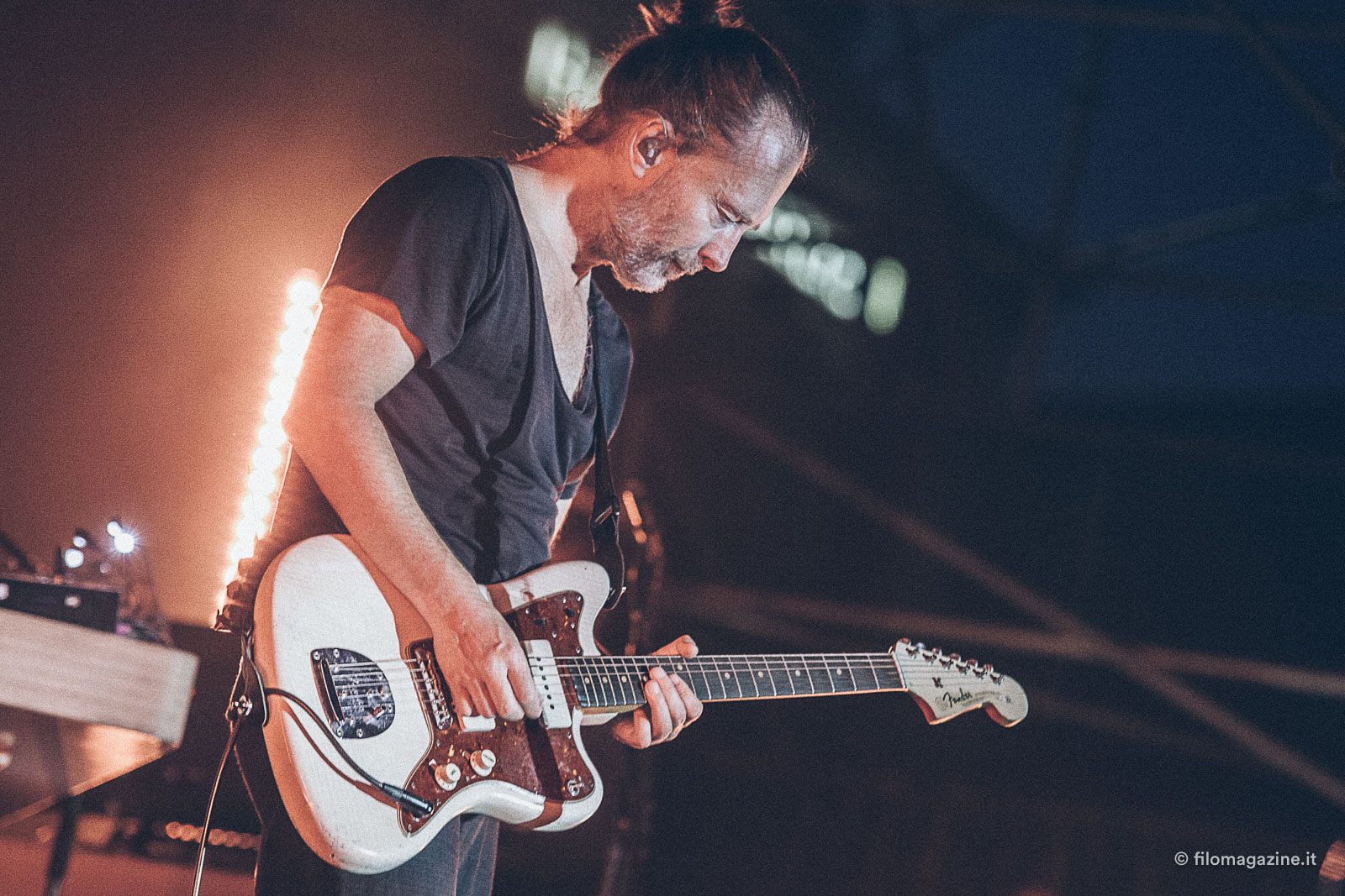 Eppure in questa piazza questa ansia e questo disagio si sono convogliati in sorrisi e danze. In una celebrazione condivisa. Il viso di Thom Yorke era splendente, il sorriso emozionante. Le spalle dritte, i balli (come dimenticare le scomposte e adrenaliniche esibizioni su Idioteque di un decennio fa) sono diventati armonici, totalmente a tempo, fieramente orgogliosi di un mondo sonoro ricreato ad arte nello scenario dal vivo.