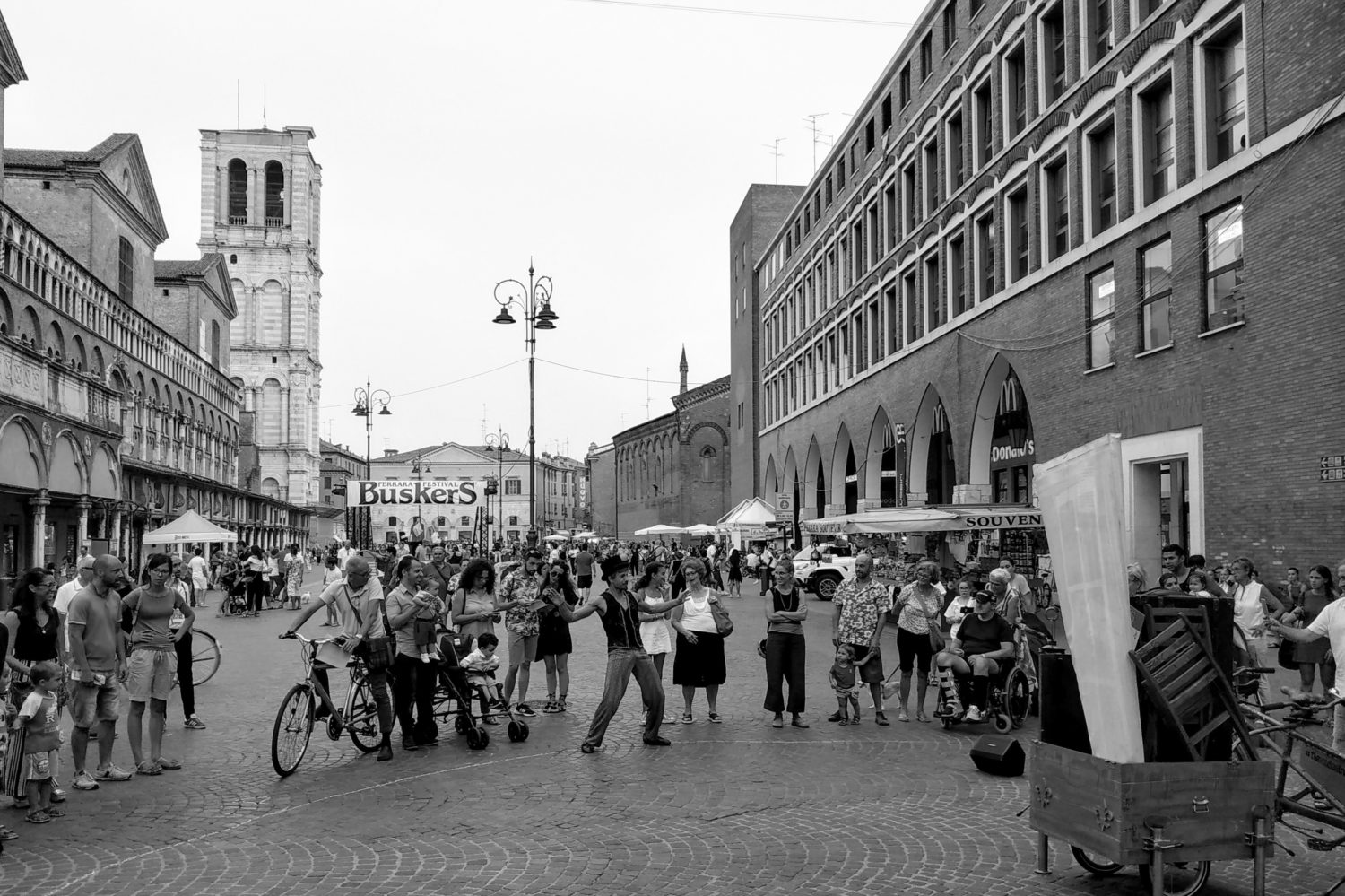 Ora invece sembri abbracciare in tutto e per tutto il centro storico, compreso il cortile del Castello Estense, che rimane il centro informativo e la chiusura naturale di ogni serata allo scoccare della mezzanotte, per dare il via a quelle sessioni libere che da sempre fanno parte del programma. Appari più raccolto, più istituzionale, o forse solo meglio organizzato e allo stesso tempo meno istintivo: lasci l’idea che sia tutto ben gestito con spazi e tempi, ecologico e portatore di una gestione compatibile con la città. Magari questo ti concede meno libertà, un pelo meno di energia, ti fà sentire meno libero di travolgere le vie con una esibizione mai vista.