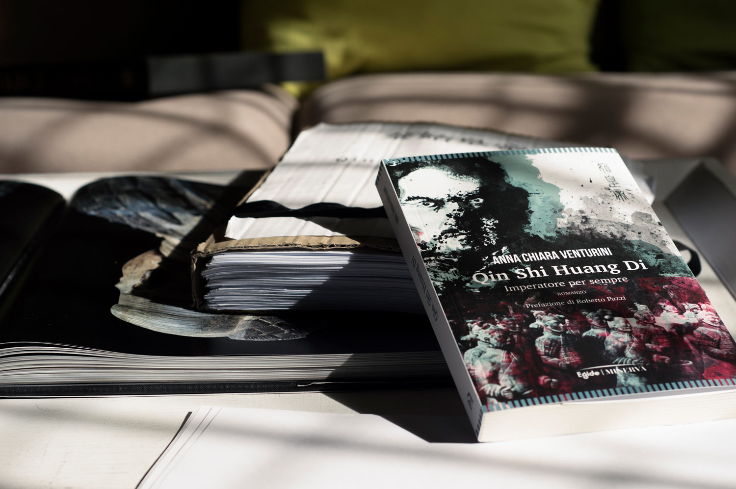 Un romanzo… se lo rigira tra le mani, ne ha un’intera pila di copie nella ricca libreria dietro le sue spalle, ma la sua è piena di scritte, sottolineature e appunti. È già stato letto e riletto, pubblicato, è in tutte le librerie – certamente farebbe ancora modifiche o piccole integrazioni. Anna Chiara Venturini è una ferrarese “sul pezzo”, che ti travolge con un ritmo e un piglio che non ti aspetti, ma che si emoziona ogni volta che parla del suo lavoro (quello di scrittrice). Ha deciso di scrivere del primo imperatore cinese, Qin Shi Huang Di, una delle poche personalità a cui la storia attribuisce un valore universale, attraverso la forma di un romanzo, edito da Minerva, indagandone un’umanità soffocata da un peso, quello di un impero, troppo grande per le spalle di chiunque.