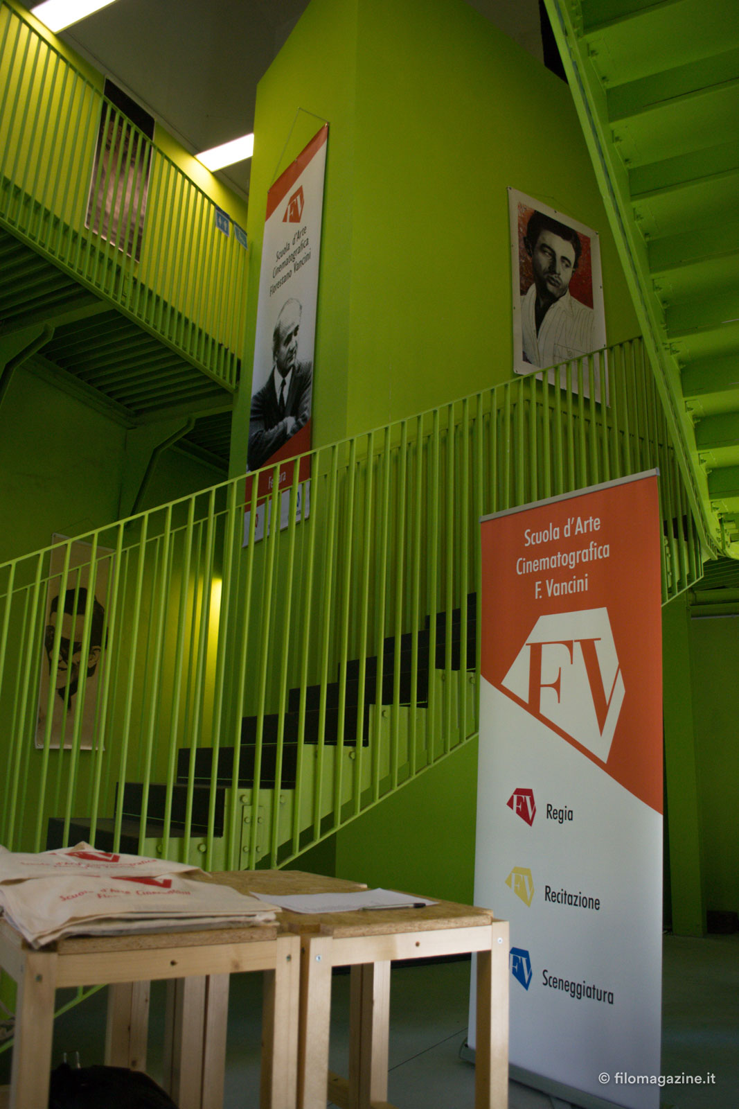 Sabato scorso ci siamo infiltrati all’ultimo open day di presentazione e abbiamo fatto due chiacchiere proprio con Stefano Muroni e Alessio Di Clemente, direttore artistico della scuola. Ad accoglierci all’entrata ufficiale a Grisù una scalinata verde lime, le cui pareti circostanti sono allestite con fotografie di David Parenti.