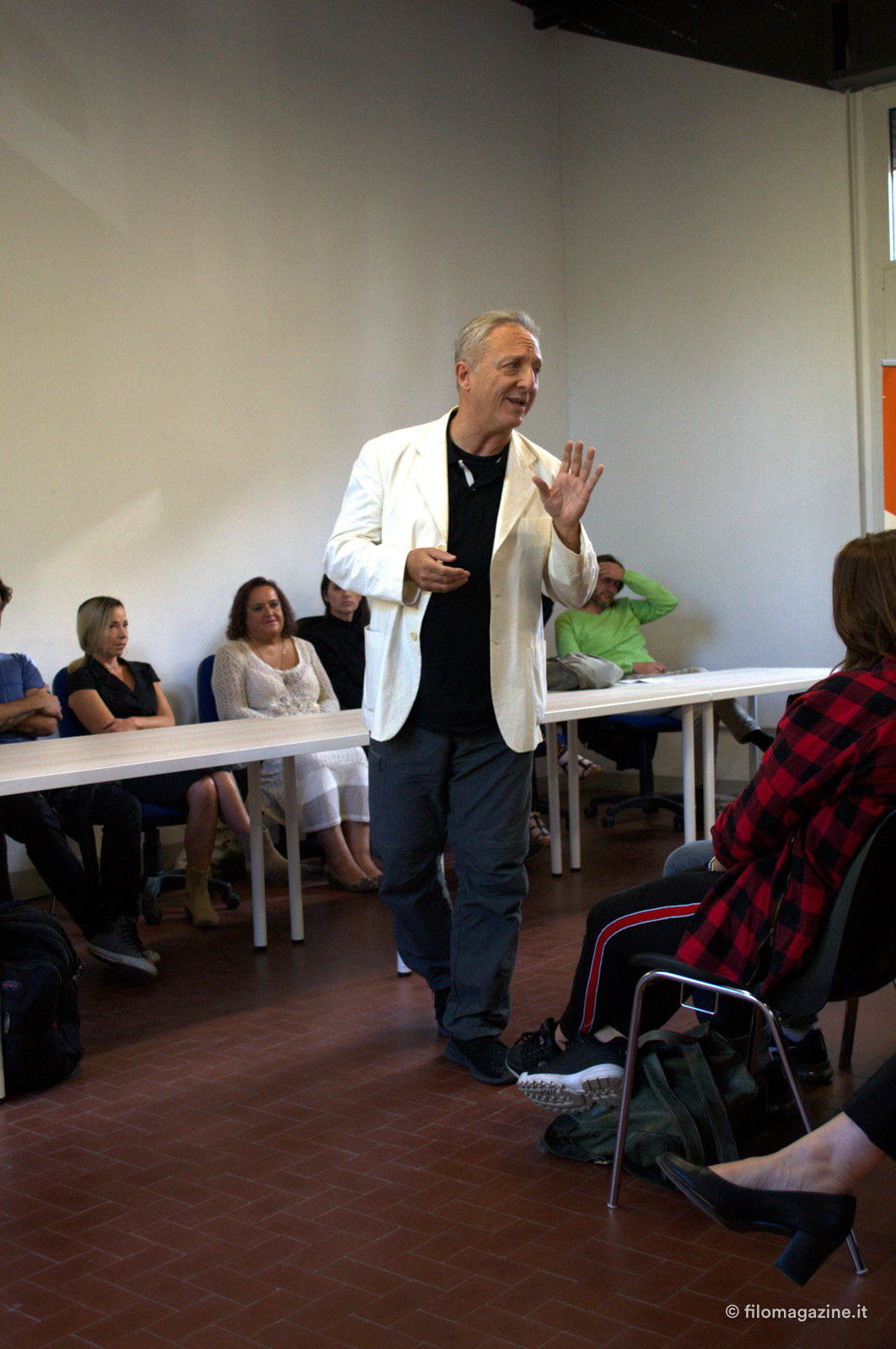 Insegneremo acting, vogliamo far fare un salto ai giovani attori italiani. In generale gli attori si preoccupano troppo di provare emozioni e raccontare la trama di un film. Questo non è il compito dell’attore. L’attore non deve raccontare una trama originale, ma relazioni umane originali, e le relazioni umane poggiano sugli obiettivi che noi tutti abbiamo che ci possono portare a comportamenti diversi e originali. Questo modo di veder le cose da originalità all’interpretazione, perché non è l’attore che deve mettersi a servizio dell’emozione, ma è l’emozione che deve stare a servizio dell’attore.