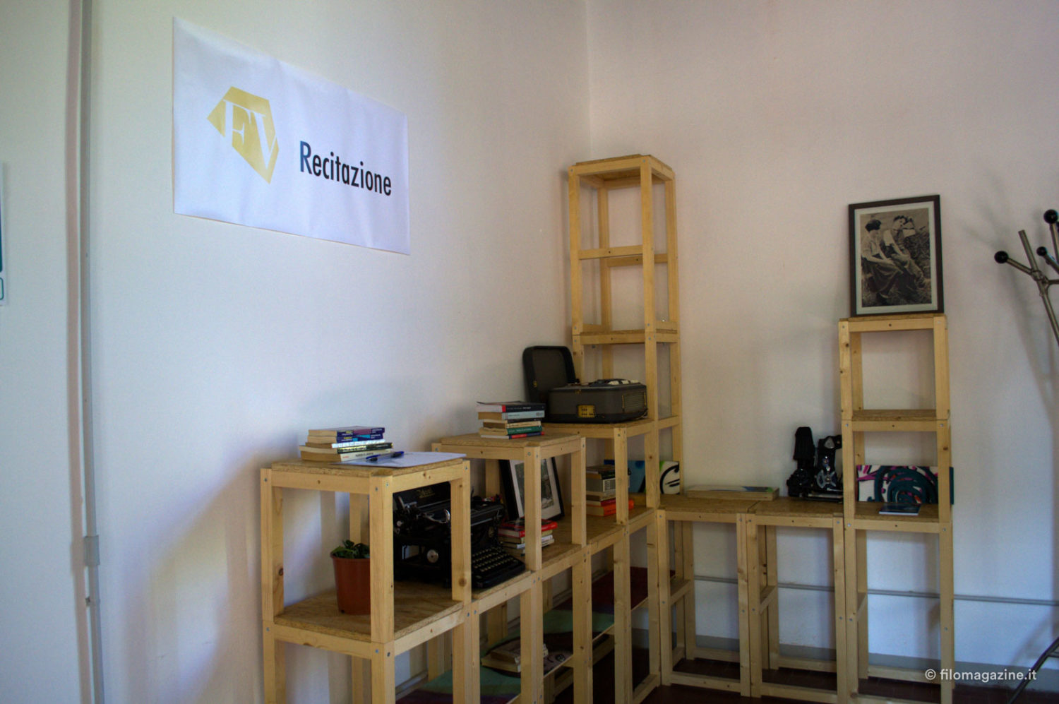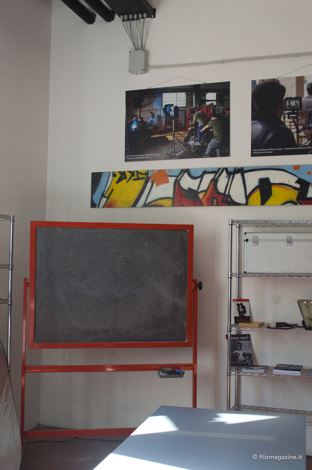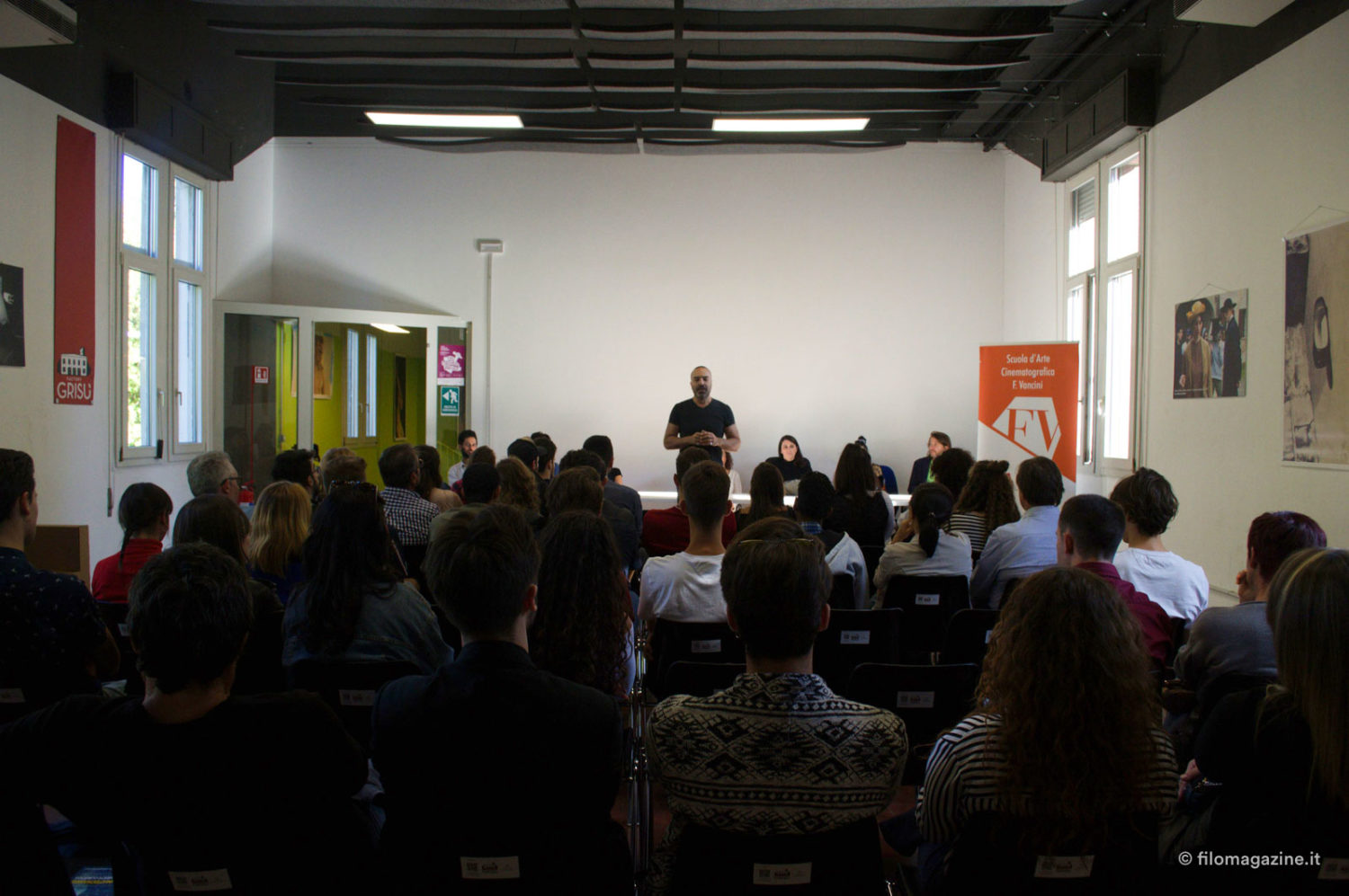 La prima stanza che incontriamo è l’aula di recitazione dove – mi spiega Stefano – il venerdì si riuniranno tutti e tre i corsi, regia, sceneggiatura e recitazione, creando la Tribù del set, cominciando da subito a relazionarsi per affrontare i futuri progetti cinematografici. Alle pareti troviamo fotografie dei film distribuiti e prodotti da Controluce, la società di Produzione di Stefano e Valeria Luzi, come “La notte non fa più paura” e “Oltre la bufera” che uscirà ad ottobre con prima nazionale proprio a Ferrara.