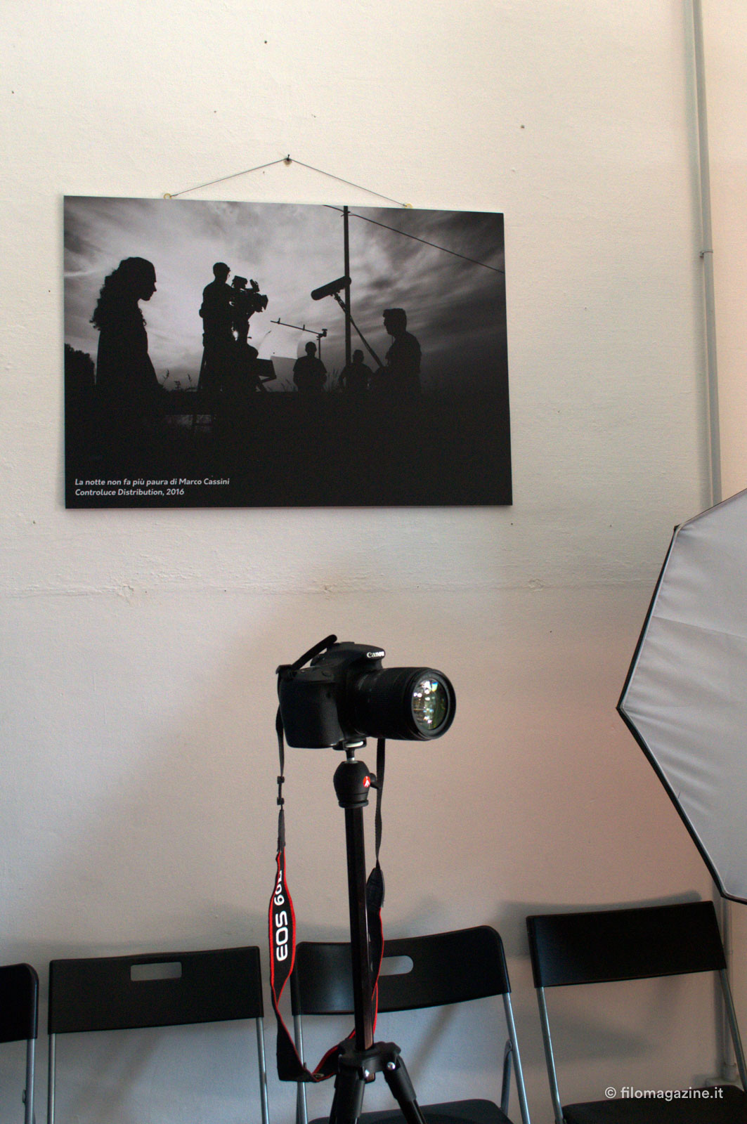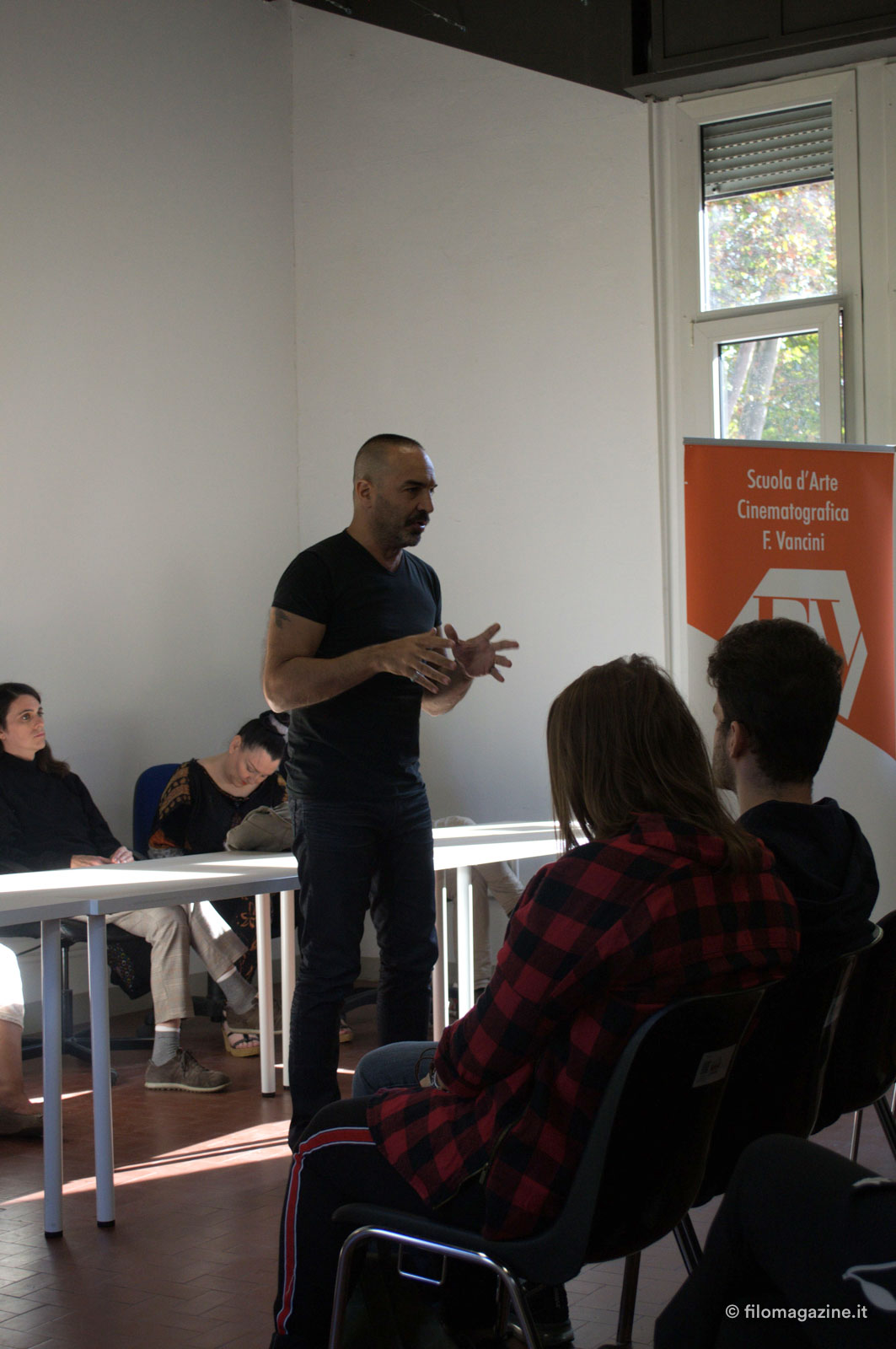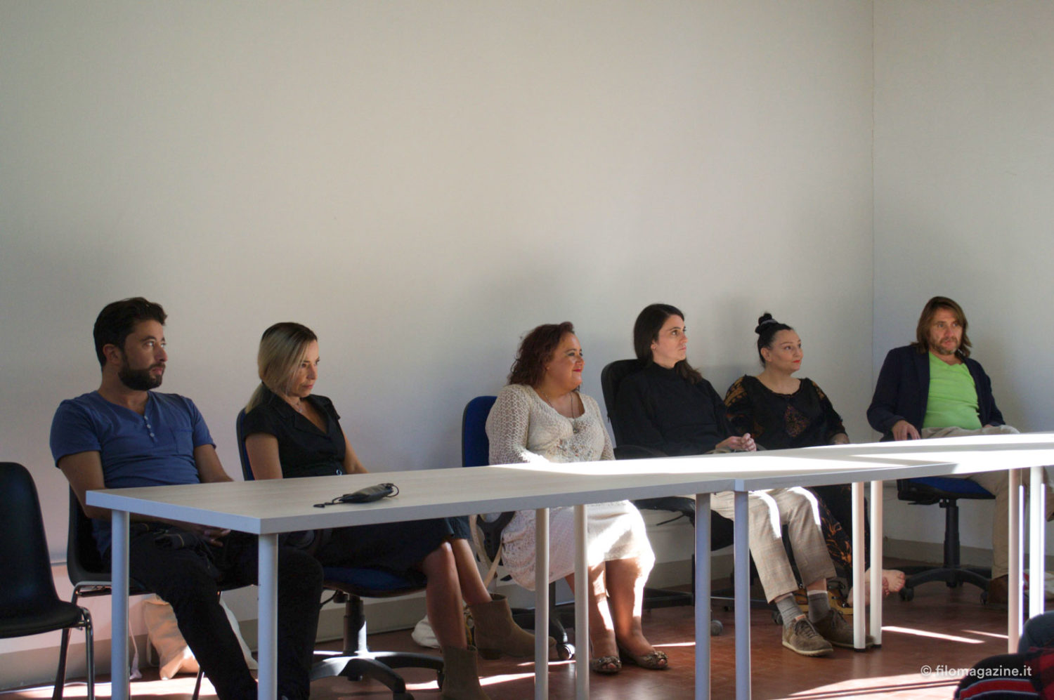 La prima stanza che incontriamo è l’aula di recitazione dove – mi spiega Stefano – il venerdì si riuniranno tutti e tre i corsi, regia, sceneggiatura e recitazione, creando la Tribù del set, cominciando da subito a relazionarsi per affrontare i futuri progetti cinematografici. Alle pareti troviamo fotografie dei film distribuiti e prodotti da Controluce, la società di Produzione di Stefano e Valeria Luzi, come “La notte non fa più paura” e “Oltre la bufera” che uscirà ad ottobre con prima nazionale proprio a Ferrara.