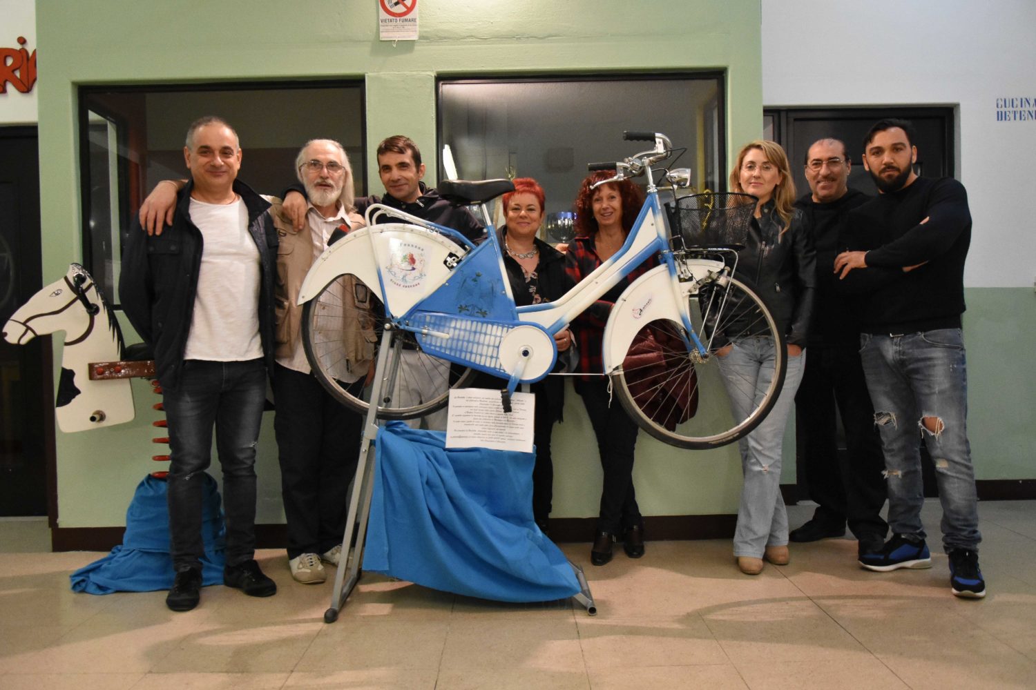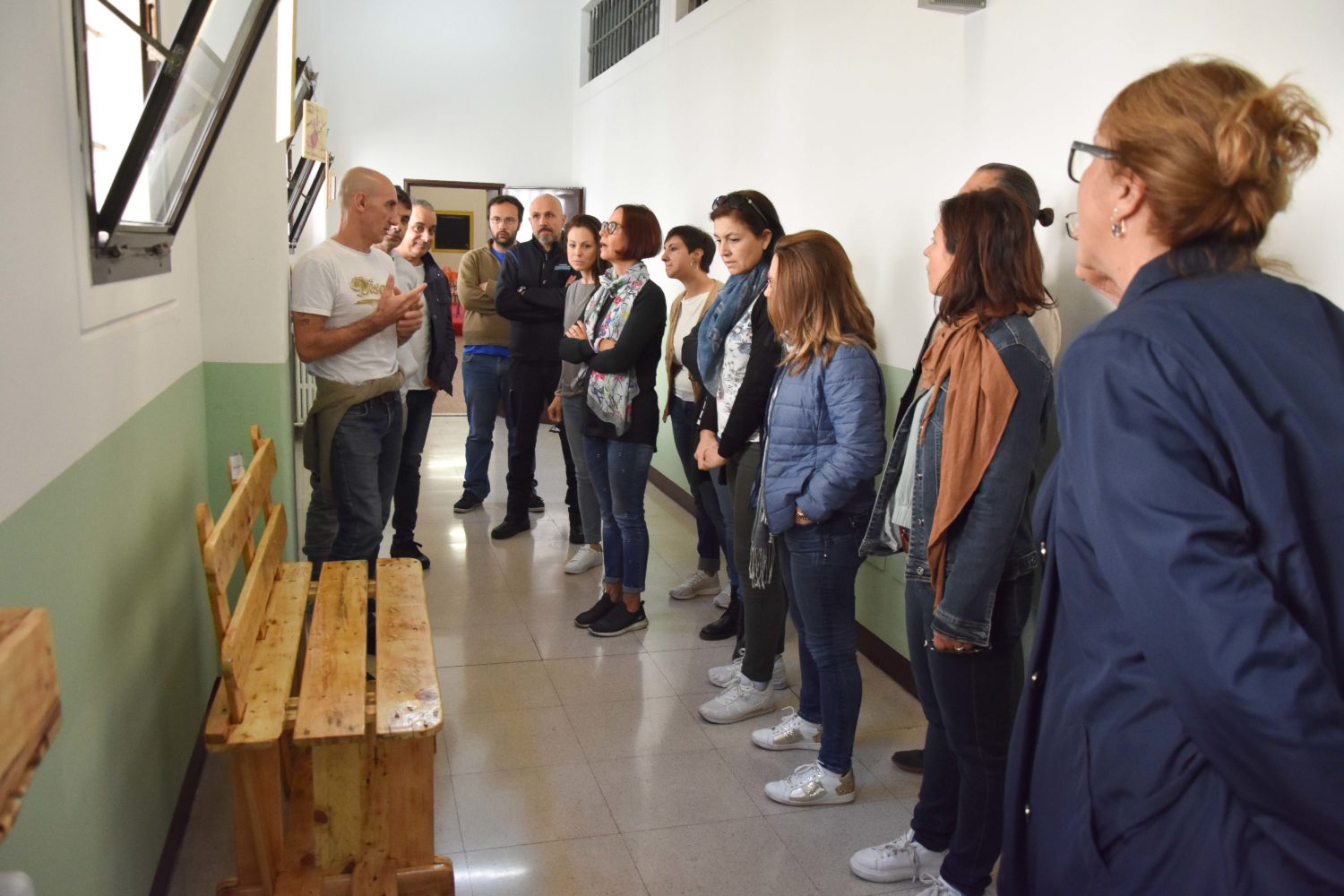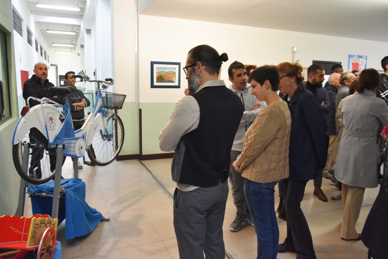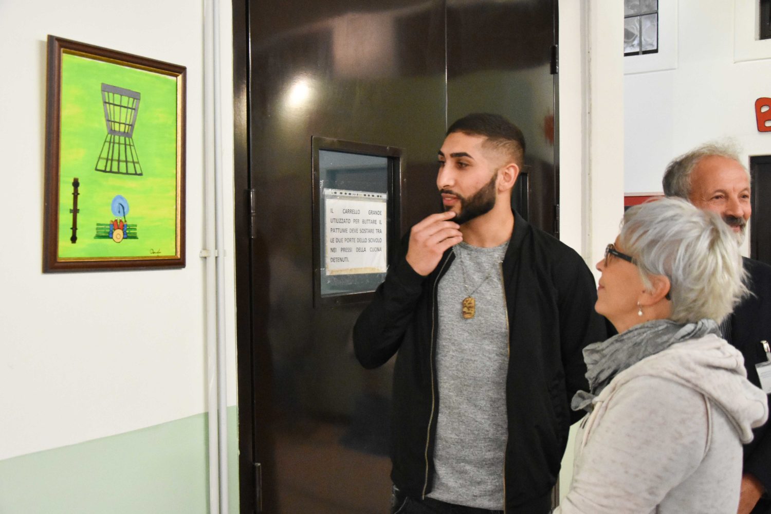 Il corridoio che attraversiamo per arrivare alla sala dove si svolgerà l’incontro è tappezzato di quadri fatti dai detenuti. Sembrano tante piccole finestre verso il mondo esterno. Alcuni denunciano, altri rappresentano la speranza. In uno si vede il filo che regge un aquilone che vola tagliare le sbarre in ferro che separano dall’esterno. In un’altro il profilo di un viso riempito dai fumi della televisione. Sono uno schiaffo che risveglia le coscienze dei visitatori, sono le finestre che mostrano la vita dentro le carceri priva di prospettiva. Poco più avanti le sculture degli Artenuti, un laboratorio di riuso artigianale che viene condotto in carcere da qualche anno. Sedie, orecchini, scaffali sono alcune delle cose prodotte riutilizzando materiali senza una destinazione. Danno, come i quadri, ai detenuti qualcosa a cui pensare. Un modo per uscire dal carcere con la fantasia, un modo per tenersi in allenamento e prepararsi alla vita che li aspetta al di fuori di quelle mura.