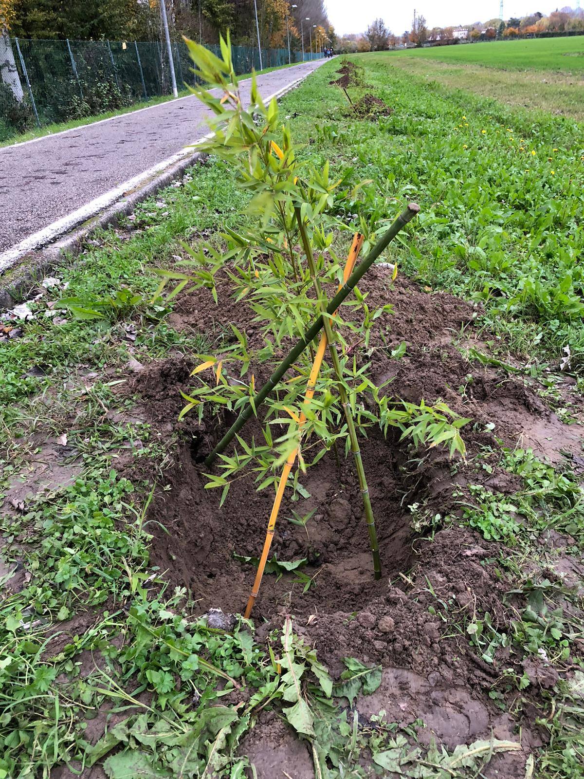 “La corretta realizzazione della buca – dice Tommaso Zucchini, dei Three Climbers – rappresenta di per sé già il 60% di possibilità di riuscita del trapianto. Aumenta le possibilità per l’albero di raggiungere in fretta una buona radicazione. Per salvaguardare l’incolumità dei passanti e rispettare l’ambiente abbiamo segnalato le buche con bambù reperito in loco, pianta invasiva infestante che ha donato un bel look naturale ai lavori ancora in corso. Naturalmente plastic free“.