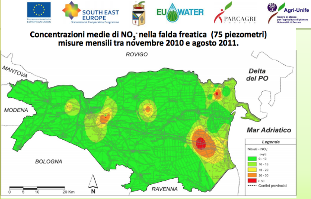 Il nostro territorio è considerato da 25 anni zona ad alta vulnerabilità nitrati ed il bacino idrografico Burana-Volano, per tale motivo, fu dichiarato a rischio crisi ambientale, con concentrazioni massime che superano tutt’ora i 50 mg/lt di NO-3 (microgrammo per litro), a fronte di livelli di norma di appena 1 mg/lt di NO-3 (microgrammo per litro) in falda freatica. (Fonte: Studio condotto da EU Water, Agri Unife – Concentrazioni di NO3 nella falda freatica)