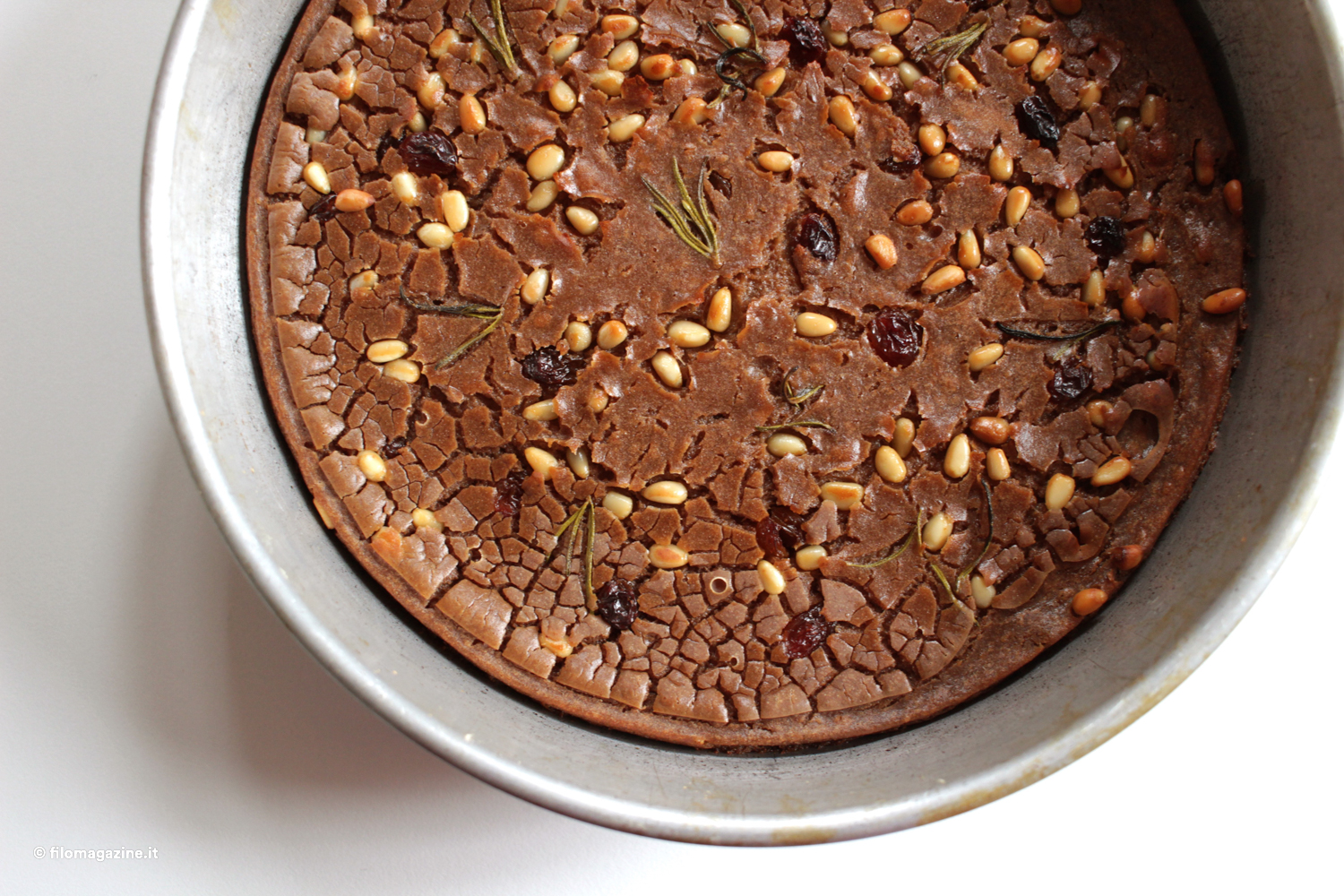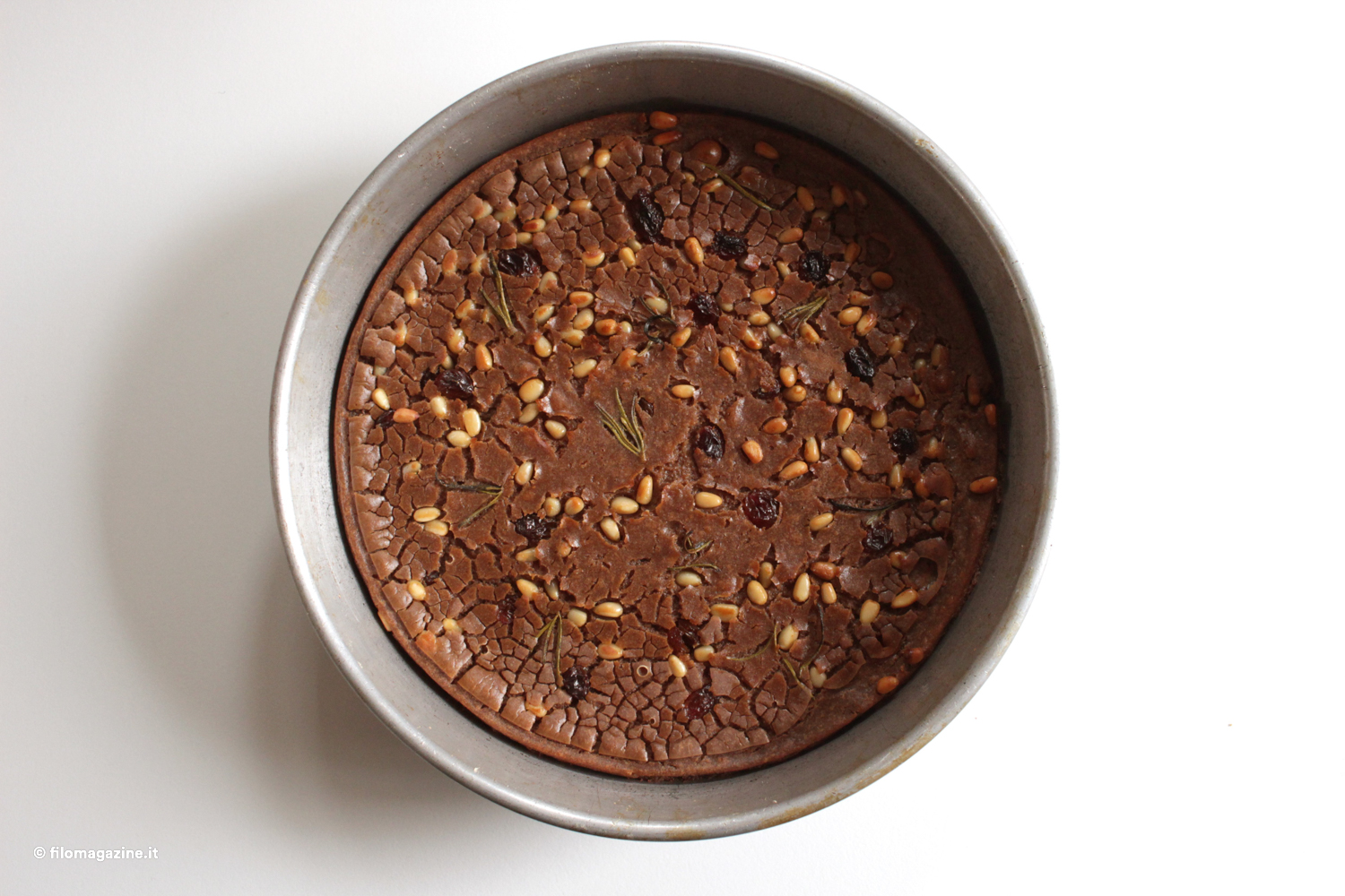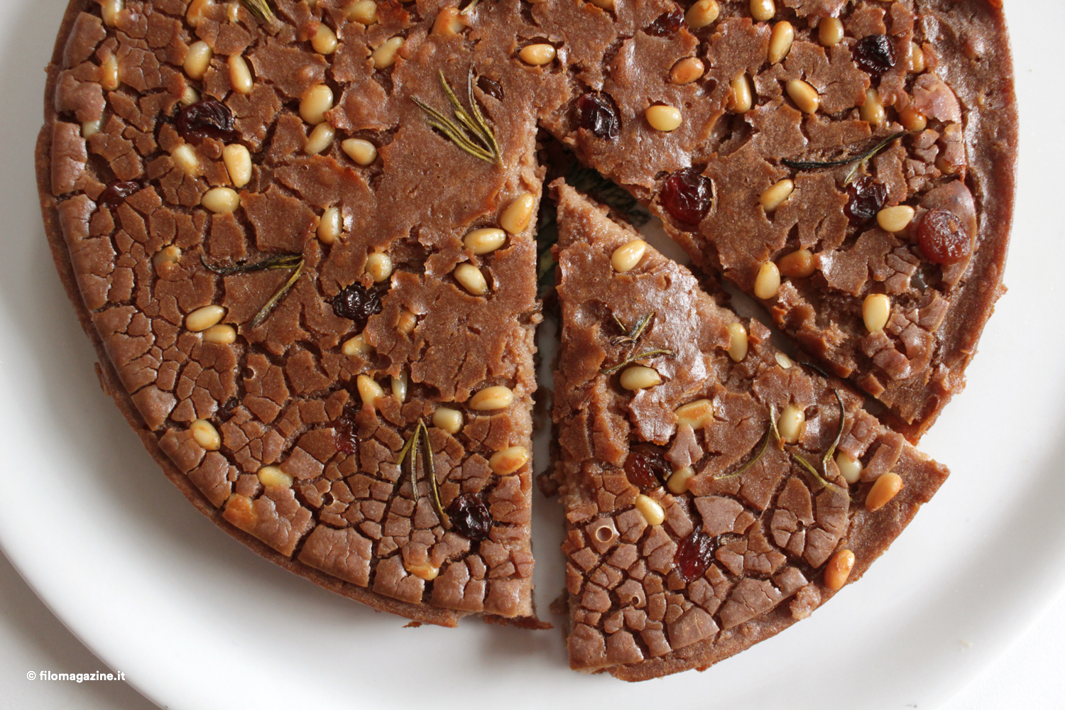 Il castagnaccio è un dolce semplice, dalle poveri origini: è costituito dalla sola farina di castagne diluita con l’acqua, non serve neanche lo zucchero perché risulta naturalmente dolce per la dolcezza della materia prima. Partendo da questa base, è possibile arricchirlo con diversi ingredienti che aggiungono aromi e consistenze, come le uvette, i pinoli o altra frutta secca, addirittura il rosmarino o anche la scorza di agrume (mia nonna spesso aggiunge la scorza di limone, mentre il papà di un mio amico usa quella del mandarino). Il risultato è un dolce compatto, umido e morbido all’interno e croccante in superficie. Ad ogni boccone si scopre una diversa complessità di gusto, delicato ma allo stesso tempo con un forte carattere.