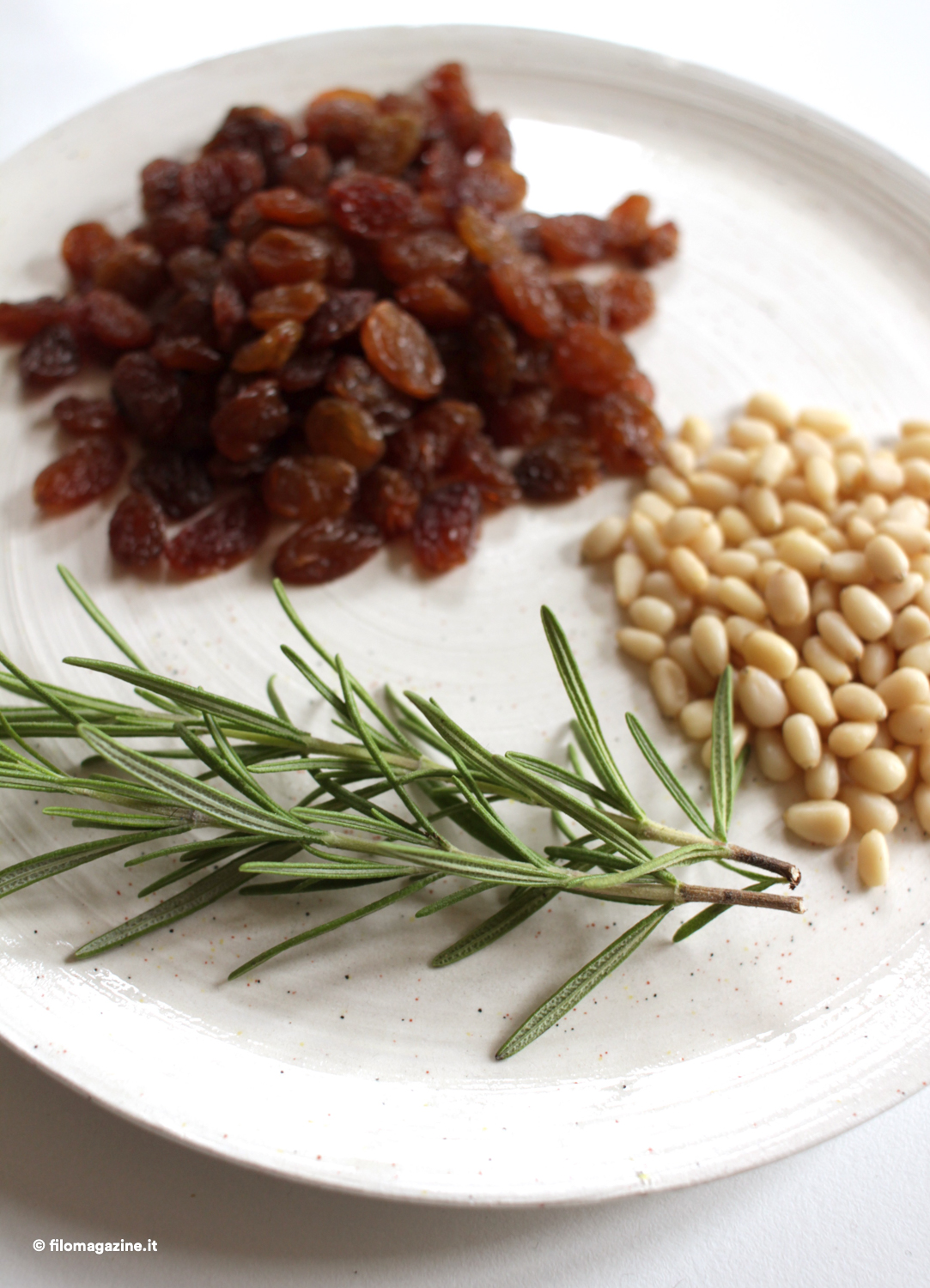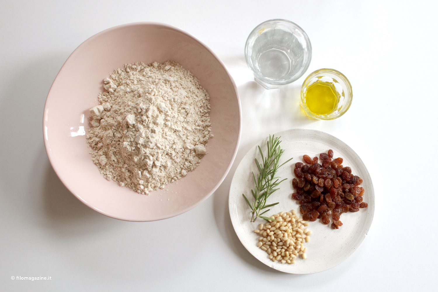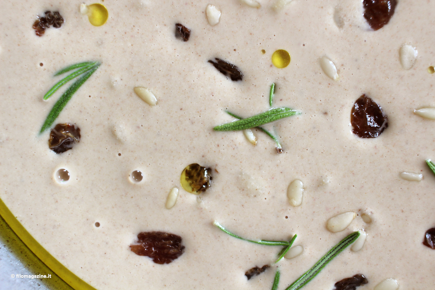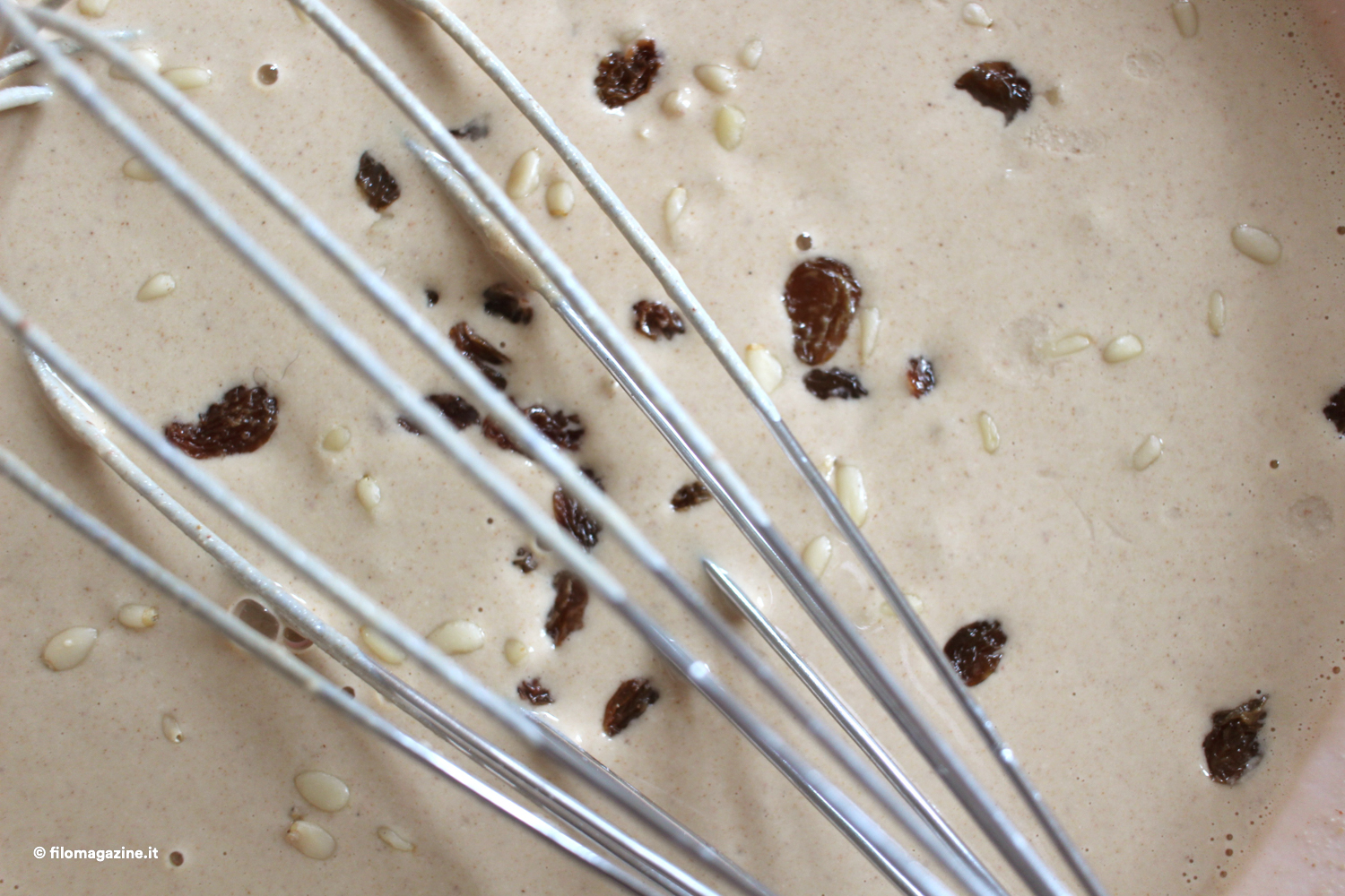 4. Aggiungere la metà dei pinoli e dell’uvetta all’impasto.
