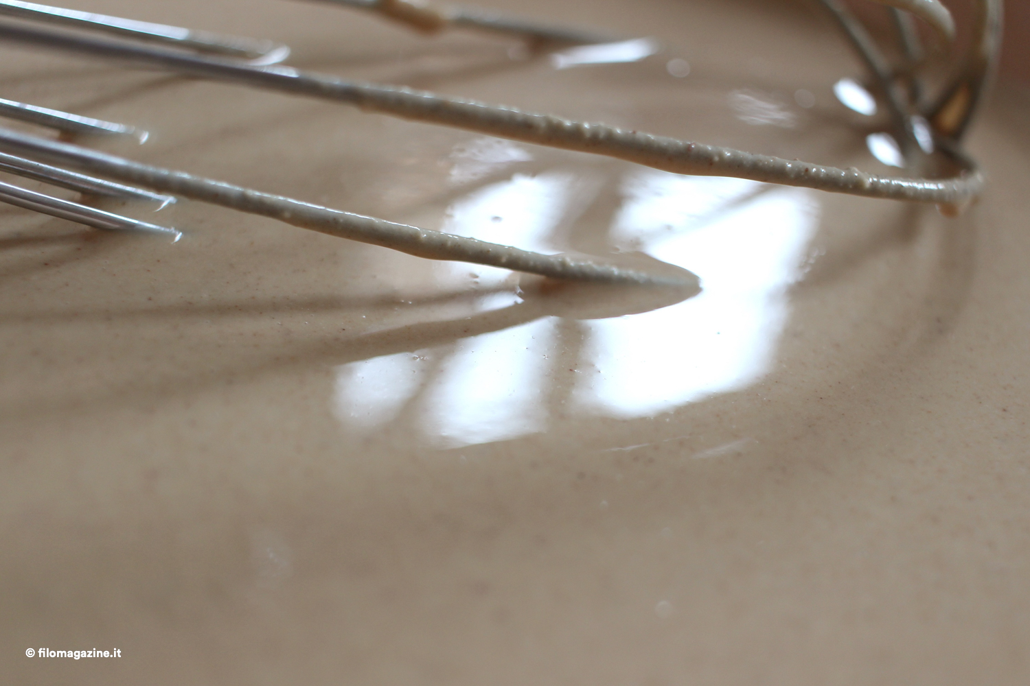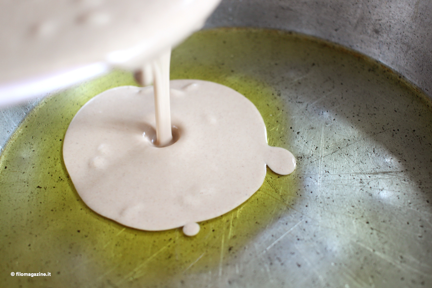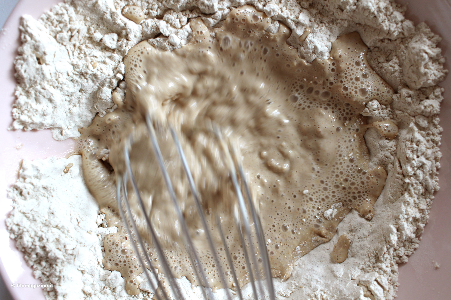 3. Aggiungere il pizzico di sale e l’acqua mescolando con un cucchiaio di legno o una frusta, finché non si forma una pastella liscia.