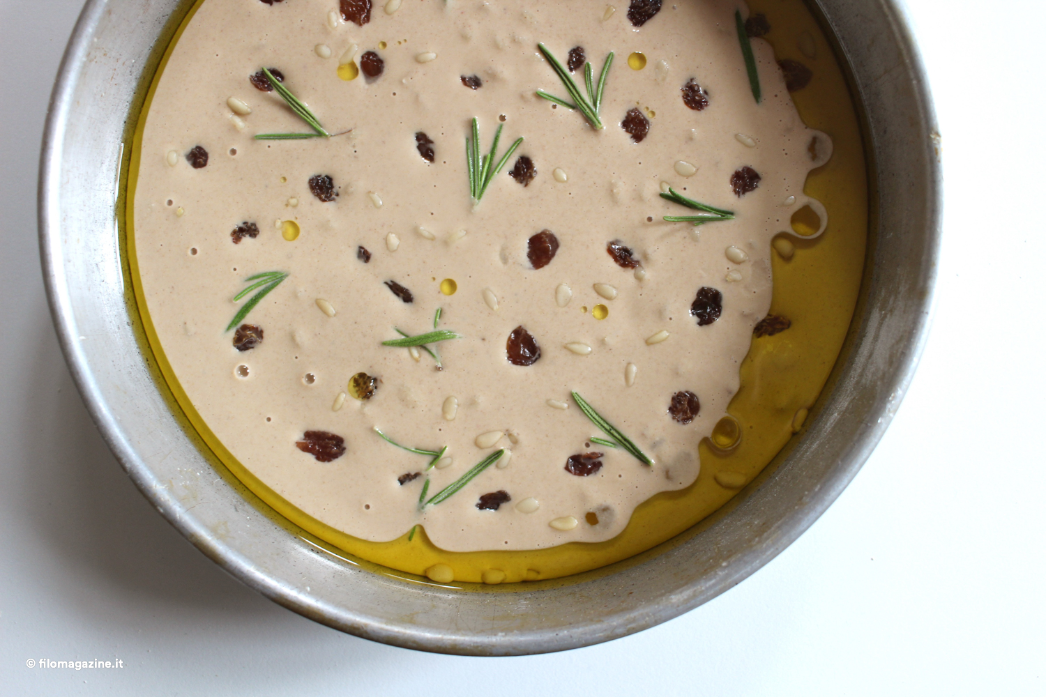 6. Versare la pastella e ultimare spargendo sulla superficie i rimanenti ingredienti.
