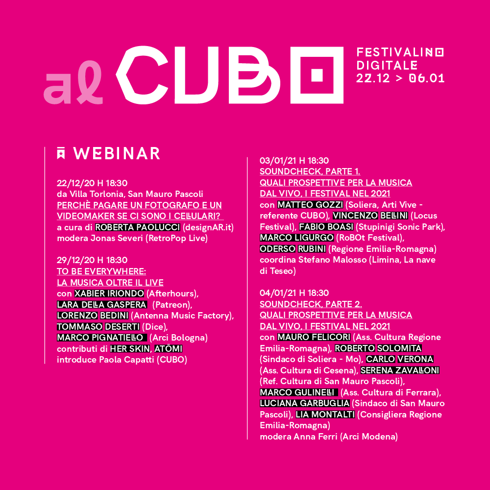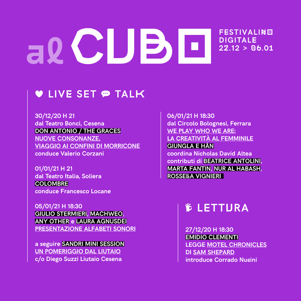 A cavallo con quelle che per tradizione ci ostiniamo a considerare le feste natalizie (lo potevano essere quest’anno?) Cubo è stato un contenitore che ha cercato di farsi le domande più sincere e allo stesso tempo di ridarci scampoli di realtà, contenuti inediti, concerti, letture, esperienze e interviste che sono state un racconto di quello che potrà essere il nostro 2021.