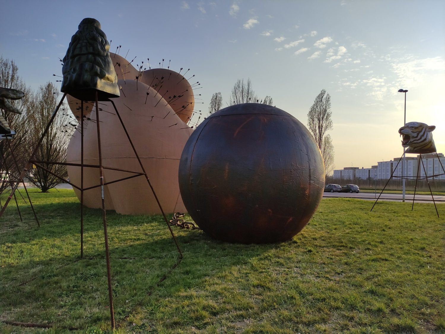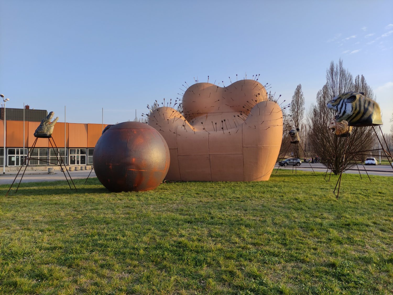 Di fronte al nostro dubbio sulla posizione periferica, Sgarbi conferma che nelle sue idee originarie questo dono alla città di uno dei più grandi scultori e designer italiani, Gaetano Pesce, avrebbe dovuto essere posizionato in luoghi centrali: piazza Ariostea, il Listone, quell’angolo di Mura in cui termina Ercole Primo d’Este, dove c’è il tiro a segno o la prevista rotonda di piazza San Giovanni, sfumata all’ultimo. Ma per scelte politiche o necessità urbane alla fine ha trovato casa in questo luogo, simbolo di speranza per uscire dalla pandemia, che si accinge già nei prossimi mesi ad ampliarsi con nuove opere che andranno a formare un Giardino delle Sculture, a cielo aperto, libera esposizione visitabile a disposizione della città.