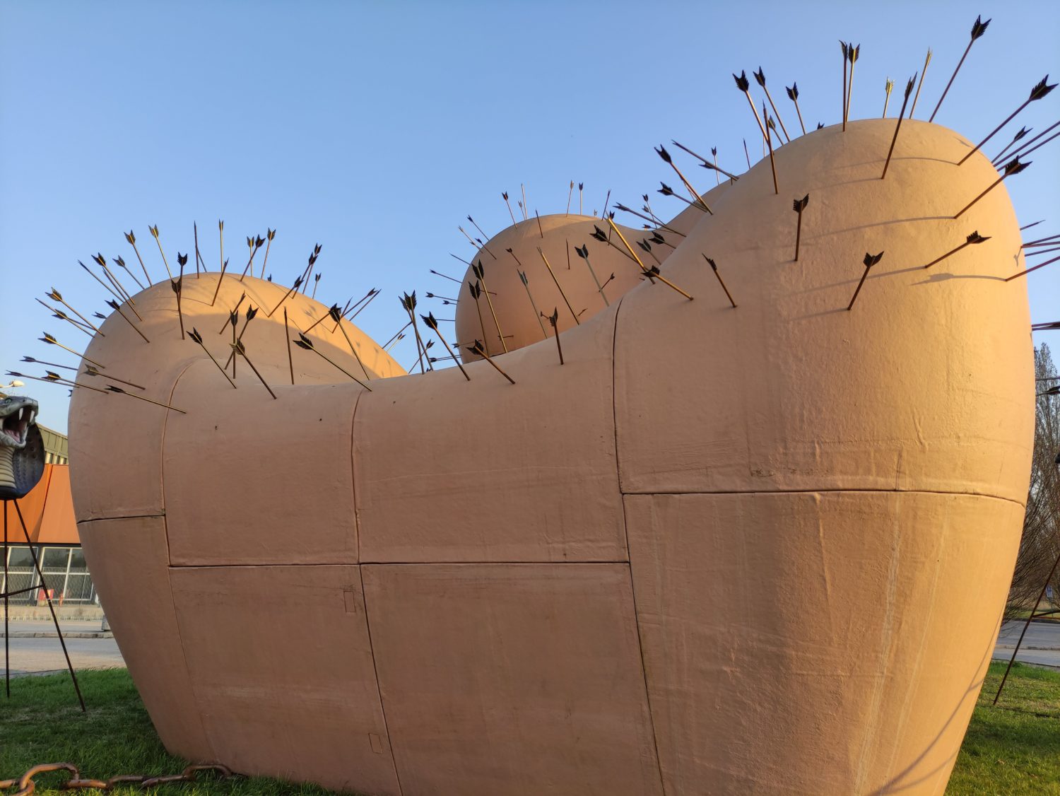 E questa “Maestà Sofferente” è davvero qualcosa che reca dolore: trafitta da decine di frecce e minacciata da animali pericolosi, questa enorme forma che richiama il corpo femminile pare il simbolo di una gigantesca resistenza senza confini ad un mondo ostile. Pare l’umanità di oggi: resistente, eppure ferita e quel sole che ne proietta l’ombra sui padiglioni dove si eseguono le vaccinazioni ci pare almeno un segno: forse di speranza, almeno in prospettiva.