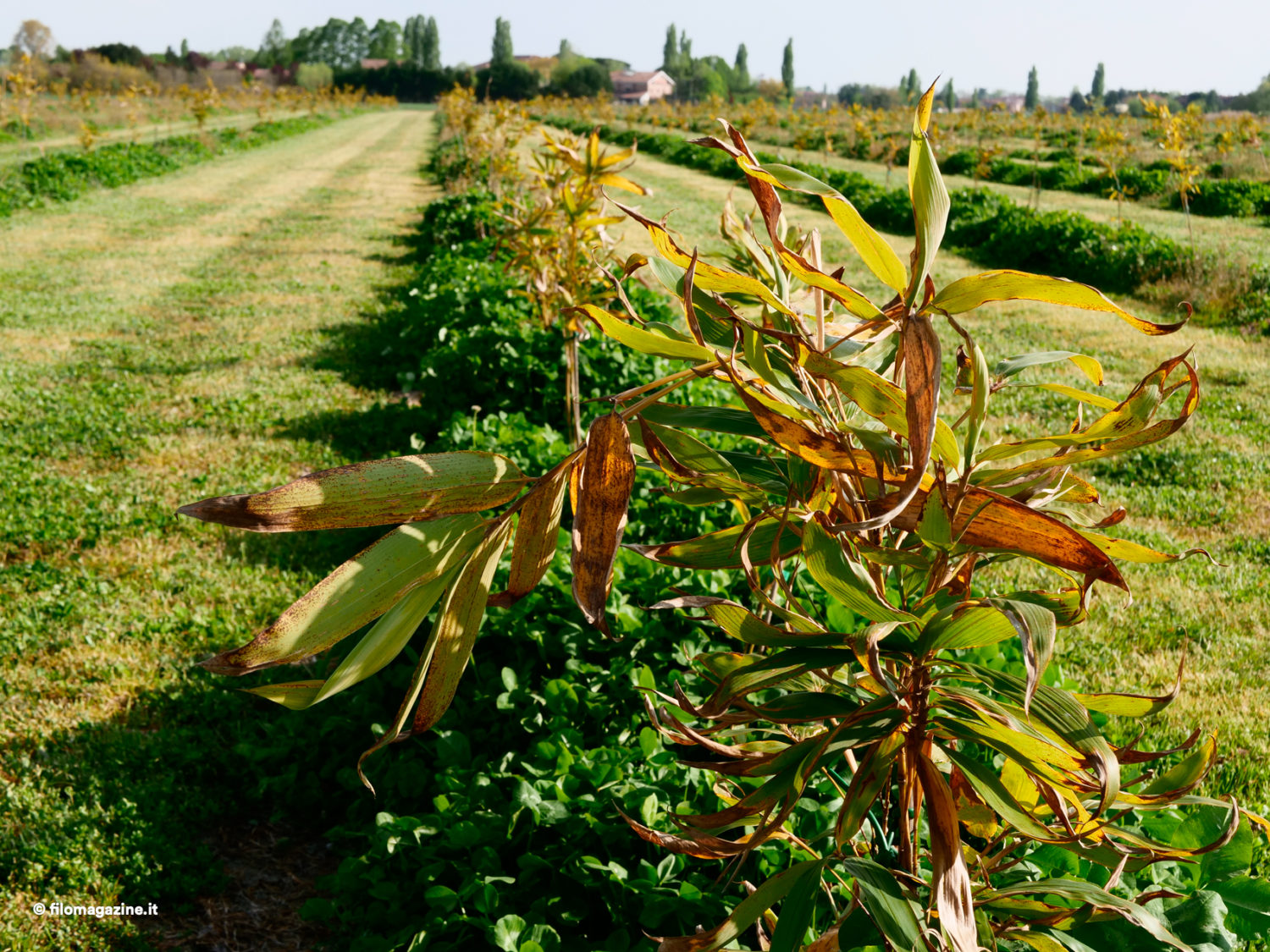 Tutto il campo adibito a bambù è stato seminato pure con trifoglio nano. Al di là della bellezza estetica, simile ad un prato all’inglese, il trifoglio si dimostra un ottimo pacciamante, utile a trattenere l’umidità del suolo ed evitare la proliferazione di infestanti, risulta inoltre un’erba ideale per le consociazioni, aiutando a veicolare i nutrienti e stimolare la crescita delle piante.