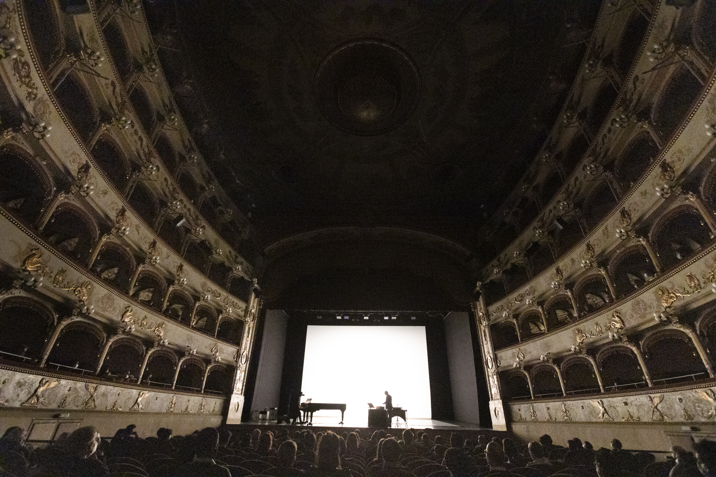 Ad accompagnare gli spettatori verso il risveglio, verso la rinascita di questo spazio collettivo chiamato teatro, sono stati Sebastiano De Gennaro e Enrico Gabrielli con 19’40” On Cage. Venti minuti di musiche contrastanti che omaggiano il maestro dell’avanguardia musicale novecentesca. Musica che risvegliano dolcemente come l’odore del caffè mattutino ma che non dimenticano le ruvidità del secolo in cui sono state scritte. Sul palco pianoforte e xilofono con un velo trasparente che separa i musicisti dallo sfondo bianco. Ombre nere bidimensionali suonano la storia o le storie. Il velo si alza e le immagini si fanno più nitide dando spazio alla tridimensionalità, alla profondità di una scena che torna a essere un tutt’uno con la platea. La quarta parete è sfondata e forse è in quel momento che il sogno si fa realtà. Siamo a teatro, di nuovo.