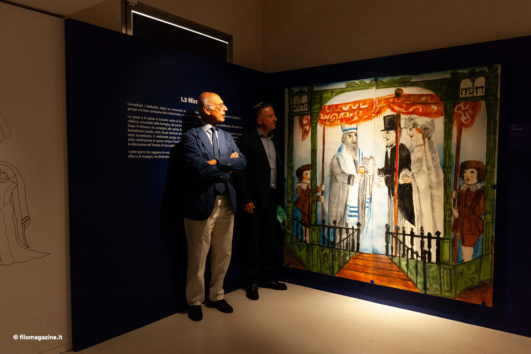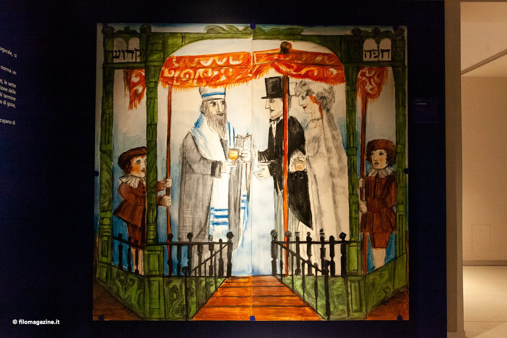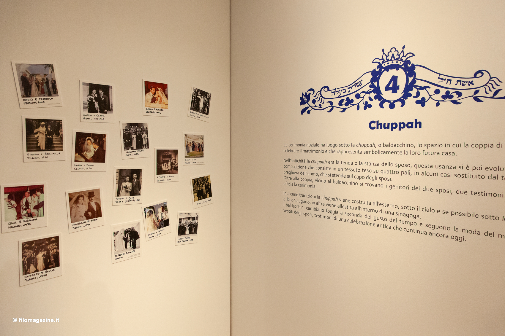 La mostra è curata da Sharon Reichel e Amedeo Spagnoletto ed è allestita dall’Arch. Giulia Gallerani, ha inaugurato lo scorso 5 giugno al Museo Nazionale dell’Ebraismo Italiano e della Shoah di Ferrara-MEIS e rimarrà aperta fino al 5 settembre. Il percorso espositivo interamente al pian terreno, nel blocco centrale del MEIS, si snoda attraverso testi e oggetti tipici del rito religioso, ma anche regali e biglietti, album di famiglia e tante foto ricevute proprio da parte della comunità ebraica italiana, il tutto alternato ad opere d’arte contemporanea e installazioni video che ci portano nel cuore della parte più festosa di ogni unione civile o religiosa che sia: quella del banchetto nuziale.