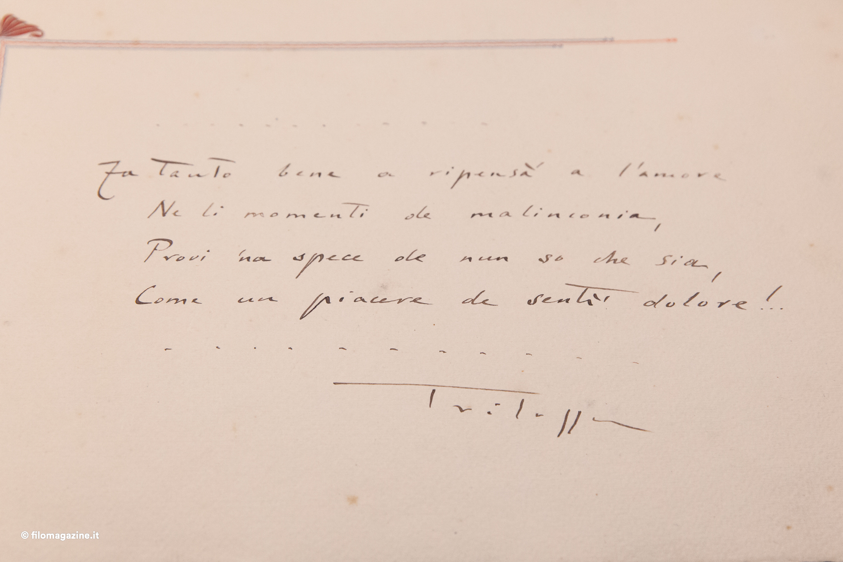 In mostra tra gli oggetti e i regali legati ad alcune nozze storiche di cui si è recuperata traccia c’è anche un album del tutto particolare. Si tratta di un dono di Sabatino Lopez, critico letterario e commediografo di successo a cavallo di inizio Novecento: in occasione del matrimonio di suo fratello Corrado nel maggio del 1899, fece realizzare questo libro con una raccolta di autografi e dediche di personaggi di spicco dell’ambiente culturale e artistico. Tra i nomi che compaiono, uno per pagina con piccoli componimenti, saluti e appunti troviamo Giosuè Carducci, Giovanni Pascoli, Giovanni Verga, Giacomo Puccini, Eleonora Duse, Roberto Bracco e le sorelle Gramatica. Ben sessantacinque autografi scritti nei mesi precedenti ma la cui raccolta è andata avanti anche negli anni successivi, fino al 1928. Non è l’unico esempio di questo tipo di regalo: la moda di raccogliere testi e disegni aveva avuto probabilmente origine nella prima metà dell’Ottocento e non era limitata ad occasioni nuziali, rappresentando anche un ricordo d’amicizia.