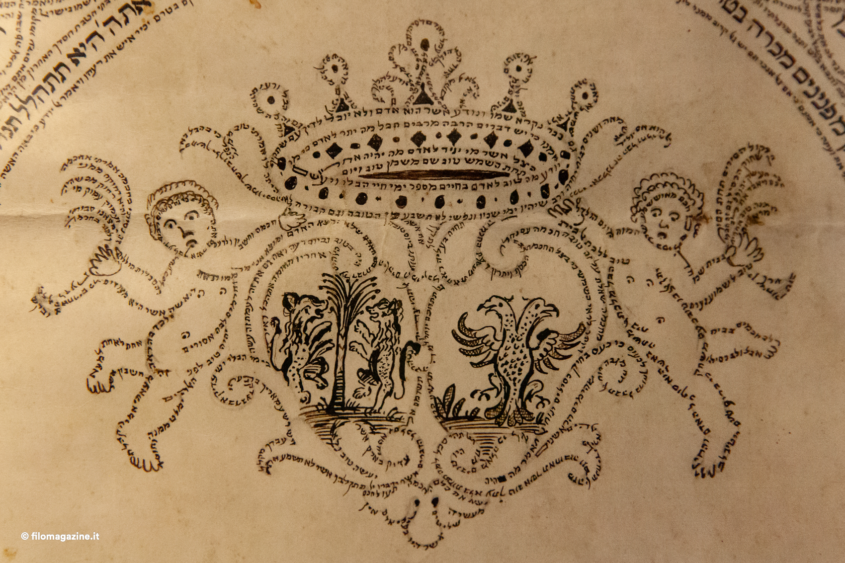 In ebraico significa scritto, ed è un documento in cui sono incluse le responsabilità del marito nei confronti della sposa, come l’impegno ad onorarla, non farle mancare vestiti, alimenti e ogni necessità. Al suo interno è definito l’importo della dote, viene prevista obbligatoriamente una somma aggiuntiva che il marito si corrisponderà alla moglie in caso di divorzio. Questa sorta di contratto prematrimoniale, che spesso siamo abituati a vedere nei matrimoni vip di star di Hollywood o persone particolarmente benestanti, nasce come istituto giuridico a tutela della moglie, un deterrente per evitare che questa venga ripudiata a cuor leggero senza garanzie. Erano documenti stilati a mano e impreziositi da ornamenti e disegni: in mostra ce ne sono di varie epoche ma uno in particolare colpisce per un particolare insolito… è composto da frasi scritte in miniatura che compongono esse stesse il disegno complessivo intorno.