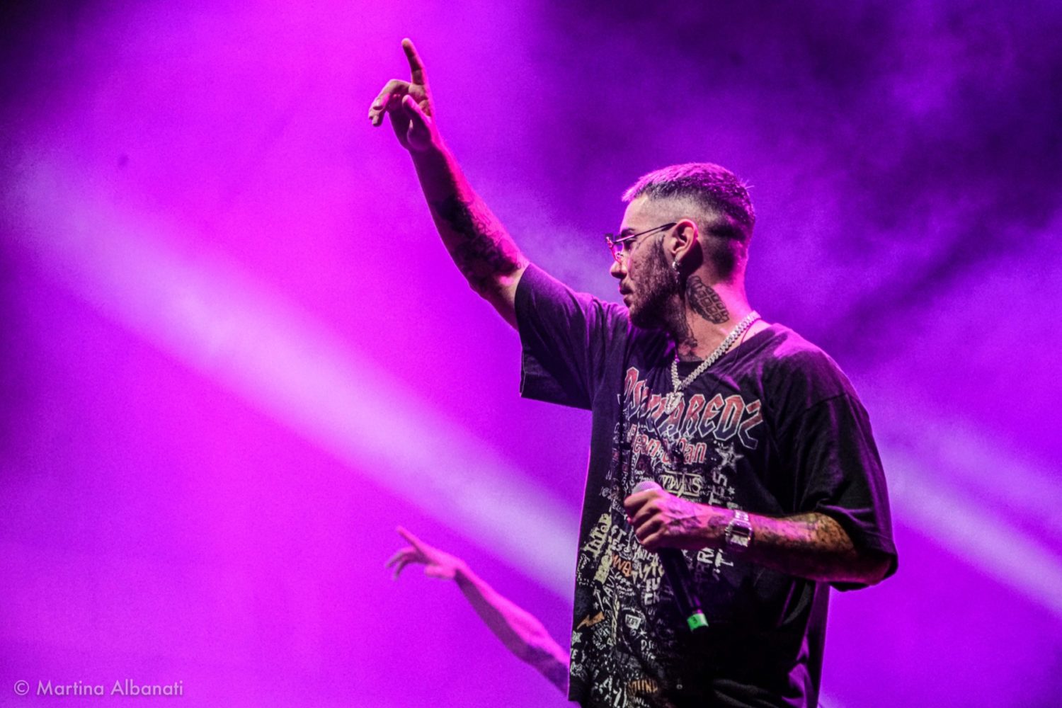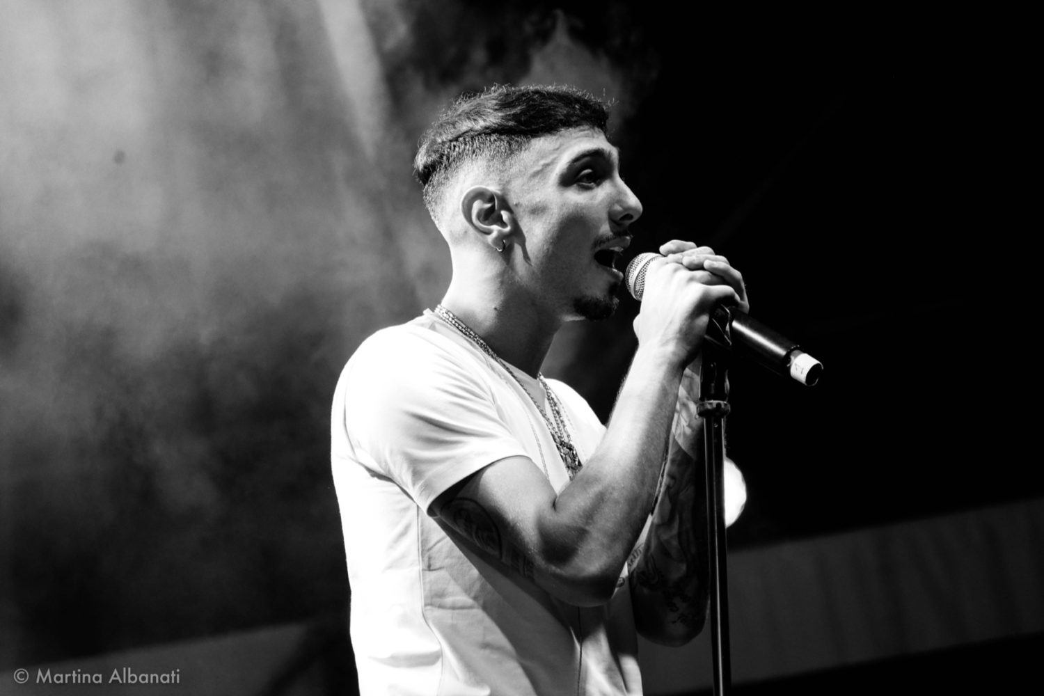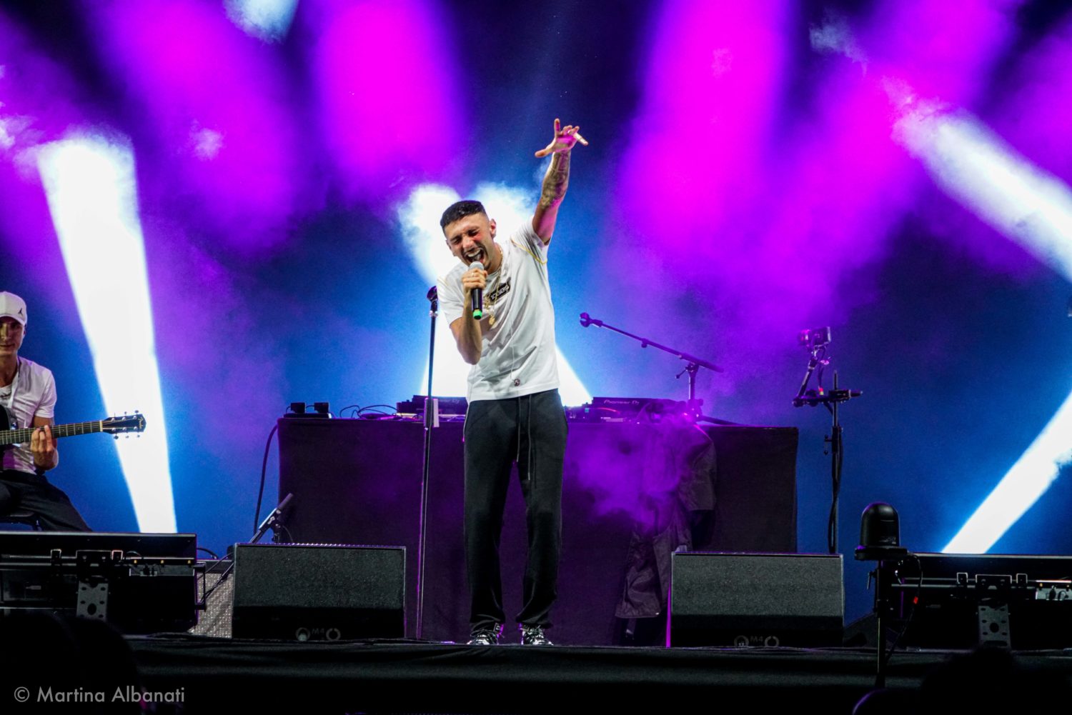 L’età media è bassa, sicuramente inferiore a tutte le altre serata del Festival; come dev’essere, com’è giusto che sia per un concerto rap: Ferrara respira giovinezza, trasuda ebrezza nuova. Si parte in medias res: Random addolcisce la piazza con i suoi 20 anni romantici tutti da raccontare. Lui esce da un mondo diverso rispetto agli altri che lo seguiranno, o almeno così si crede: il ragazzo napoletano, cresciuto a Riccione, ha fatto ballare le spiagge con Chiasso nel 2019, doppio platino e indiscusso re nelle consolle delle riviere, perlomeno la nostra di sicuro. Poi ha voluto esagerare, osare ancor di più: Bravo ragazzo un po’ fuori di testa prima, Rossetto poi (in ordine di scaletta).