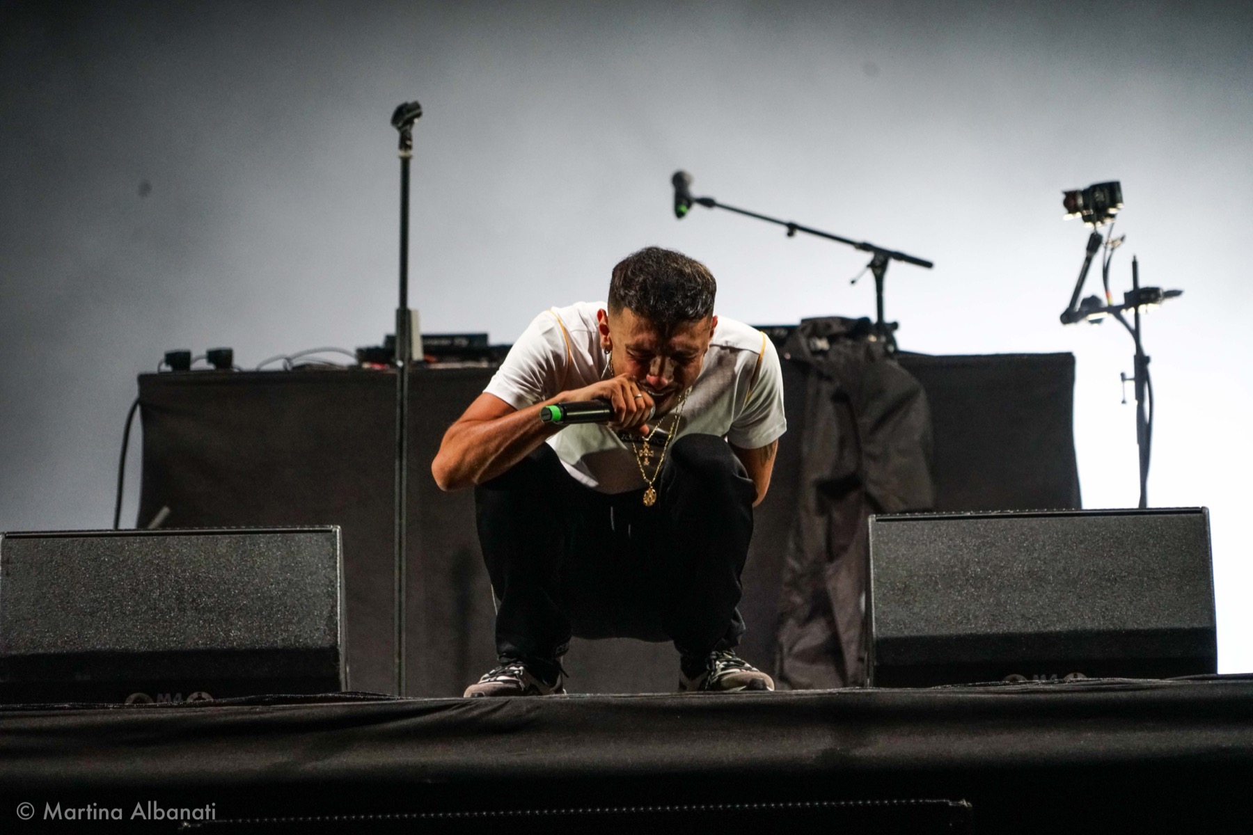 L’età media è bassa, sicuramente inferiore a tutte le altre serata del Festival; come dev’essere, com’è giusto che sia per un concerto rap: Ferrara respira giovinezza, trasuda ebrezza nuova. Si parte in medias res: Random addolcisce la piazza con i suoi 20 anni romantici tutti da raccontare. Lui esce da un mondo diverso rispetto agli altri che lo seguiranno, o almeno così si crede: il ragazzo napoletano, cresciuto a Riccione, ha fatto ballare le spiagge con Chiasso nel 2019, doppio platino e indiscusso re nelle consolle delle riviere, perlomeno la nostra di sicuro. Poi ha voluto esagerare, osare ancor di più: Bravo ragazzo un po’ fuori di testa prima, Rossetto poi (in ordine di scaletta).