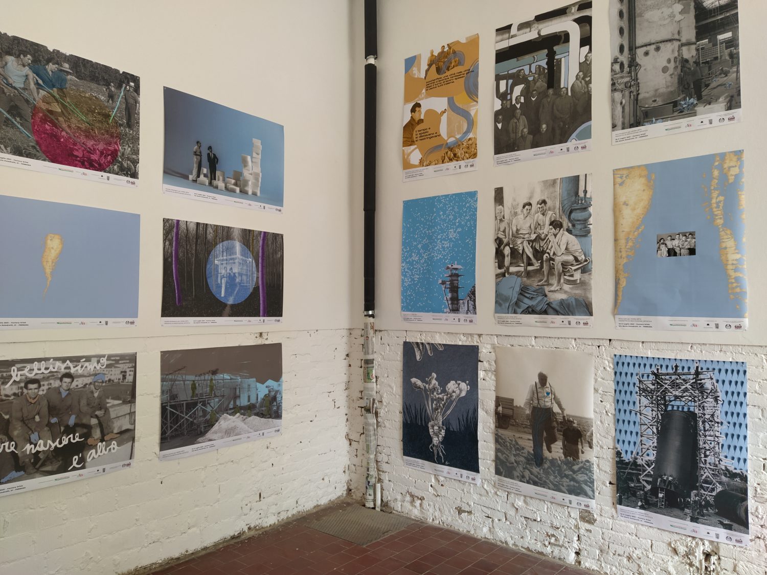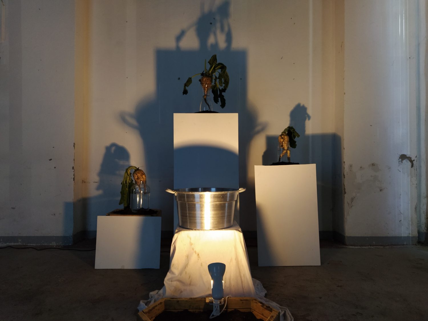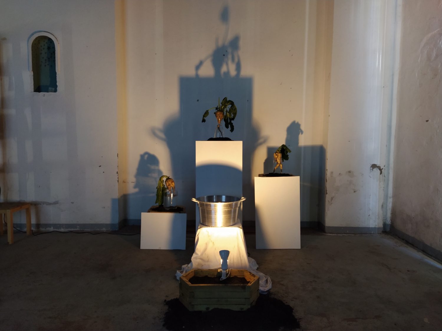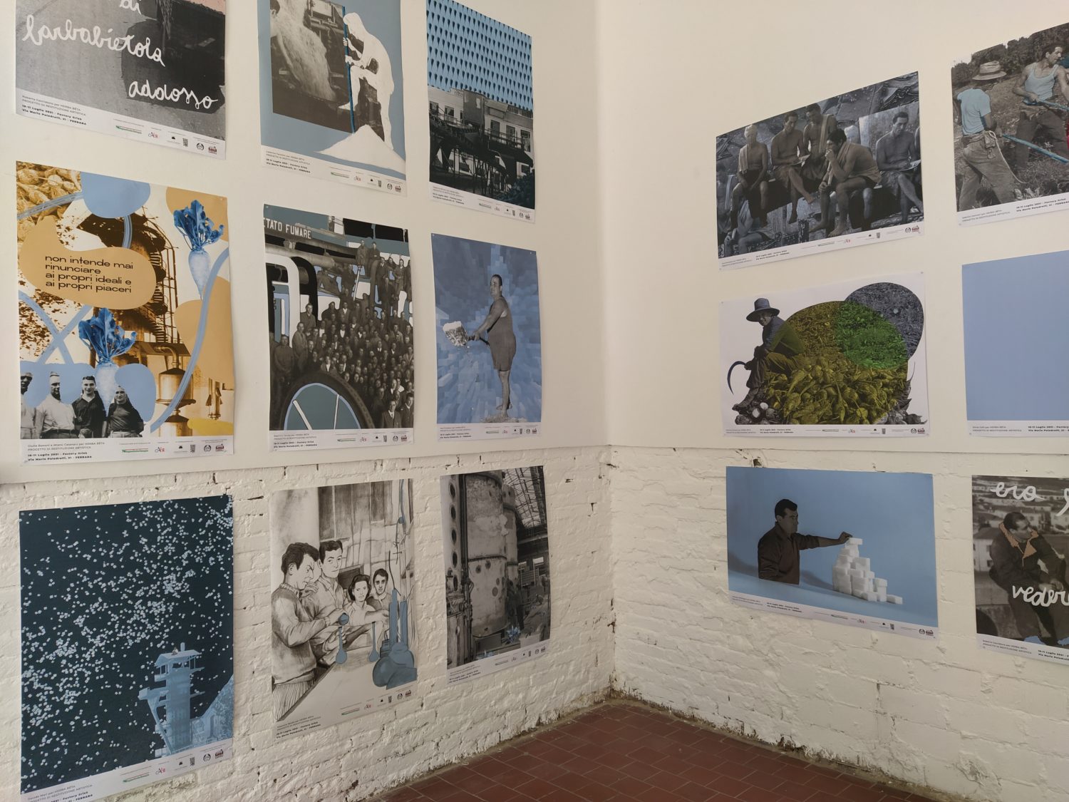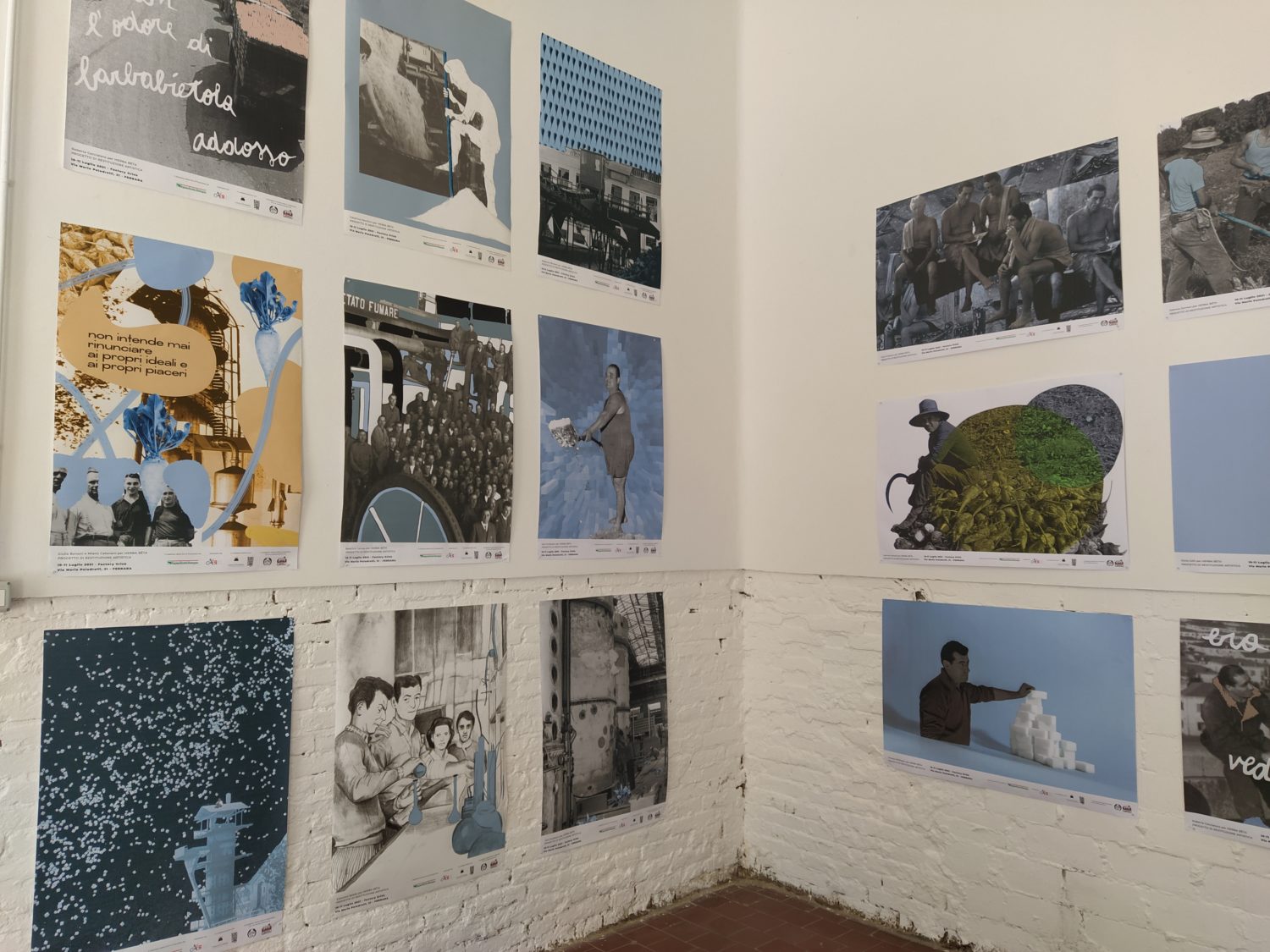 Una sirena scandisce l’entrata come scandiva l’inizio del lavoro, all’ingresso un cartellino con l’orario come quello degli operai. La sala è buia e le voci di chi ha lavorato negli zuccherifici testimoniano un passato più o meno remoto. Al centro della stanza, su un cuboide alto tre metri e costruito per l’occasione, viene mostrato il crollo di una parte della ex distilleria di Tresigallo attraverso immagine storiche che nel riavvolgersi ne mostrano, in un cortocircuito temporale, anche la costruzione. Sulle due pareti opposte della stanza diventa protagonista la barbabietola, da una parte la costruzione, dall’altra l’installazione, da una parte il video dall’altra la scenografia. Un dialogo tra pareti opposte che diventa un dialogo con la storia, un dialogo che sprigiona ricordi anche in chi ha lavorato negli zuccherifici. L’importanza dell’acqua e del lavaggio nel processo di trasformazione in zucchero viene riconosciuto come elemento fondante da ex operai passati a vedere la mostra. Sul lato opposto del cuboide un’altra proiezione racconta la costruzione e la decostruzione degli zuccherifici, ciò che rimane sono le facce degli operai, di chi ci lavorava e ha visto, in molti casi, nascere e morire gli stabilimenti.