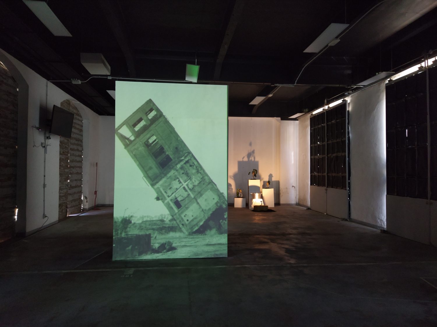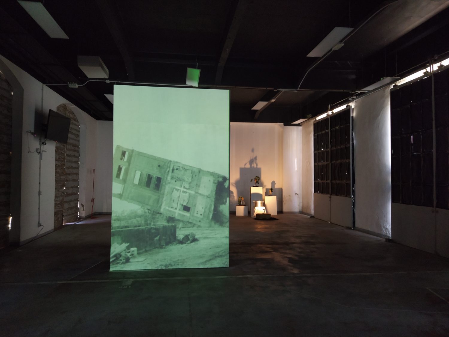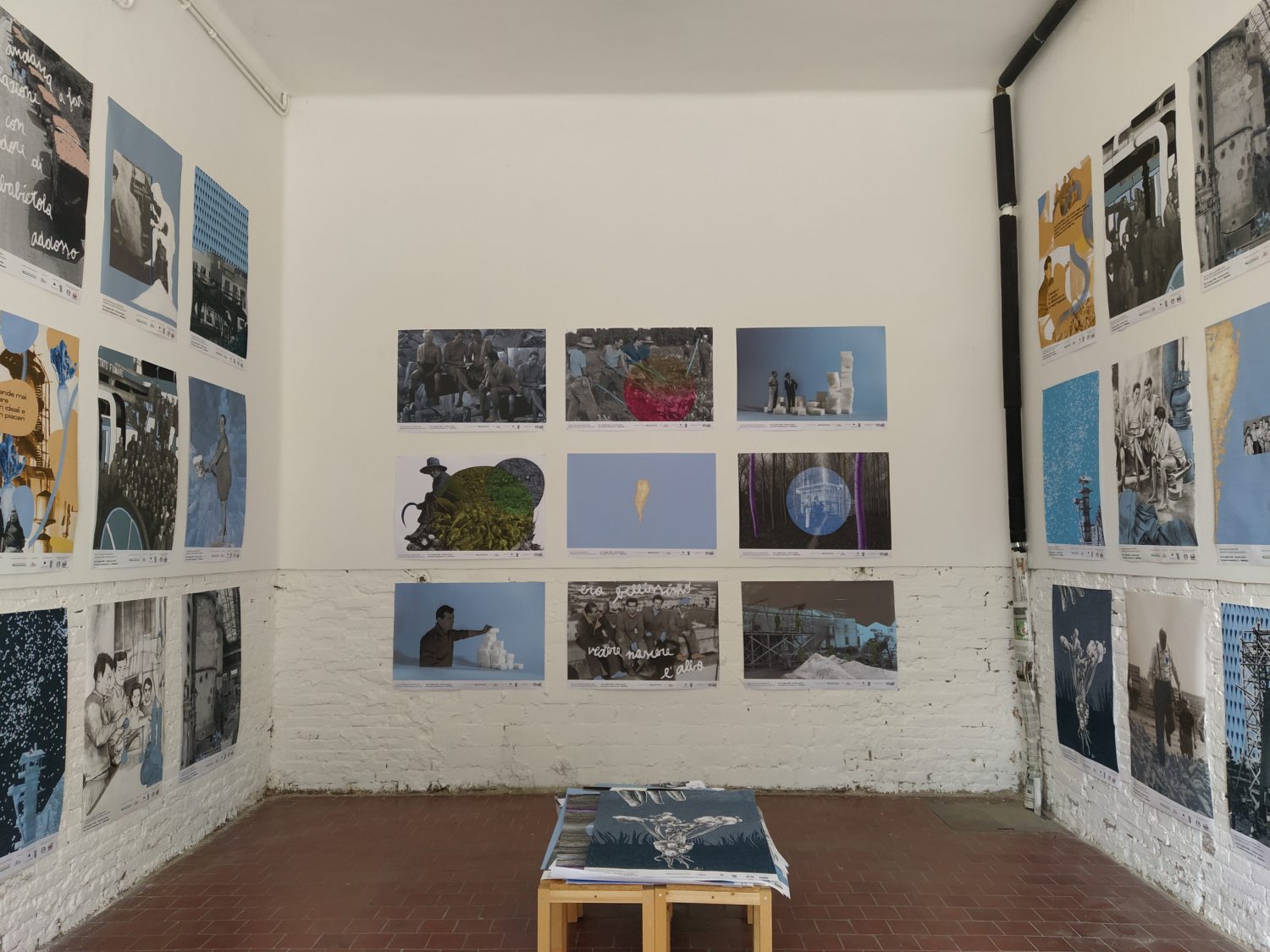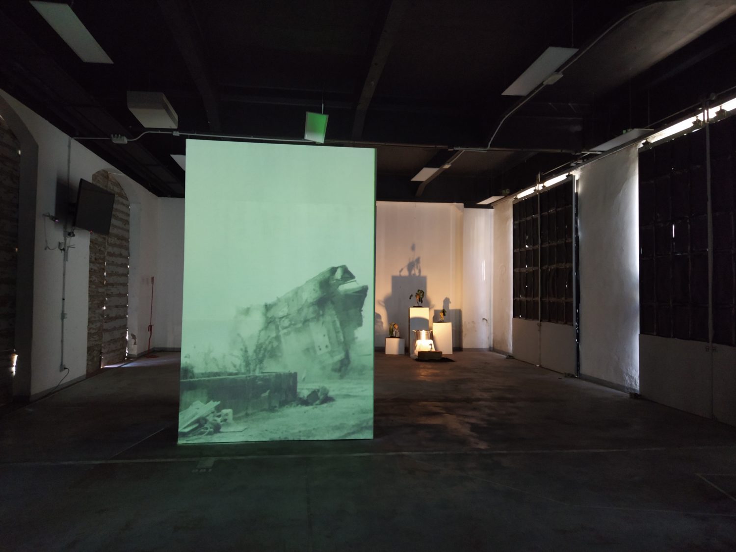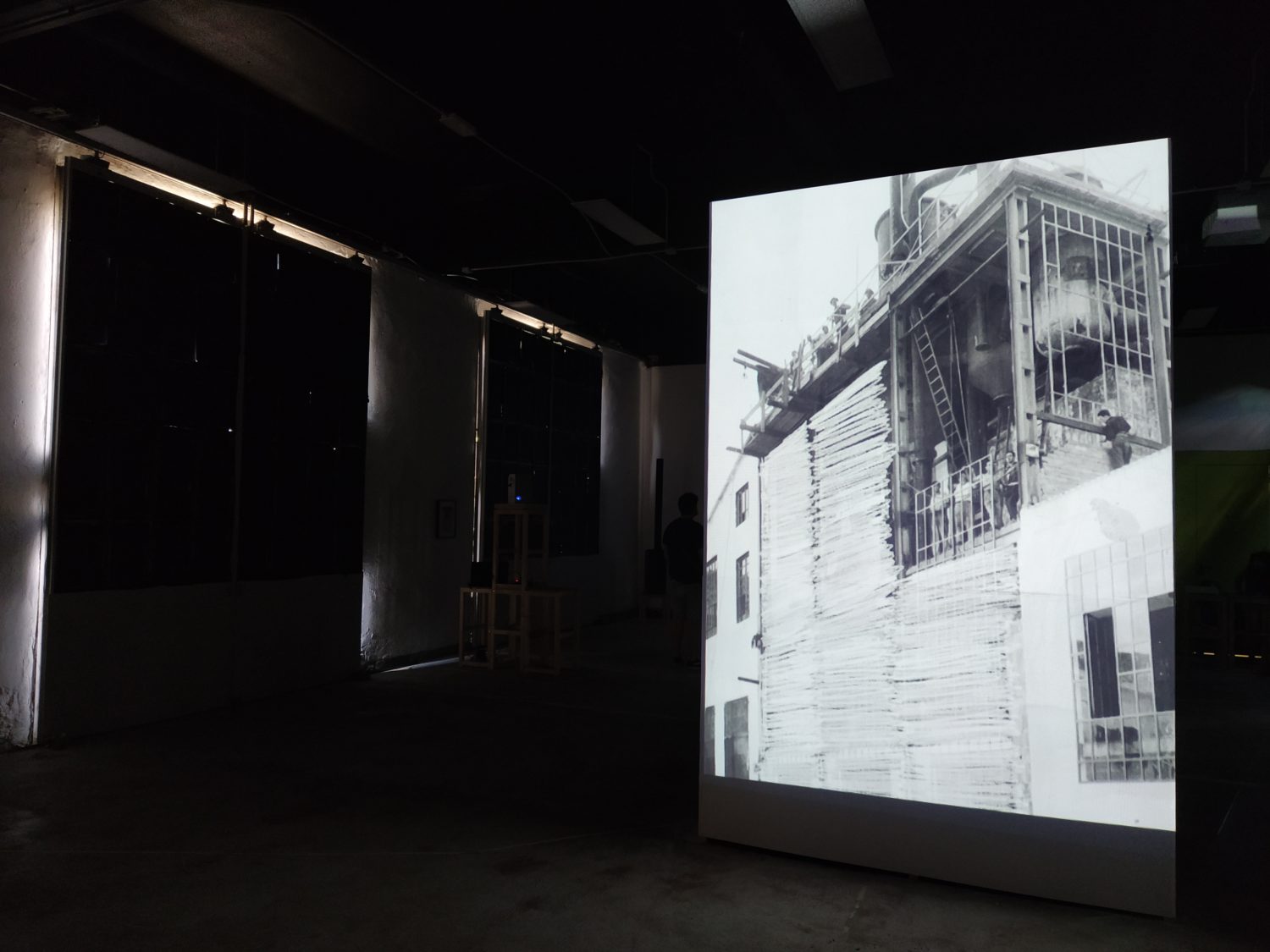 Una sirena scandisce l’entrata come scandiva l’inizio del lavoro, all’ingresso un cartellino con l’orario come quello degli operai. La sala è buia e le voci di chi ha lavorato negli zuccherifici testimoniano un passato più o meno remoto. Al centro della stanza, su un cuboide alto tre metri e costruito per l’occasione, viene mostrato il crollo di una parte della ex distilleria di Tresigallo attraverso immagine storiche che nel riavvolgersi ne mostrano, in un cortocircuito temporale, anche la costruzione. Sulle due pareti opposte della stanza diventa protagonista la barbabietola, da una parte la costruzione, dall’altra l’installazione, da una parte il video dall’altra la scenografia. Un dialogo tra pareti opposte che diventa un dialogo con la storia, un dialogo che sprigiona ricordi anche in chi ha lavorato negli zuccherifici. L’importanza dell’acqua e del lavaggio nel processo di trasformazione in zucchero viene riconosciuto come elemento fondante da ex operai passati a vedere la mostra. Sul lato opposto del cuboide un’altra proiezione racconta la costruzione e la decostruzione degli zuccherifici, ciò che rimane sono le facce degli operai, di chi ci lavorava e ha visto, in molti casi, nascere e morire gli stabilimenti.