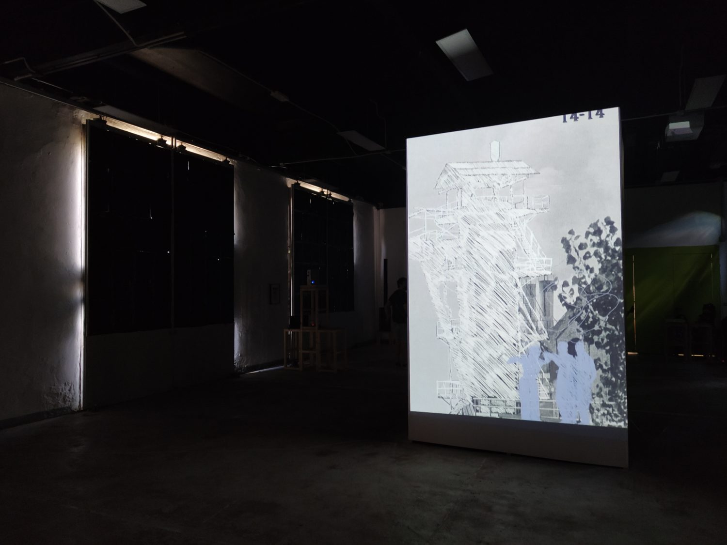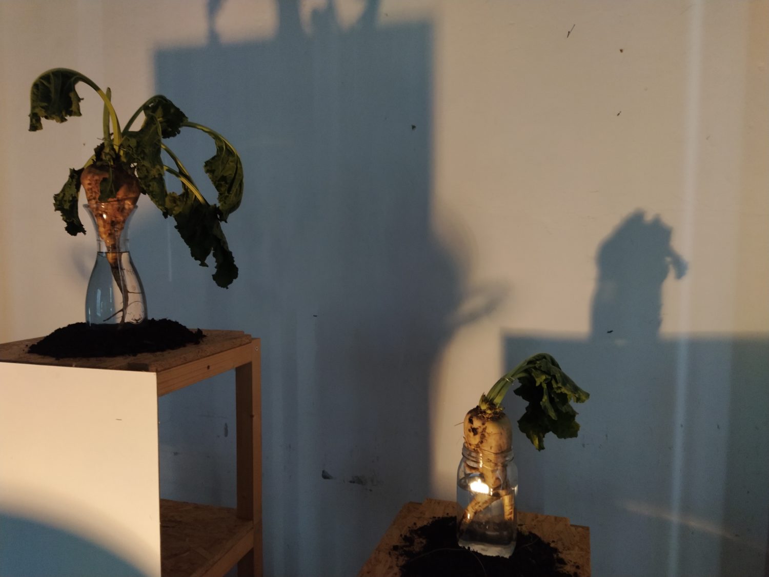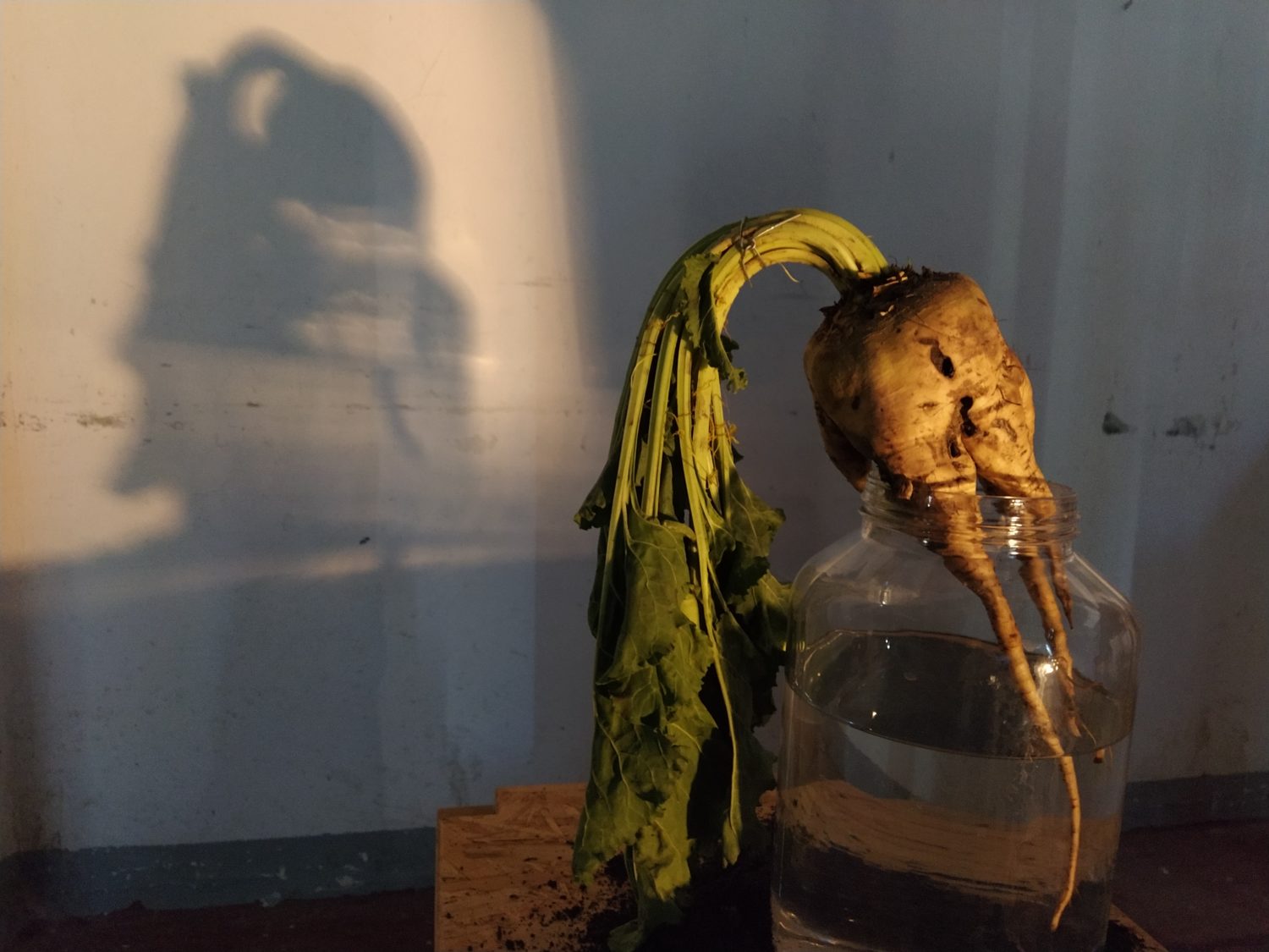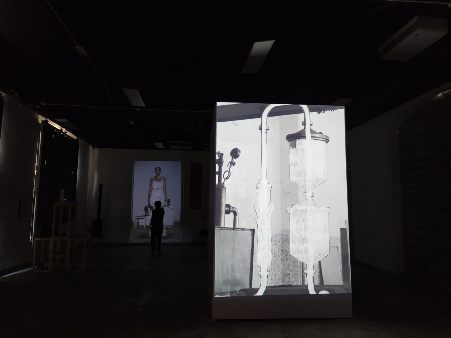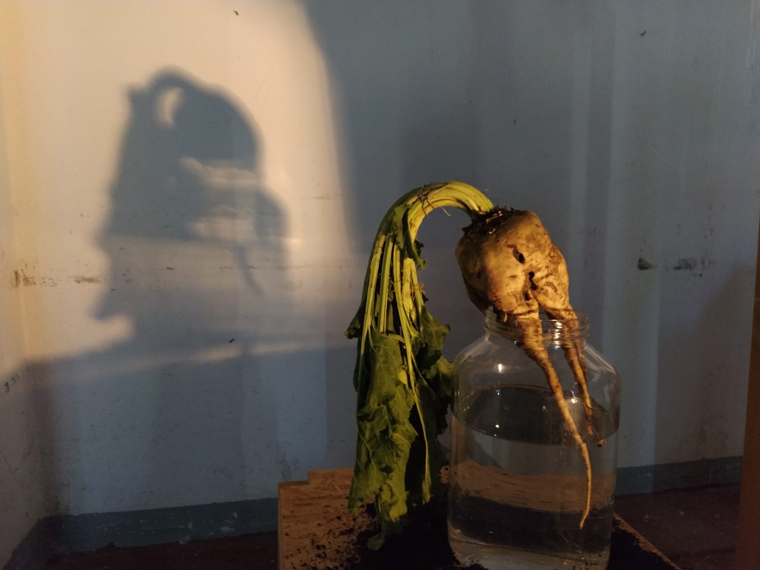 Una sirena scandisce l’entrata come scandiva l’inizio del lavoro, all’ingresso un cartellino con l’orario come quello degli operai. La sala è buia e le voci di chi ha lavorato negli zuccherifici testimoniano un passato più o meno remoto. Al centro della stanza, su un cuboide alto tre metri e costruito per l’occasione, viene mostrato il crollo di una parte della ex distilleria di Tresigallo attraverso immagine storiche che nel riavvolgersi ne mostrano, in un cortocircuito temporale, anche la costruzione. Sulle due pareti opposte della stanza diventa protagonista la barbabietola, da una parte la costruzione, dall’altra l’installazione, da una parte il video dall’altra la scenografia. Un dialogo tra pareti opposte che diventa un dialogo con la storia, un dialogo che sprigiona ricordi anche in chi ha lavorato negli zuccherifici. L’importanza dell’acqua e del lavaggio nel processo di trasformazione in zucchero viene riconosciuto come elemento fondante da ex operai passati a vedere la mostra. Sul lato opposto del cuboide un’altra proiezione racconta la costruzione e la decostruzione degli zuccherifici, ciò che rimane sono le facce degli operai, di chi ci lavorava e ha visto, in molti casi, nascere e morire gli stabilimenti.