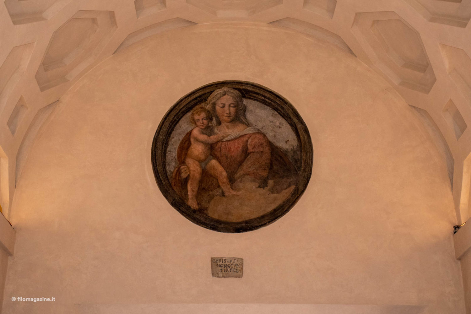 Nell’atrio d’ingresso di Palazzo Naselli-Crispi, nel bellissimo androne voltato a botte, si conserva ancora oggi l’unico affresco originario cinquecentesco, un tondo affrescato raffigurante una Madonna con bambino. L’affresco è di Girolamo da Carpi ed è stato eseguito con modi che risentono fortemente dell’influenza di Correggio, uno dei suoi riferimenti prediletti degli anni giovanili trascorsi a Bologna.