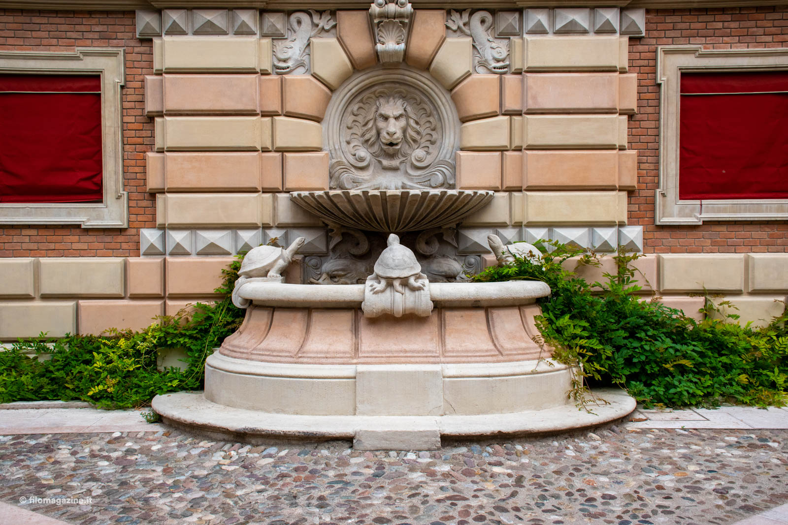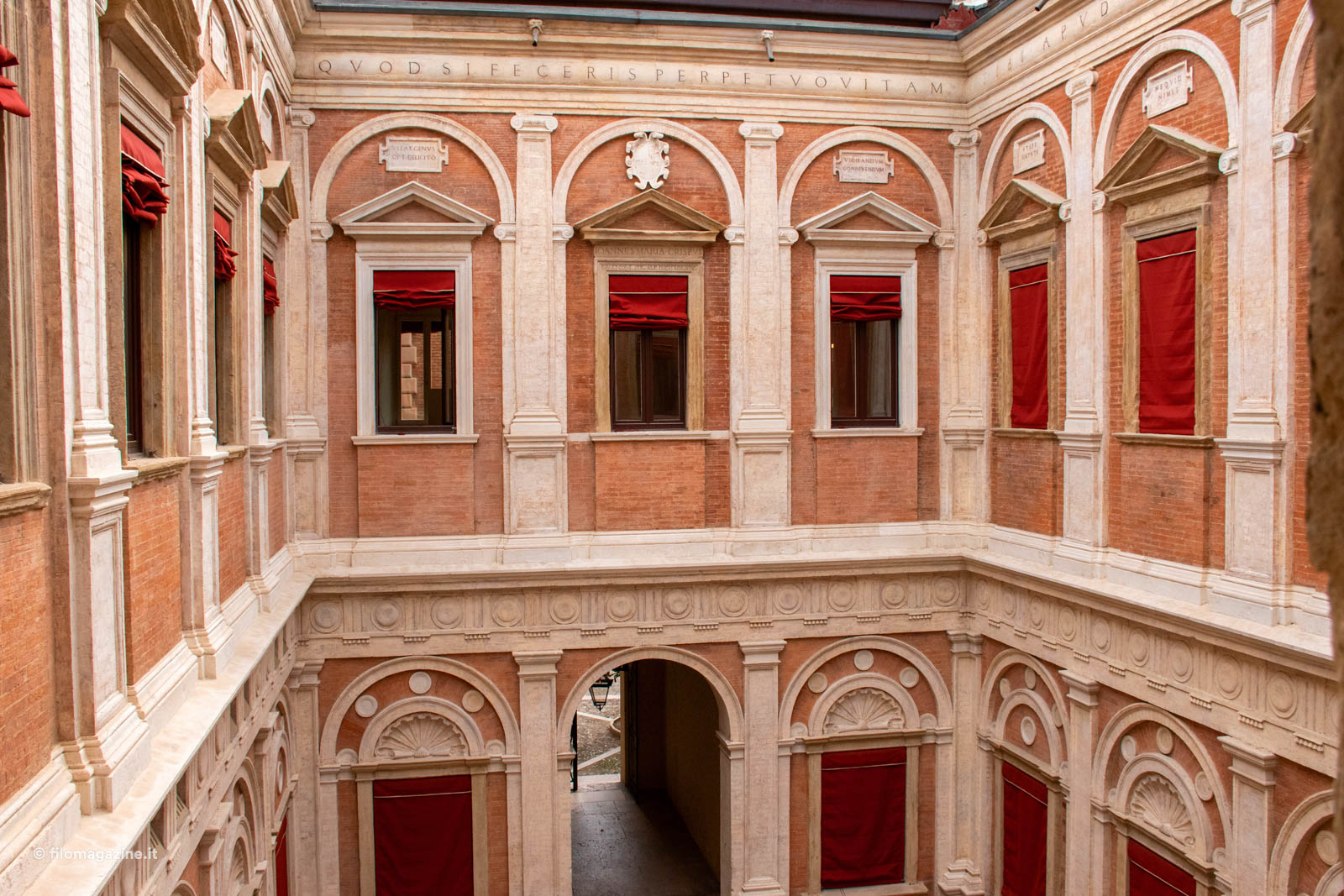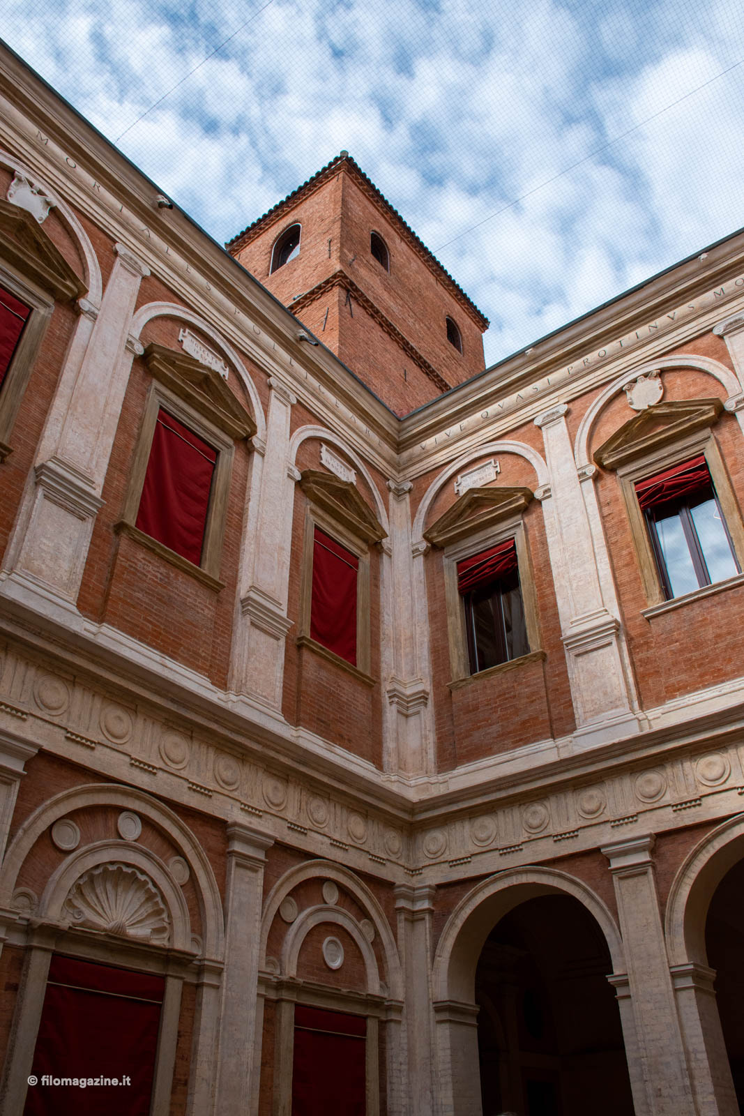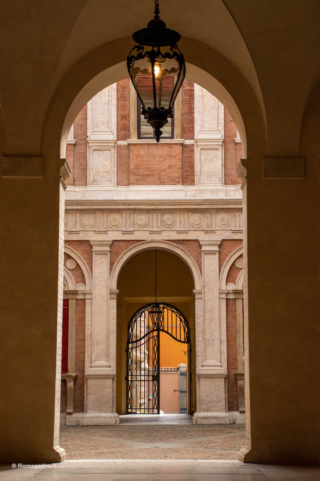 Il cortile interno di Palazzo Naselli-Crispi è unico nel suo genere a Ferrara: di forma rettangolare, presenta cinque arcate nei lati lunghi e tre nei lati corti, disposte su due ordini sovrapposti. L’ispirazione al Teatro Marcello di Roma è lampante. L’aspetto più intrigante di questo piccolo cortile interno è che le esigue dimensioni sono alla vista incredibilmente dilatate da una sapienza illusionistica e da una ricchezza di motivi architettonici del tutto inconsuete per Ferrara. Girolamo da Carpi aveva una conoscenza approfondita di Bramante, Raffaello e Antonio da Sangallo il Giovane: tali influenze sono state determinanti nella progettazione di questo spazio, ulteriormente arricchito, su richiesta della committenza, da motti filosofici latini riportati sugli ornati tabellari e sulle cornici della facciata e del cortile.
