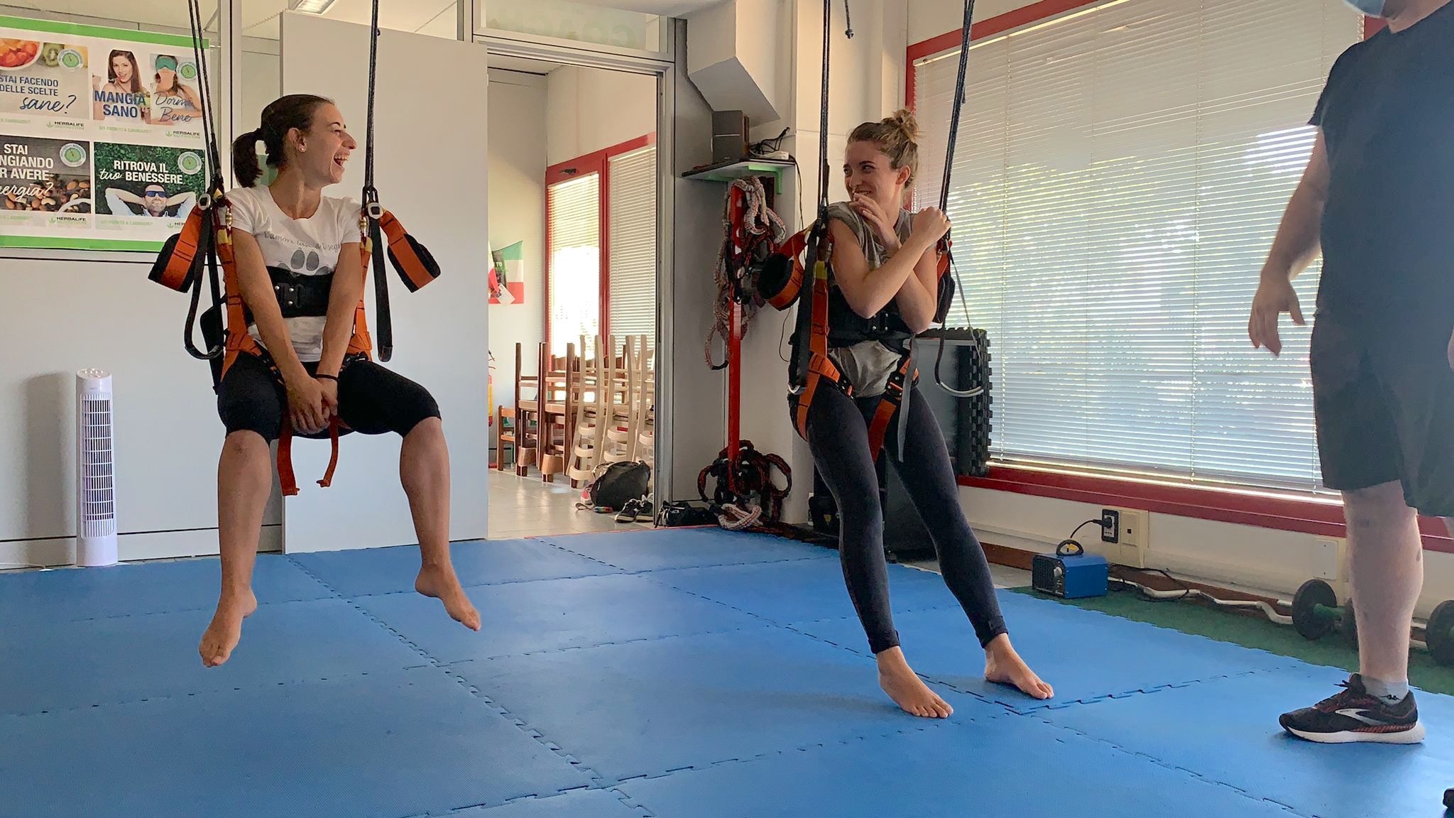 A piedi nudi sono salita sul tatami, ho preso confidenza con gli strumenti del mestiere e, soprattutto, con il mio corpo. Stefano e la sua collega Layla Tartari mi hanno guidata, spronata, sostenuta fisicamente, ma anche mentalmente quando davanti al primo esercizio completamente senza gravità ero convinta di non farcela. Mi sono servite forza e concentrazione, equilibrio e determinazione per arrivare alla fine della lezione, finalmente consapevole di ogni muscolo del mio corpo. Alla fine della lezione le mie spalle erano più aperte, la mia schiena più dritta, i miei piedi aderenti al terreno.