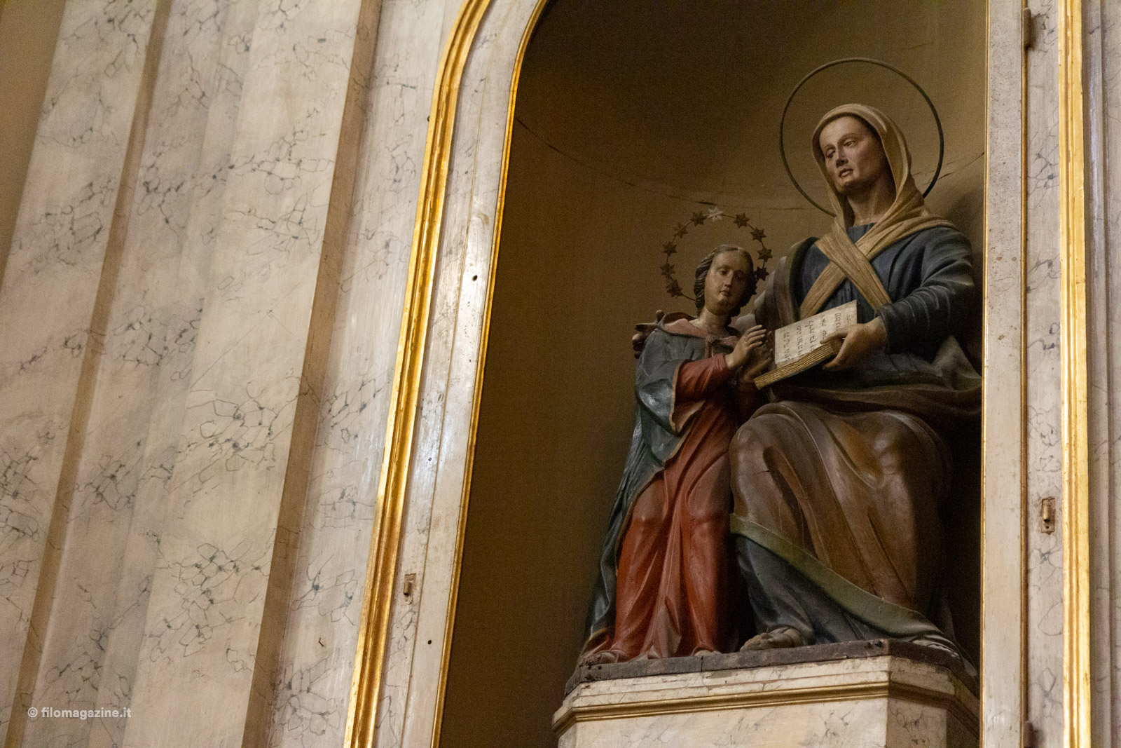 Il fianco della chiesa prospetta il sagrato dell’antica Chiesa di Sant’Anna, trecentesca. Nel 1800 venne soppressa e parte dell’Ospedale adibito ad uso civile, così San Carlo venne dedicato anche a Sant’Anna, la cui statua passò da un edificio all’altro, dove tuttora si trova sul lato rivolto verso l’omonima piazza. Durante il pontificato di Pio IX nel 1857 San Carlo subì un primo restauro e nel 1875 vennero aggiunti i gradini di ingresso per raggiungere il livello strada che nel frattempo era stato abbassato.