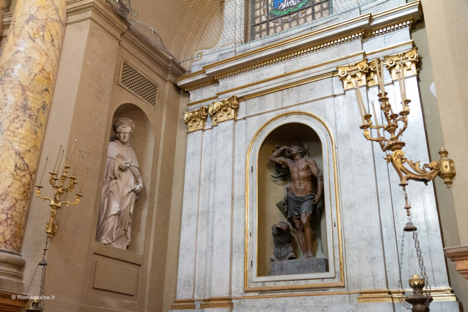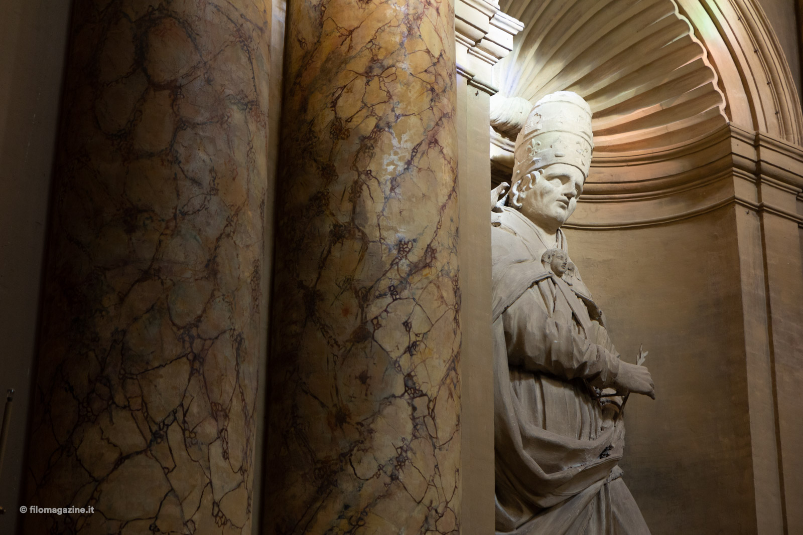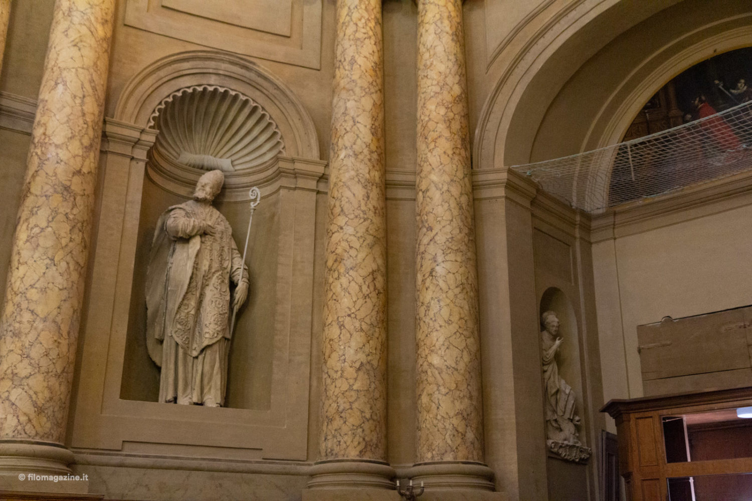 San Carlo ha subito in totale tre restauri: il primo negli anni Duemila sulla facciata, fortemente opacizzata dall’inquinamento. Un restauro guidato dalla Sovrintendenza diretta da Carla Di Francesco e l’architetto Andrea Alberti. Una prima indagine venne fatta sul colore della facciata, ripristinato come in origine con l’attuale arancione e le statue bianche. Sempre durante quel restauro vennero rimosse incrostazioni ed eseguiti laser scanner in collaborazione con l’Università di Ferrara per avere informazioni volumetriche della facciata.