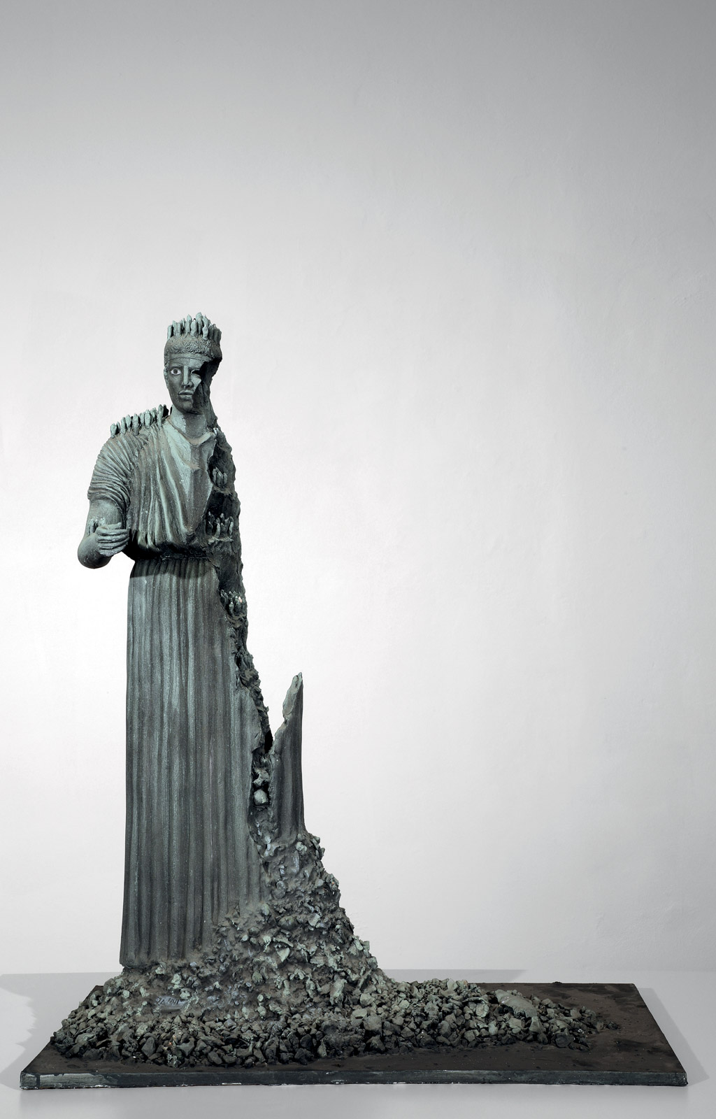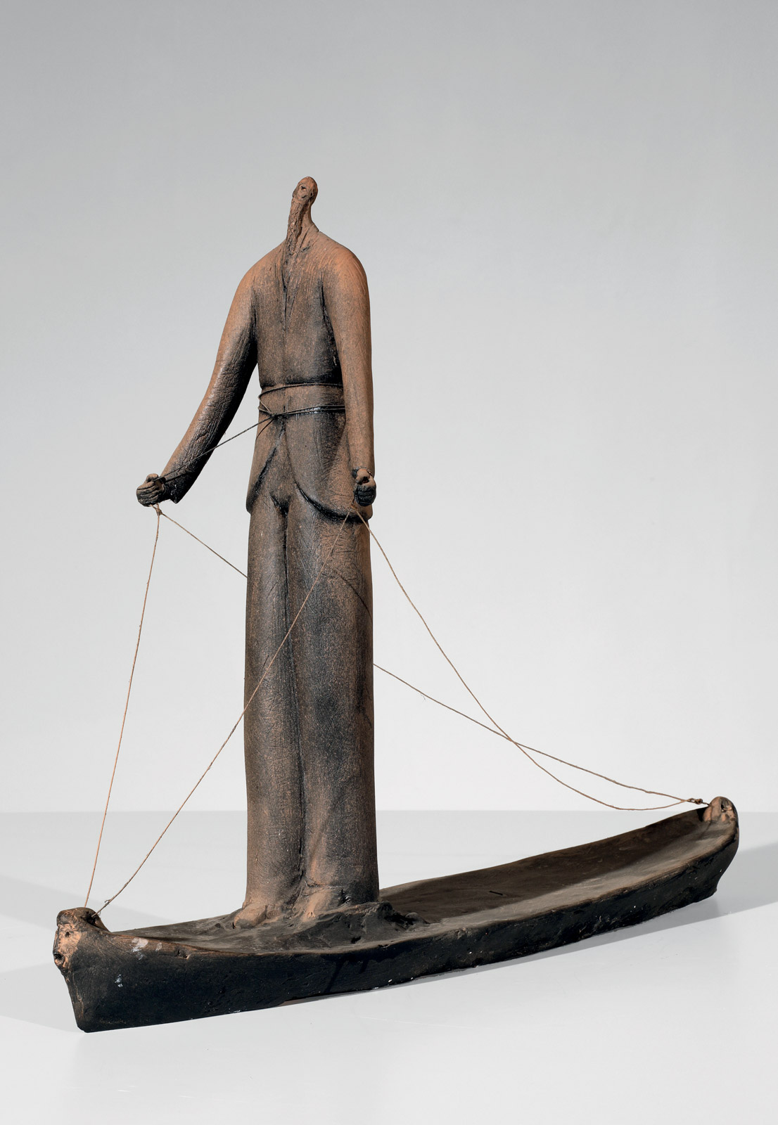 La potenza visiva delle sue opere invita ad abbandonare per un breve arco di tempo la realistica quotidianità e addentrarci in un mondo parallelo e atemporale. Zanni è un eccellente esploratore di sogni e questa componente inconscia inderogabile per il lavoro creativo, attinge sia dalla fantasia sia dall’intuizione e ci apre a un mondo onirico. Al piano inferiore (sì, sto proponendo un percorso inverso, ma ogni tanto uscire dagli schemi è più che indicato) si trovano sculture di piccola-media dimensione, con dei chiari riferimenti al mondo greco antico e mitologico. Una molteplicità di figure presenti come metafore del viaggio, del naufragio, dell’esilio, del confine impercettibile tra passato e presente. Una componente accomunante è la valigia a simboleggiare sì, il viaggio, ma può prestarsi altresì come contenitore di sogni, disillusioni, progetti, incontri.