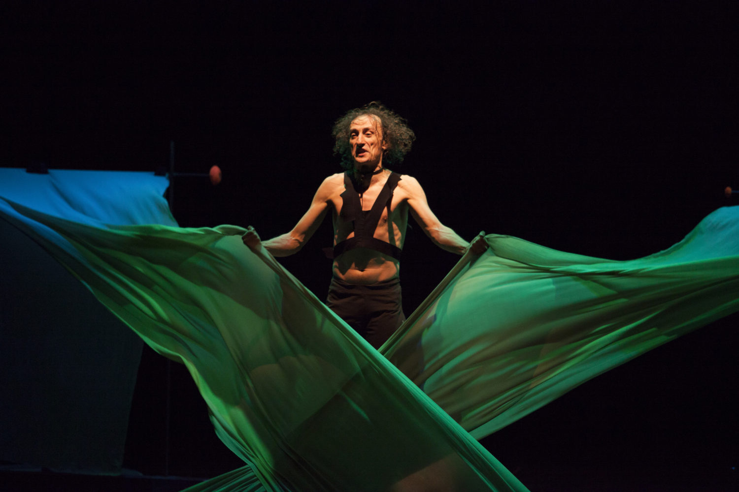 M: Insieme ad Antonio volevamo fare una trilogia sulla civiltà numerica: il primo spettacolo era 7-14-21-28 e poi il secondo proprio Fratto_X. Durante la preparazione di questa serie, la civiltà numerica si è concretizzata in un attimo, quindi ci siamo fermati a due. Anelante che doveva chiudere questa trilogia, alla fine viaggia su un’altra dimensione. Personalmente ho lavorato sull’influenzamento, sul plagio della fantasia, facendo per due anni un lavoro di ricerca sull’immagine fotografica. Ho fotografato le luci in movimento sulle strade e l’ultimo tratto della ricerca è stato l’habitat per Fratto_X che sono due fasce di stoffa che stimolano un raggio luminoso; è una stoffa che sembra pelle e quando non è illuminata sembra luce, che dà forma a questi corpi antropomorfi, se vogliamo mostruosi, che cercano di influenzare l’altro. È un lavoro che parla per appunto di plagio.